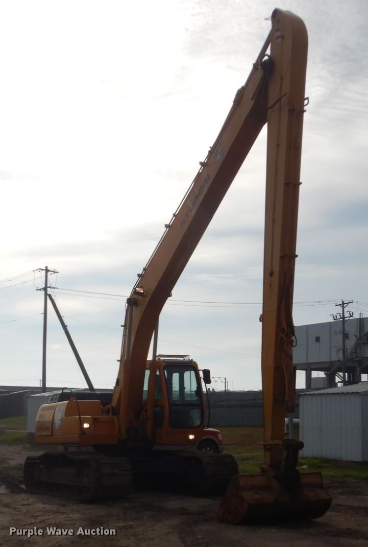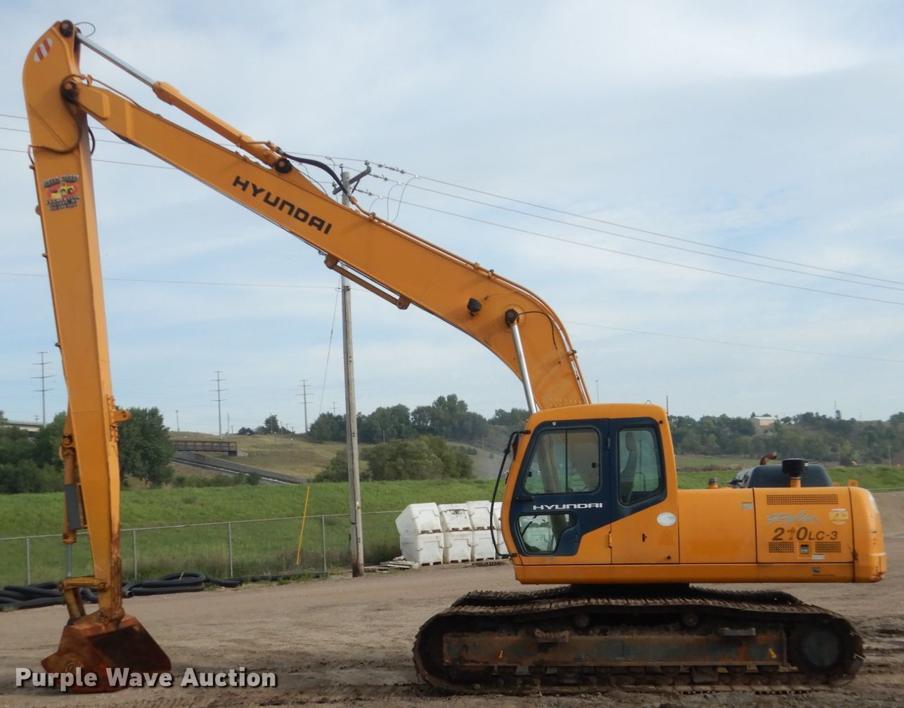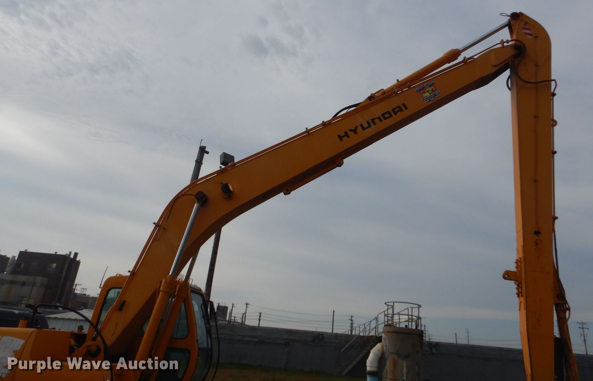 Purple Wave is selling a used Hydraulic Excavator in Minnesota. This item is a 1998 Hyundai Robex 210LC-3 long reach excavator with the following: 2,279 hours on meter, Cummins six cylinder diesel engine, Hydrostatic transmission, Enclosed cab, AC and heat, Standard boom, 25'8" stick length, 60"W bucket, Weld-on cutting edge, 31.5"W steel triple grouser track pads, Serial EM01GJ11676