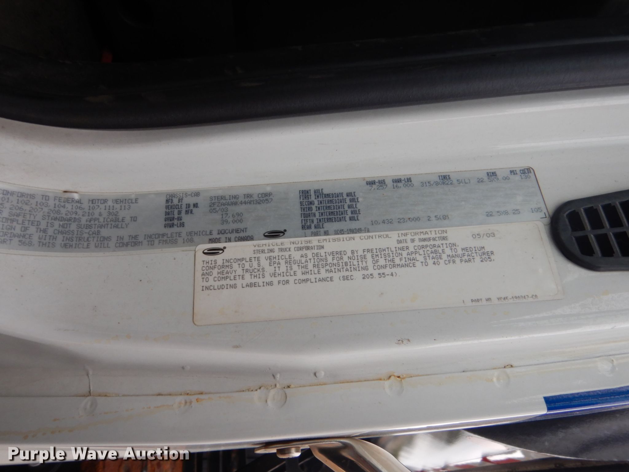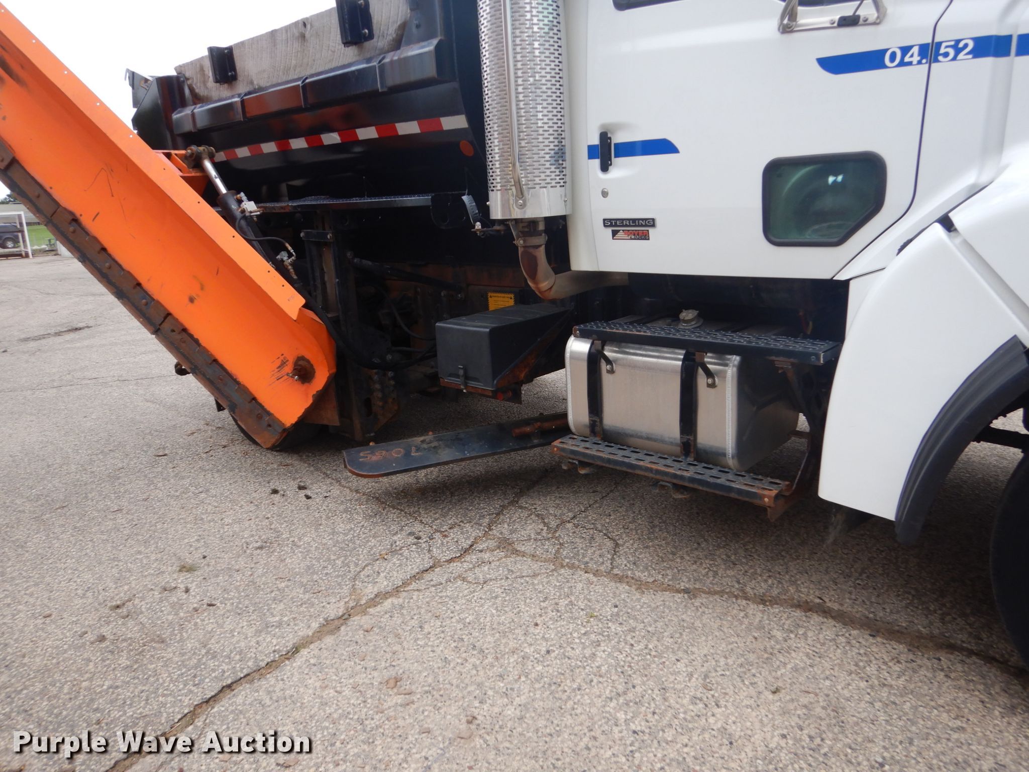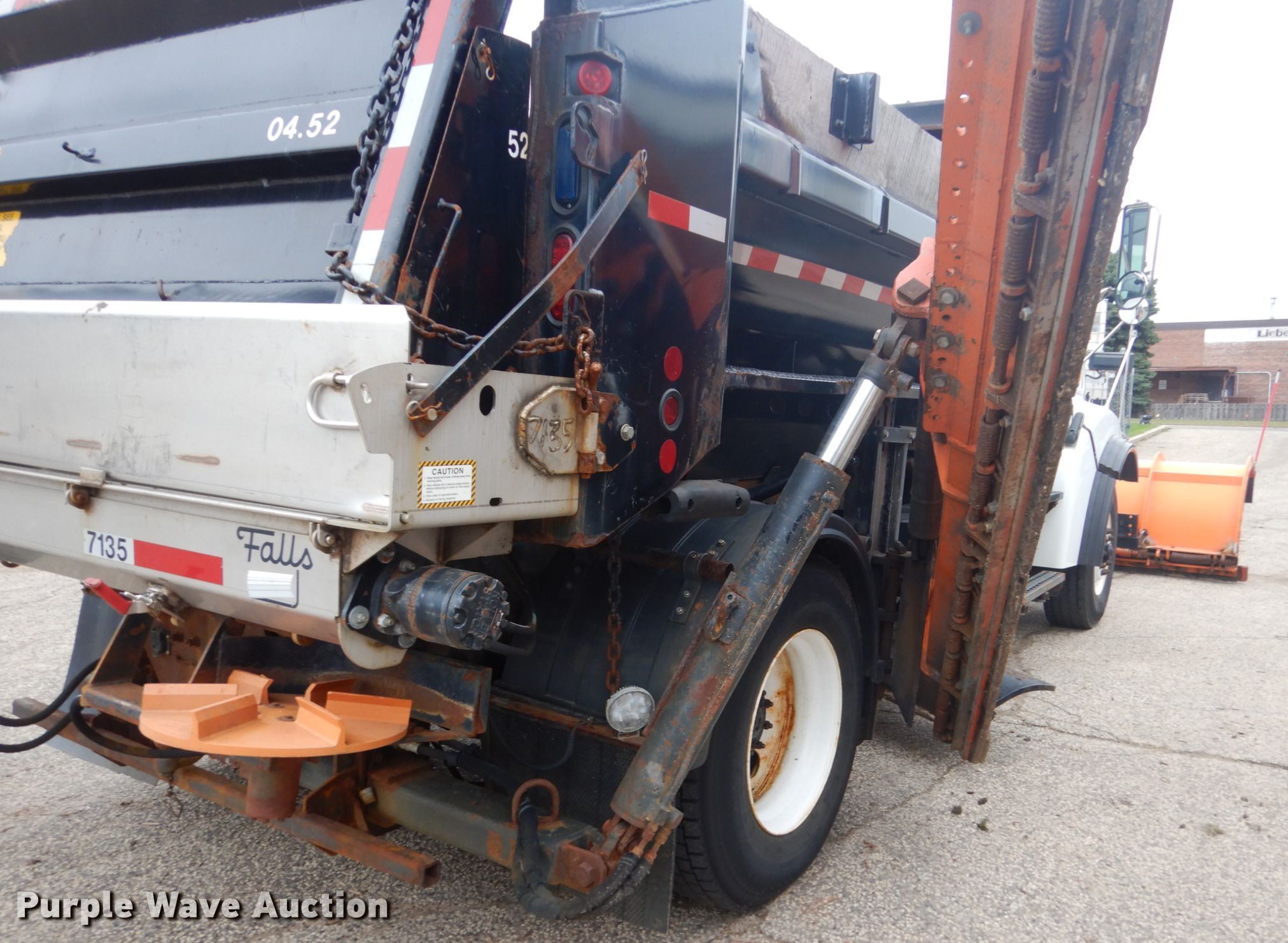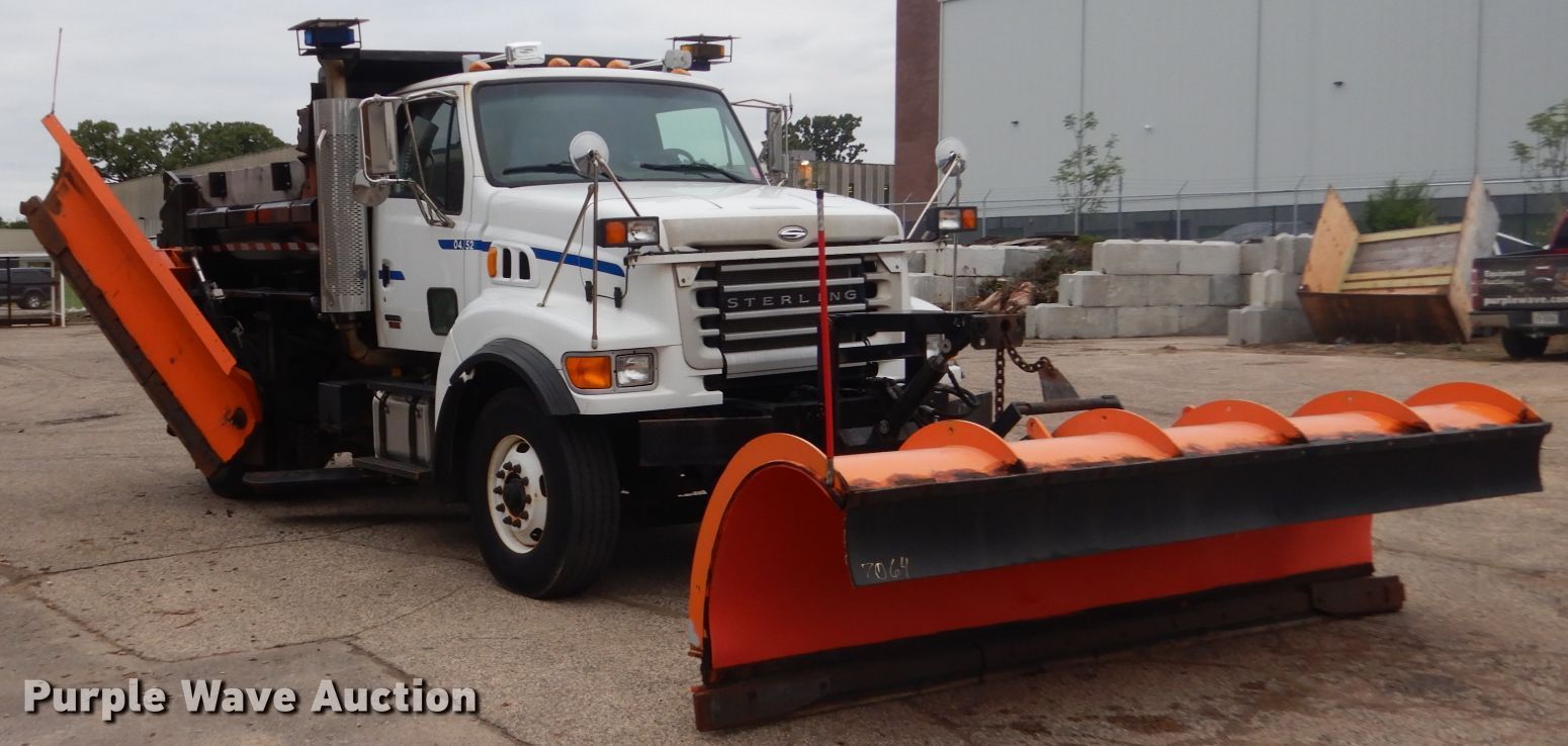 2004 Sterling L-Line dump truck. 35,709 miles on odometer, 3,309 hours on meter, Caterpillar 3126 7.2L L6 diesel engine Serial HEP33348, Automatic transmission, Single axle, Inter-axle differential lock, AC and heat, Cruise, Power windows, Heated mirrors, Front mounted PTO, 10'L x 96"W steel dump bed 42" side height, 10" side board height, Single ram hoist, Air operated end gate, Falls 1A2SD-6CDLMSS spreader, Monroe MPP44R12-ISTT 12'W snow plow, 9'W wing plow, 11'W mid-mounted snow plow, Automatic tire chains, Spring suspension, Air brakes, Automatic tire chains, 315/80R22.5 front tires, 11R22.5 rear tires, GVWR 39,000 lbs, FAWR 16,000 lbs, RAWR 23,000 lbs. Minnesota title. 2FZAAWAK44AM32057. 9600 Newton Ave S. Bloomington, MN 55431