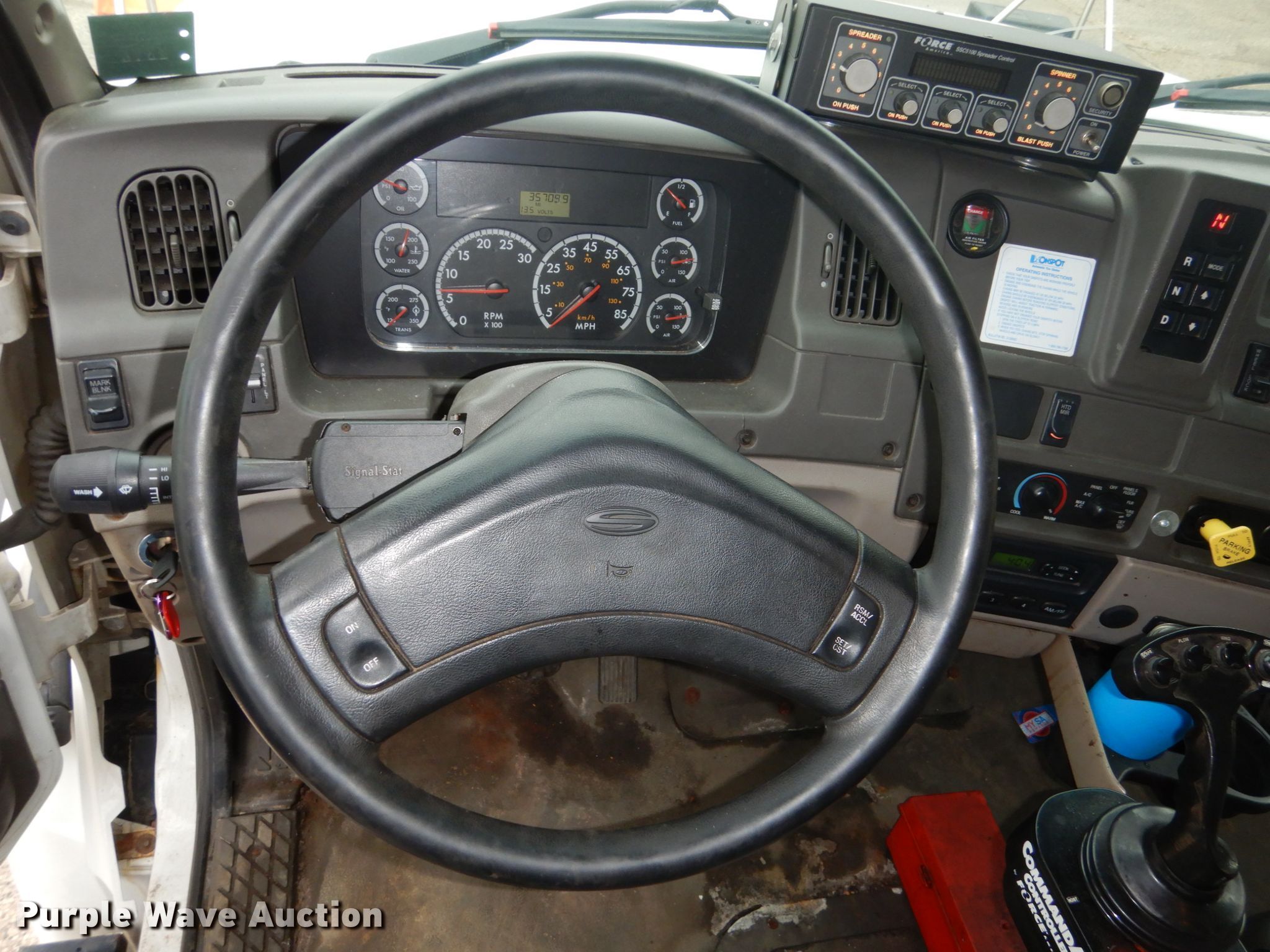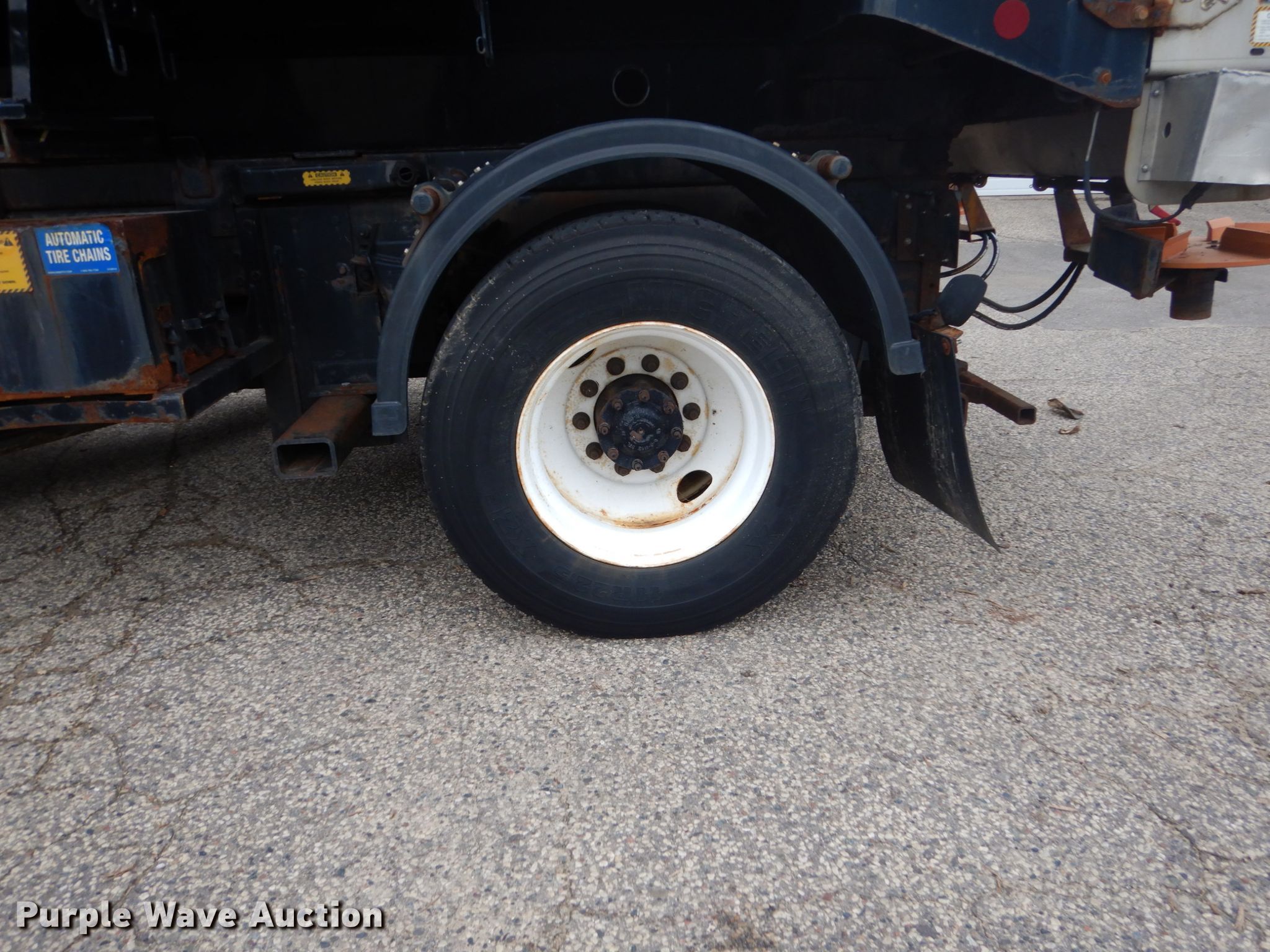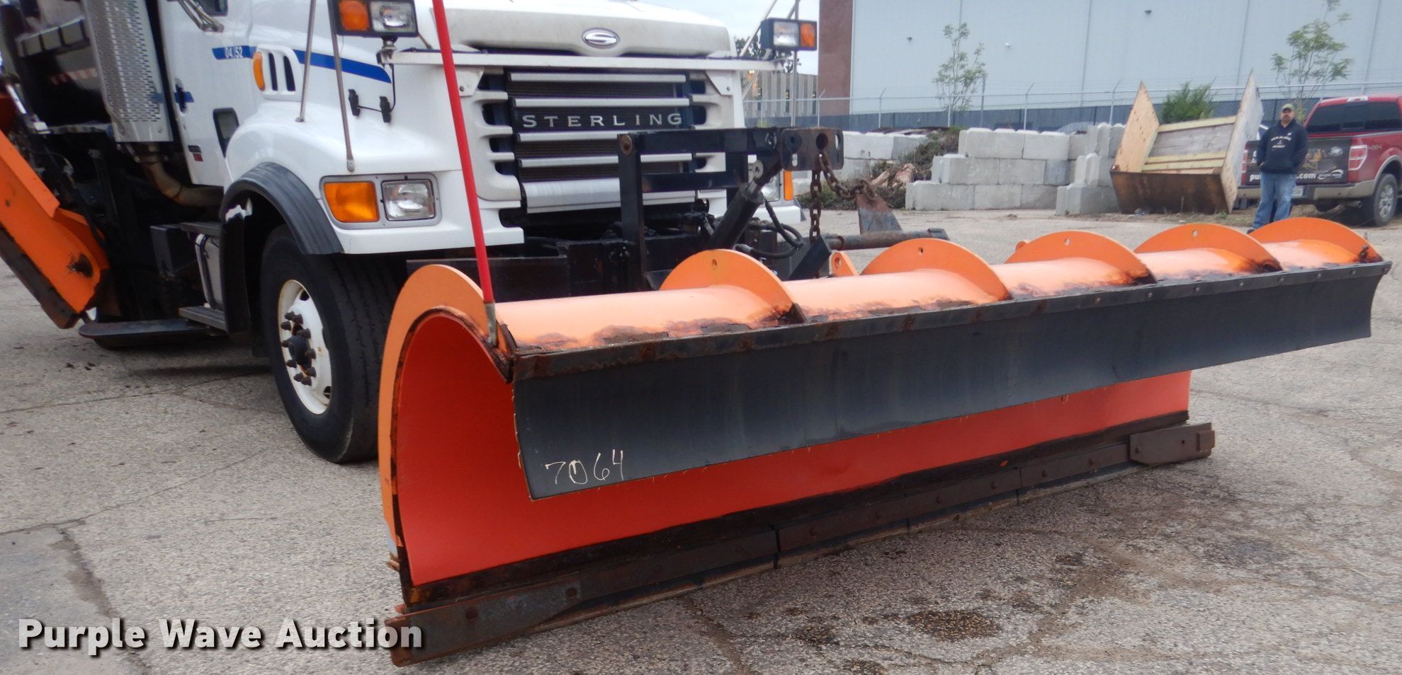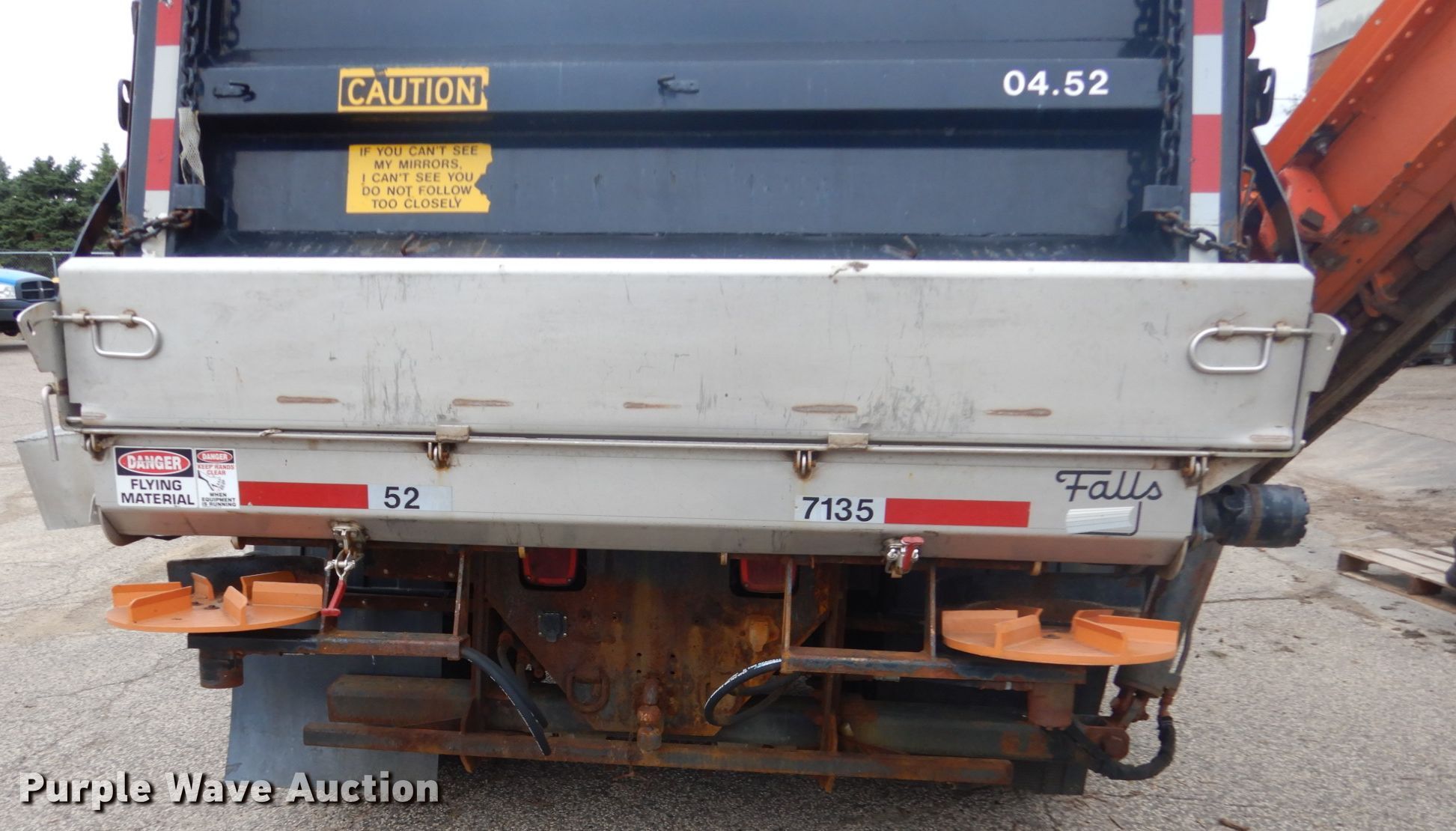 2004 Sterling L-Line dump truck. 35,709 miles on odometer, 3,309 hours on meter, Caterpillar 3126 7.2L L6 diesel engine Serial HEP33348, Automatic transmission, Single axle, Inter-axle differential lock, AC and heat, Cruise, Power windows, Heated mirrors, Front mounted PTO, 10'L x 96"W steel dump bed 42" side height, 10" side board height, Single ram hoist, Air operated end gate, Falls 1A2SD-6CDLMSS spreader, Monroe MPP44R12-ISTT 12'W snow plow, 9'W wing plow, 11'W mid-mounted snow plow, Automatic tire chains, Spring suspension, Air brakes, Automatic tire chains, 315/80R22.5 front tires, 11R22.5 rear tires, GVWR 39,000 lbs, FAWR 16,000 lbs, RAWR 23,000 lbs. Minnesota title. 2FZAAWAK44AM32057. 9600 Newton Ave S. Bloomington, MN 55431