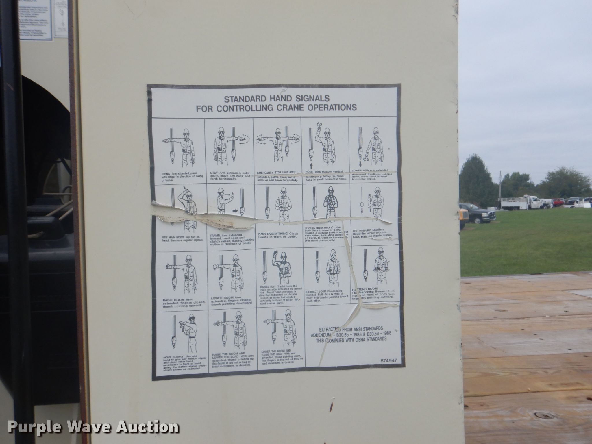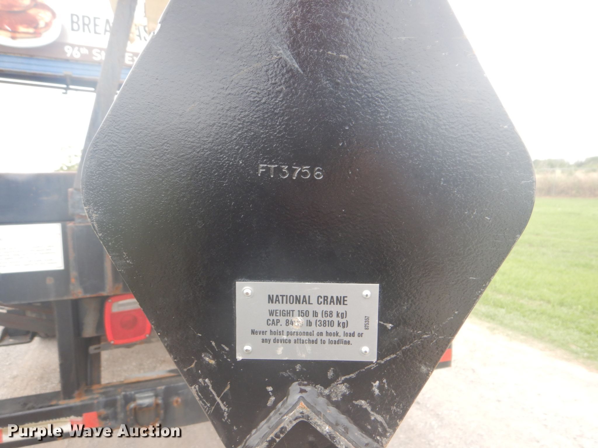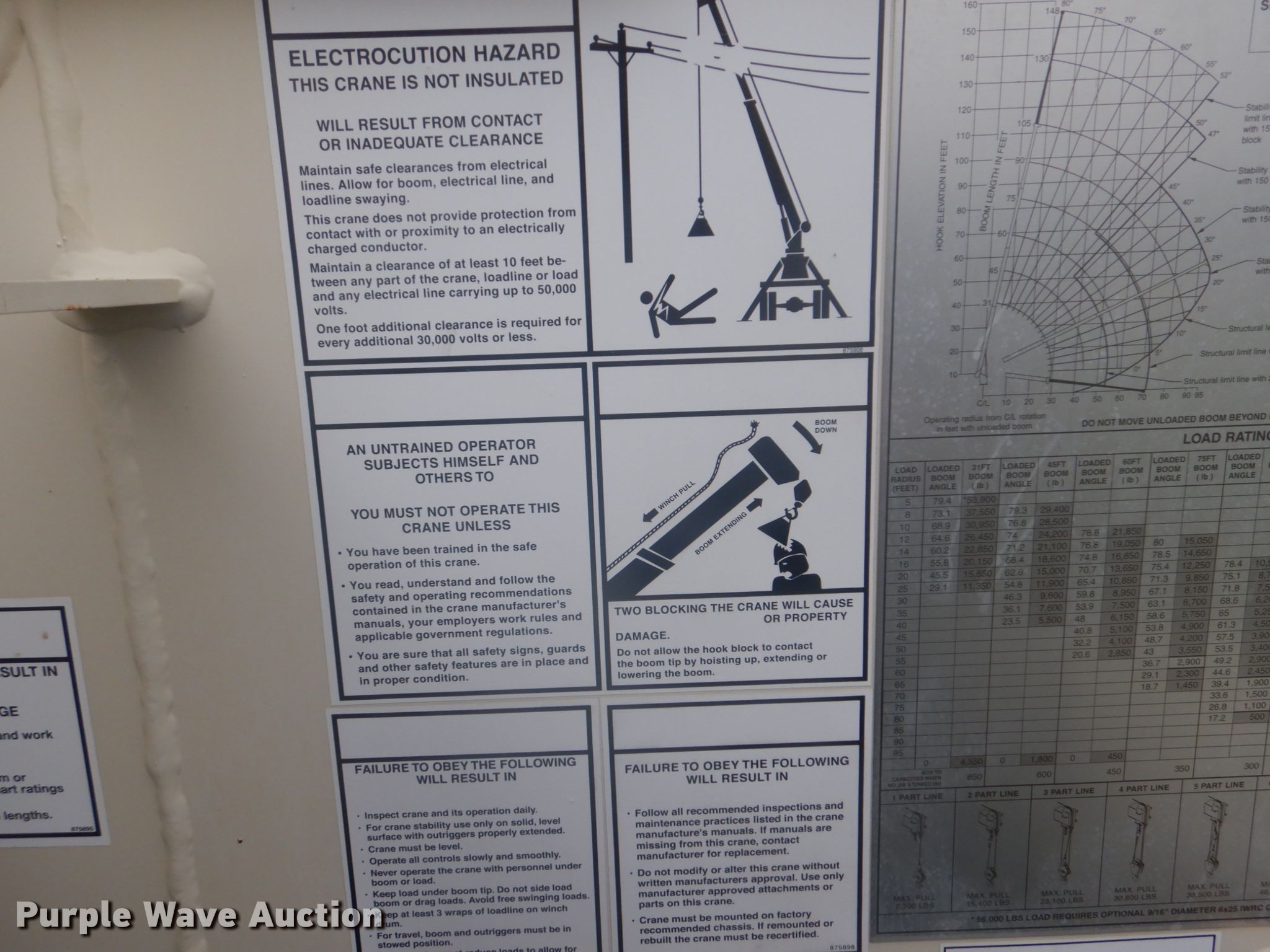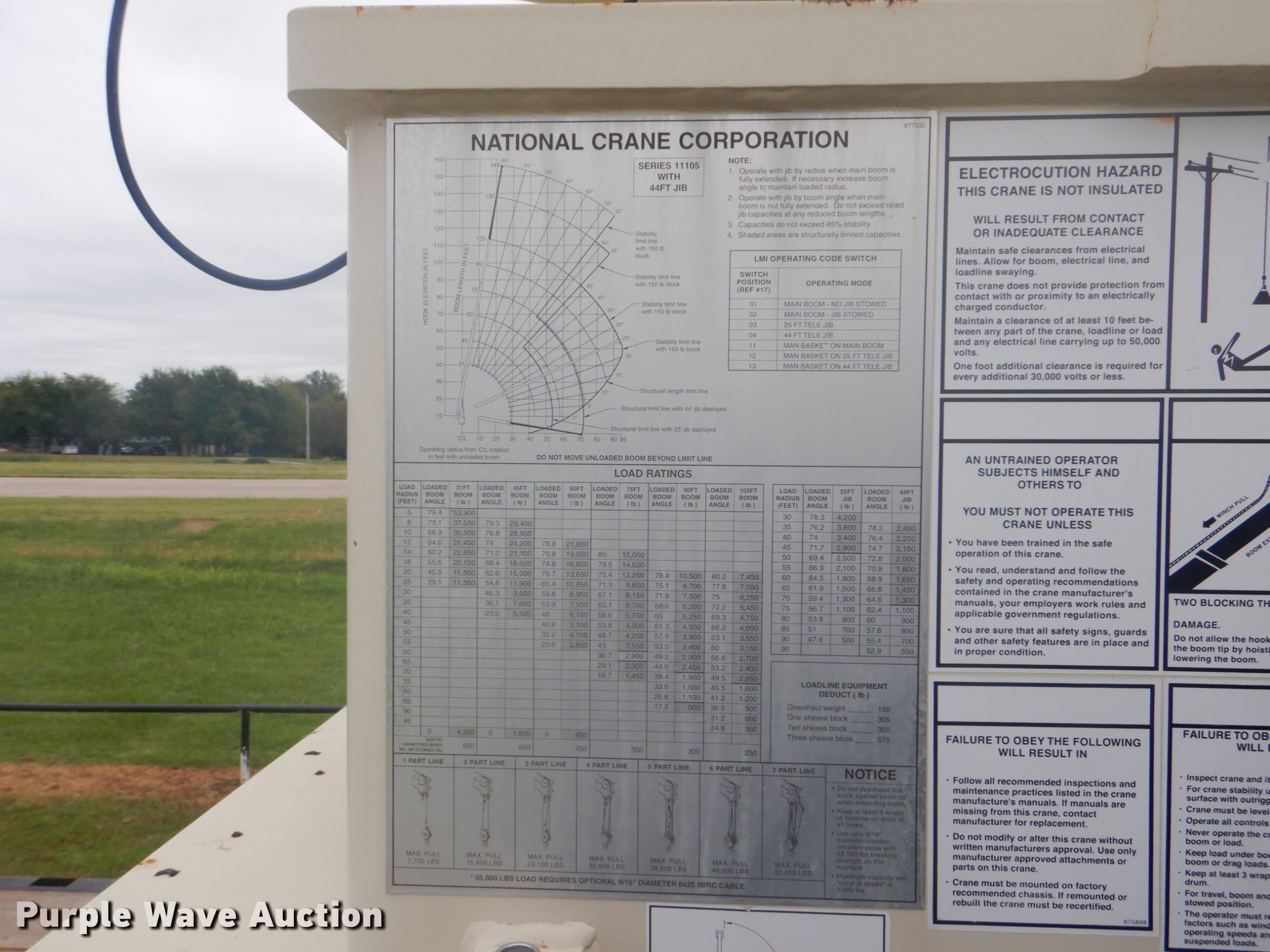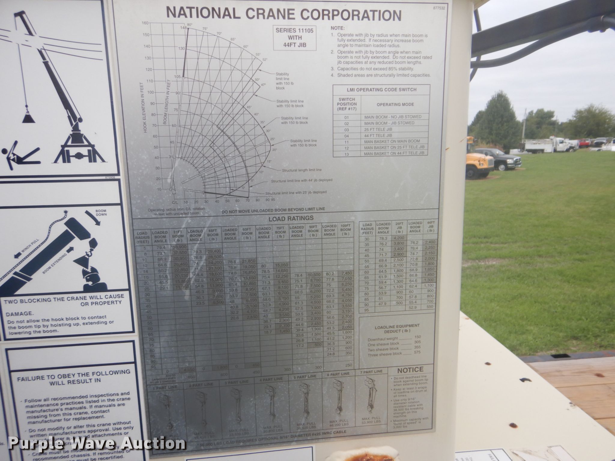 Purple Wave is selling a used Crane Truck in Oklahoma. This item is a 2007 Sterling L8500 crane truck with the following: 21,915 miles on odometer, 2,939 hours on meter, Caterpillar C7 7.2L L6 diesel engine, Eaton Fuller eight speed manual transmission, Tandem axle, Inter-axle differential lock, AC and heat, Knapheide PVMNAT-220D flatbed, 22'L, Serial 20061117-0046054, National Crane 1100 knuckle boom crane, 105' boom length, Four section boom, 28 ton maximum lift capacity, 161" maximum lift height, 44' jib, Ground boom controls, 84,000 lbs crane block, Lift chart, Spring suspension, Air brakes, Dunlop 11R22.5 tires, GVWR 47,500 lbs