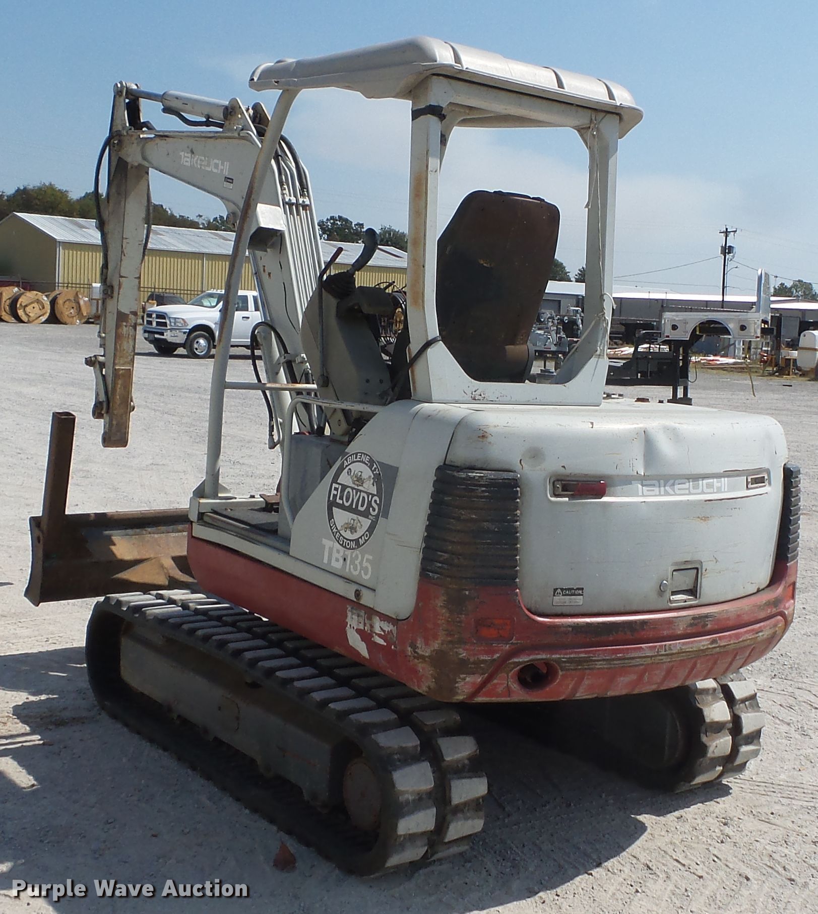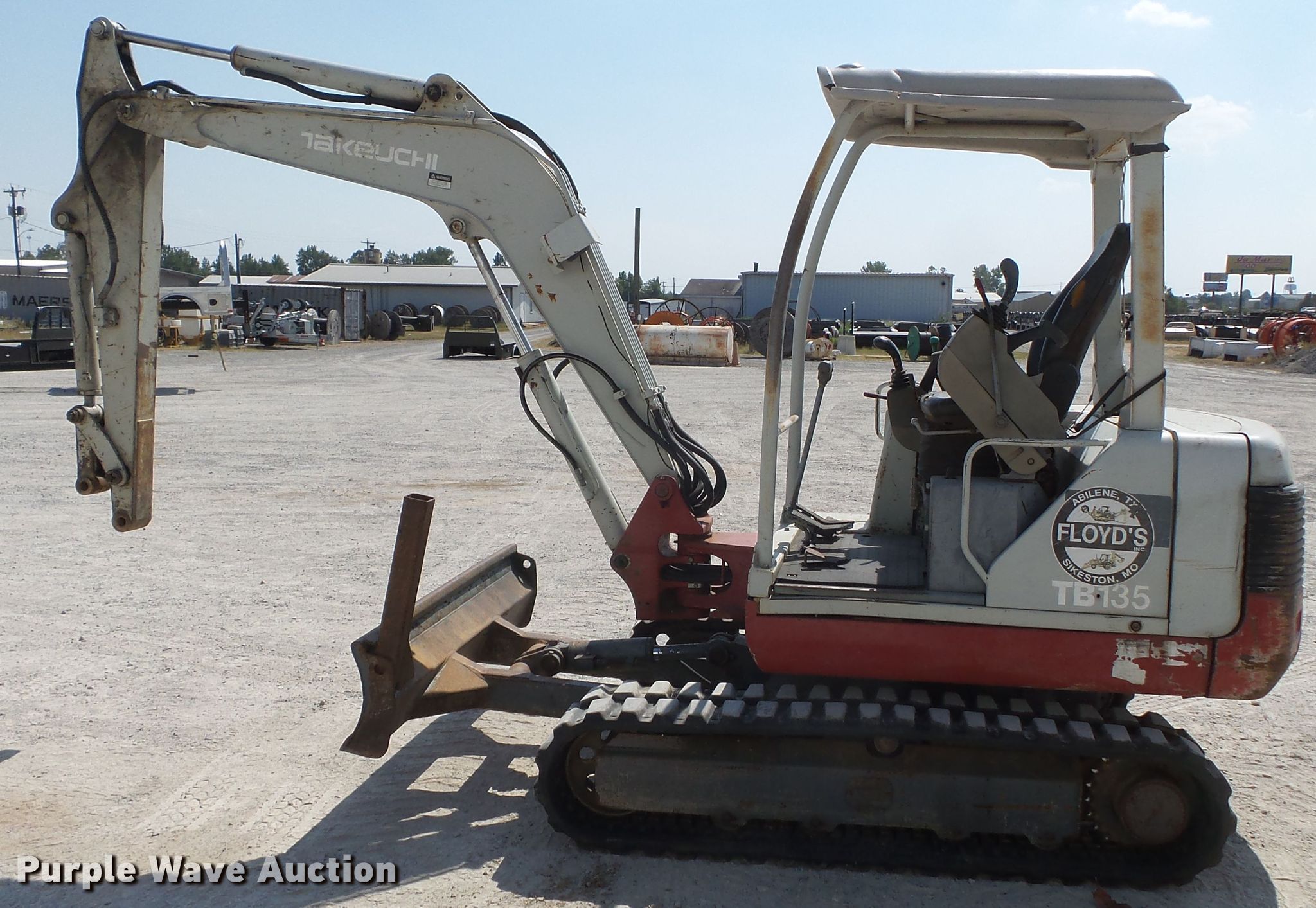 Purple Wave is selling a used Mini Excavator in Missouri. This item is a 2005 Takeuchi TB135 mini excavator with the following: 5,156 hours on meter, Yanmar 3TNV88-Q 1.642L three cylinder diesel engine, 21.3 kW, Two speed hydrostatic transmission, OROPS, Auxiliary hydraulics, Pattern changer, 64"W backfill blade, Swing boom, 62" stick length, 13"W rubber trucks, Serial 13515190, Unit# E711