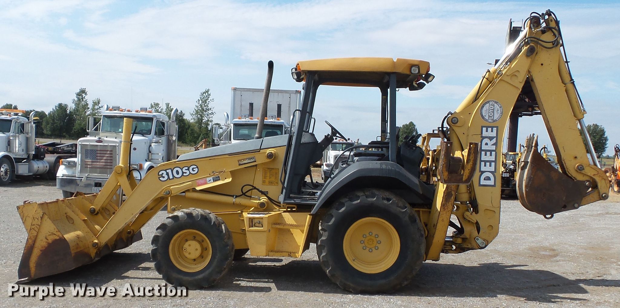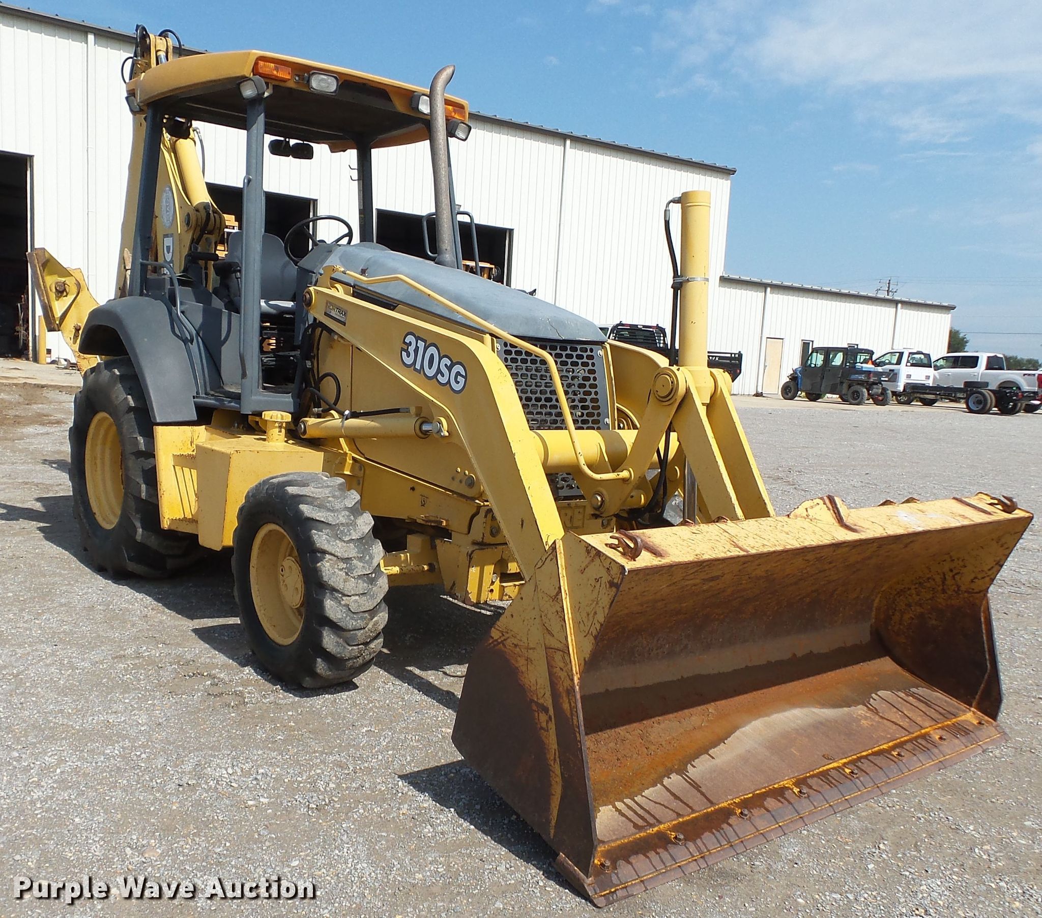 Purple Wave is selling a used Tractor Loader Backhoe in Missouri. This item is a 2005 John Deere 310SG backhoe with the following: 3,092 hours on meter, John Deere 4045TT089 4.5L four cylinder diesel engine, 69 kW, Shuttle shift transmission, 4F-4R gears, Four wheel drive, Differential lock, OROPS, Pilot backhoe controls, John Deere AT308080 93"W loader bucket, 1.3 cu.yd. capacity, Bolt-on cutting edge, Extendable stick backhoe, Tag 18"W bucket, (4) teeth, 12.5/80-18 front tires, 19.5-24 rear tires, Serial T0310SG944223, Unit# E728
