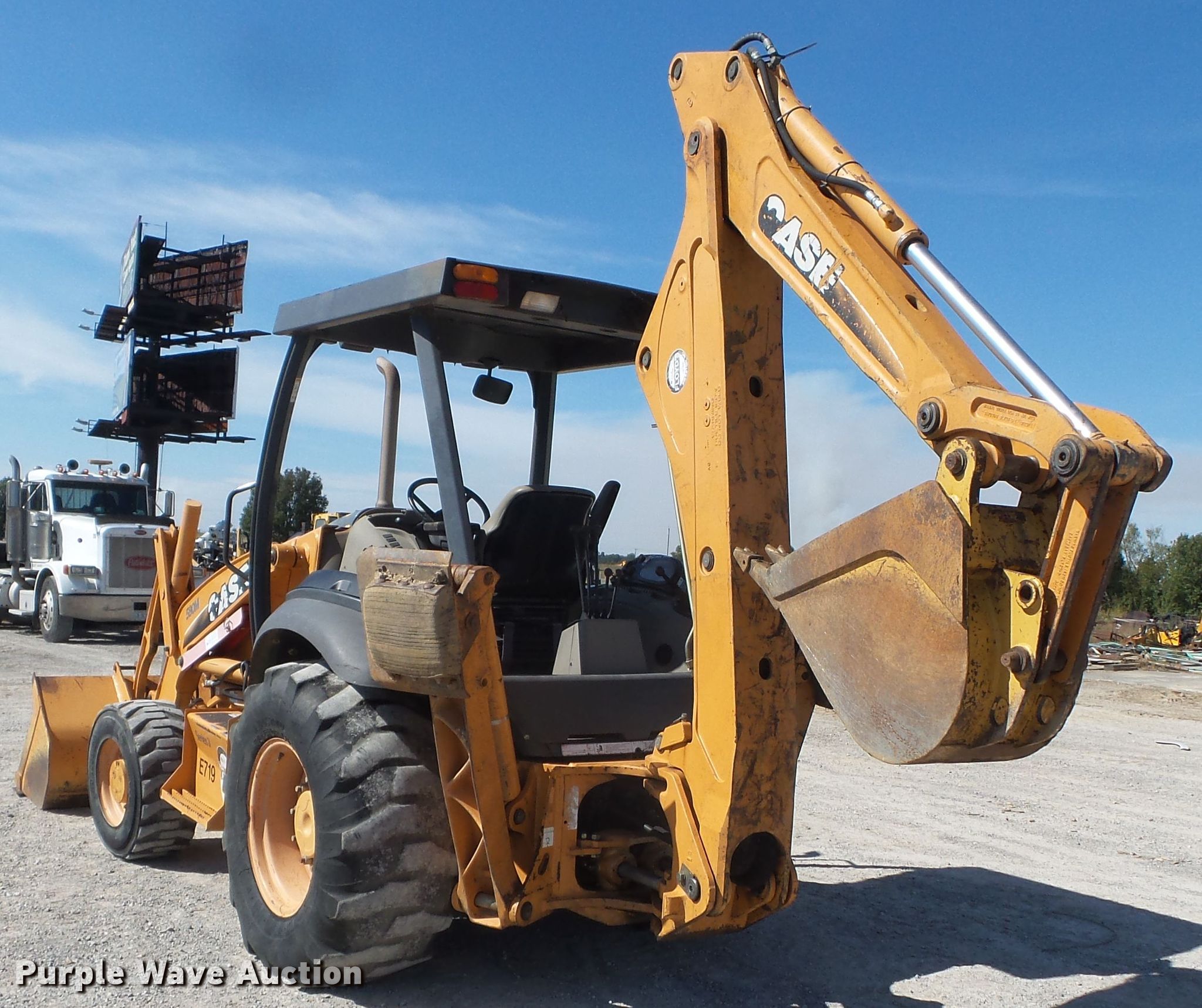 Purple Wave is selling a used Tractor Loader Backhoe in Missouri. This item is a 2008 Case 580M Series 3 backhoe with the following: 1,196 hours on meter, Case 445T/M3 4.5L four cylinder diesel engine, 84 HP, Shuttle shift transmission, 4F-4R gears, Four wheel drive, OROPS, Three stick backhoe controls, Foot control, Case 83368702 81"W loader bucket, Bolt-on cutting edge, Case 376384A1 18"W backhoe bucket, (4) teeth, 12-16.5 front tires, 19.5-24 rear tires, Serial N8C500855, Unit# E719
