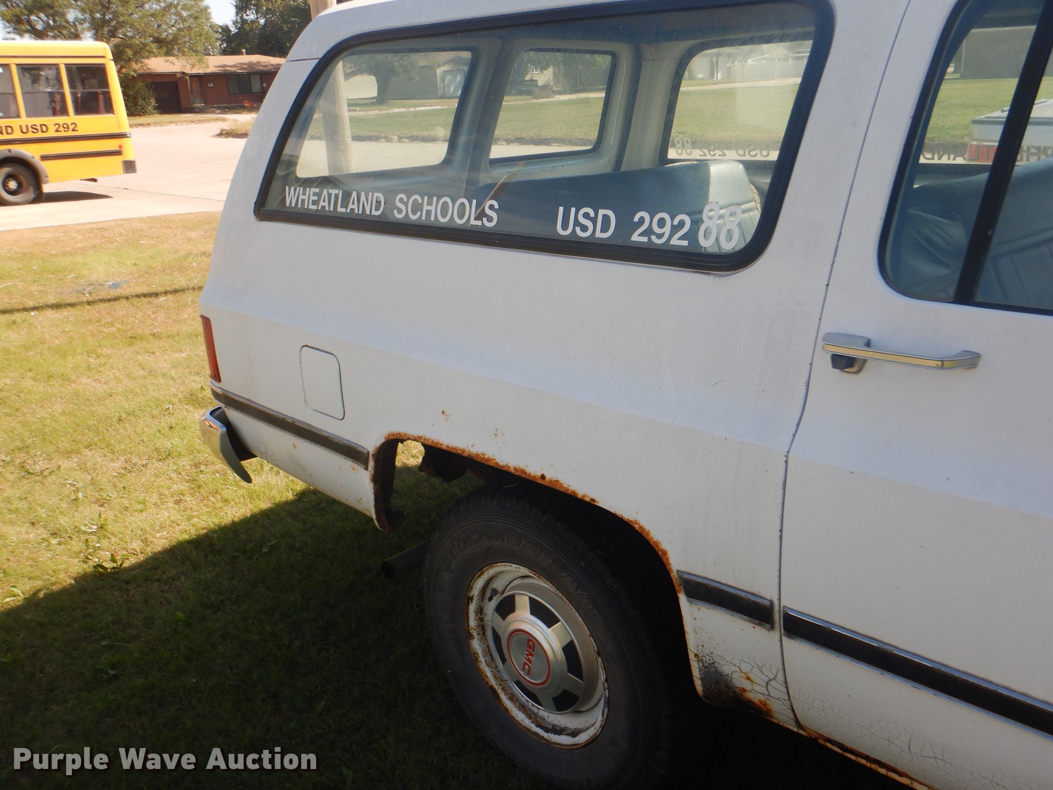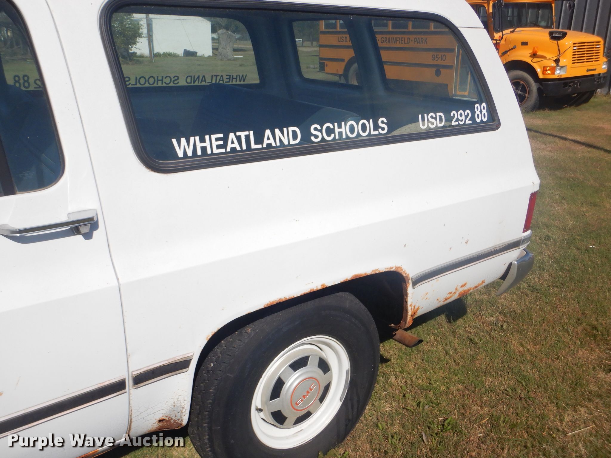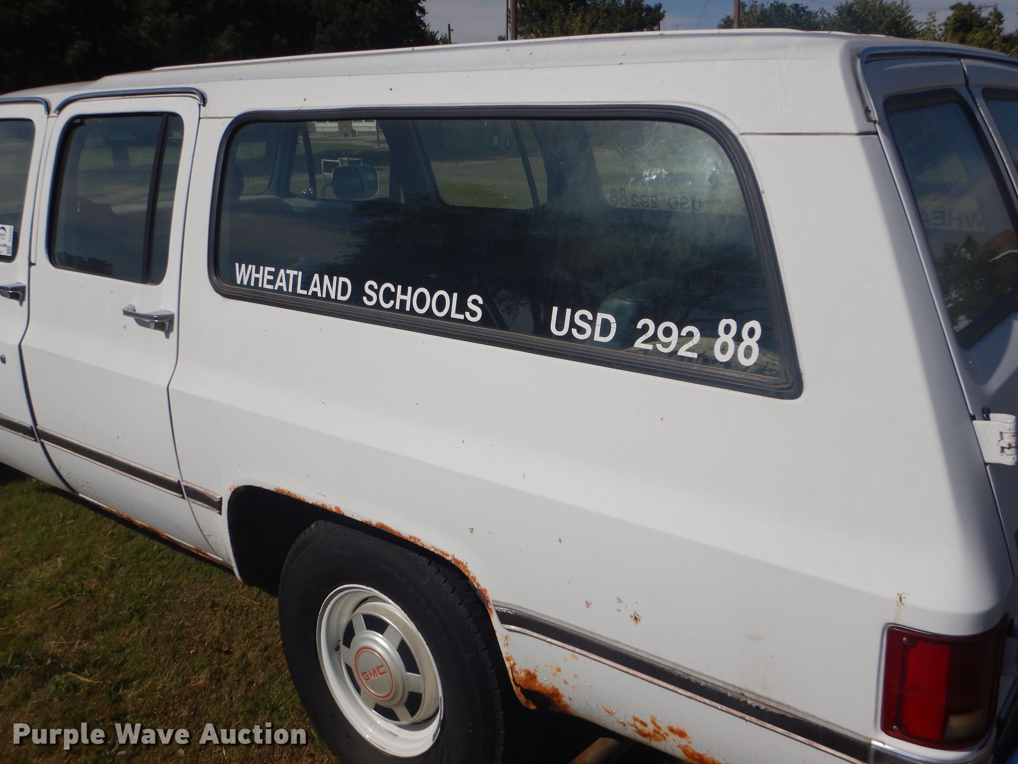 1988 GMC Suburban 2500 SUV. 23,749 miles on odometer, 6.2L V8 OHV 16V diesel engine, Automatic transmission, AC and heat, 235/85R16 tires, Engine starts hard Possible glow plug issue, AC may need recharged. Kansas title. 1GKGR26JXJF521018. Wheatland Grade School. 436 Elm. Grainfield, KS 66737