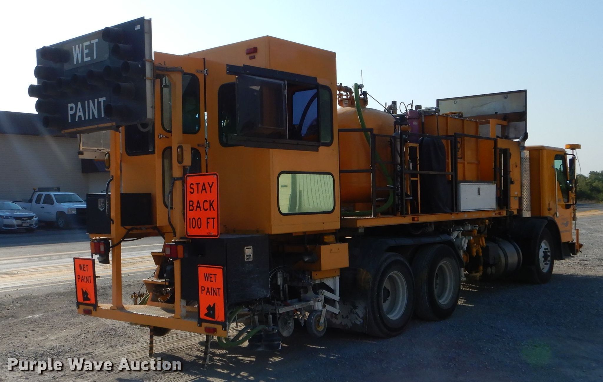 Purple Wave is selling a used Flat Bed Truck in Missouri. This item is a 2004 Sterling Condor paint striping truck with the following: 186,438 miles on odometer, 2,970 hours on meter, Miles and hours may vary, unit still in use, Cummins ISL 8.9L L6 diesel engine, Automatic transmission, Tandem axle, Inter-axle differential lock, AC and heat, Cruise, Power windows, Heated mirrors, Backup camera, PTO, MB paint striping bed, Dual operator stations, (2) 400 gallon paint tanks, 6,000 lbs bead tank, 35 gallon fresh water tank, Serial 6-0930, Sullair 250DUQJD air compressor, John Deere four cylinder diesel engine, Engine serial PE4045D286018, Serial 004-142017, Dual fuel tanks, Air suspension, Air brakes, 188" wheelbase, 315/80R22.5 tires, GVWR 58,000 lbs, FAWR 18,000 lbs, IAWR 20,000 lbs, RAWR 20,000 lbs, MODOT ID G8942