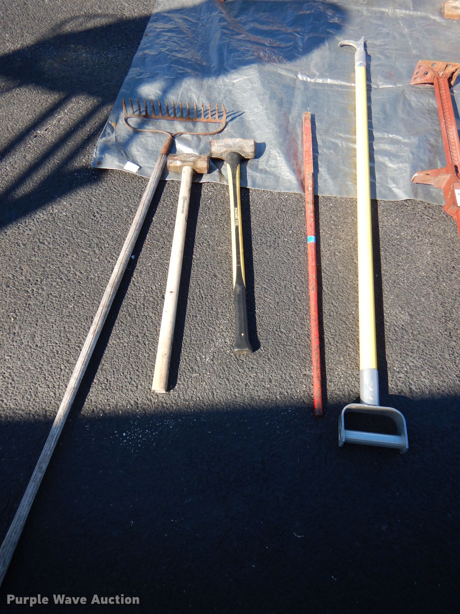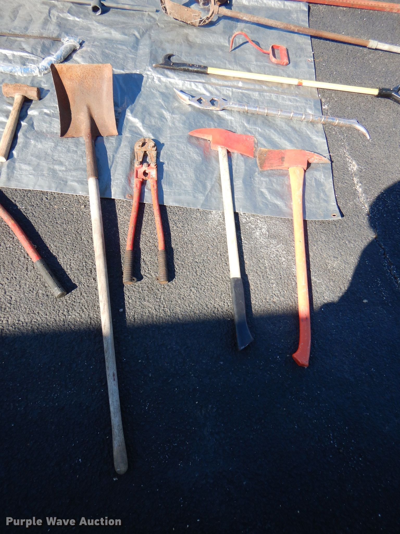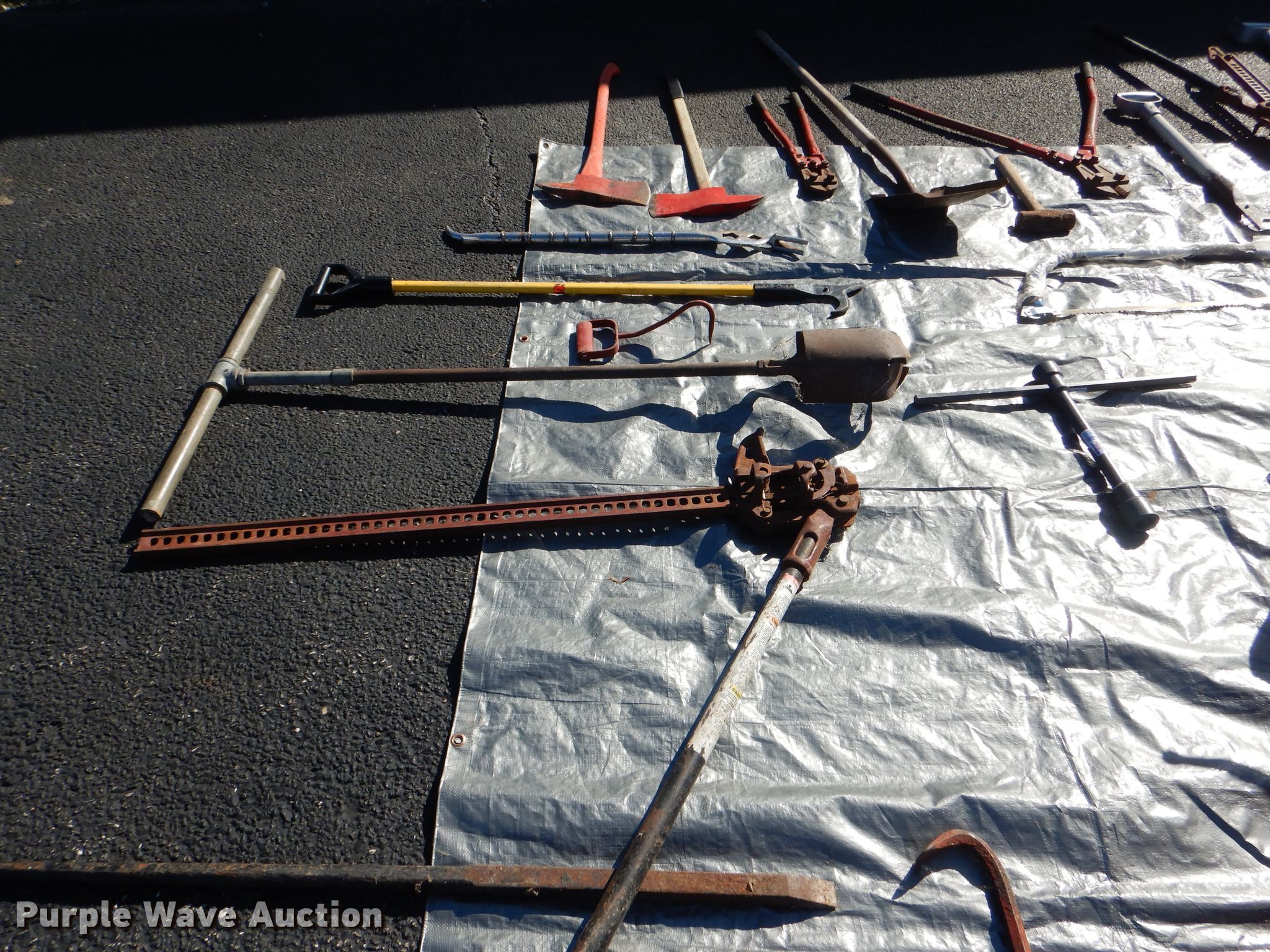 Purple Wave is selling a used Tools in Kansas. This item is a Tools with the following: Rake, Sledge hammers, Pry bars, Fire hooks, Hi-lift jacks, Tree saw, Bolt cutters, Shovel, Fire axes, Hay hook, Post hole diggers, Crowbar, Hose clamp, Toolbox, Lug wrench, Broom