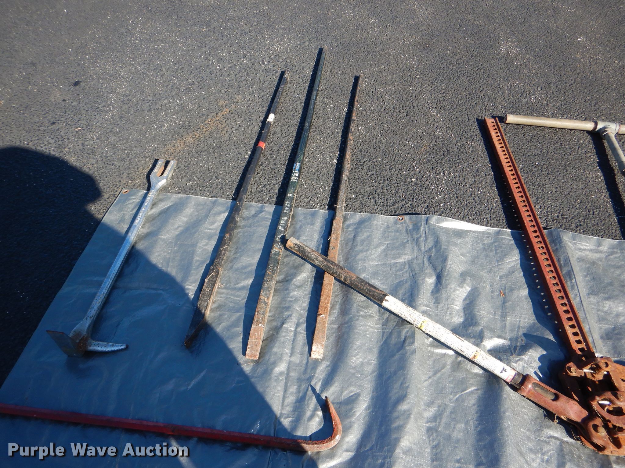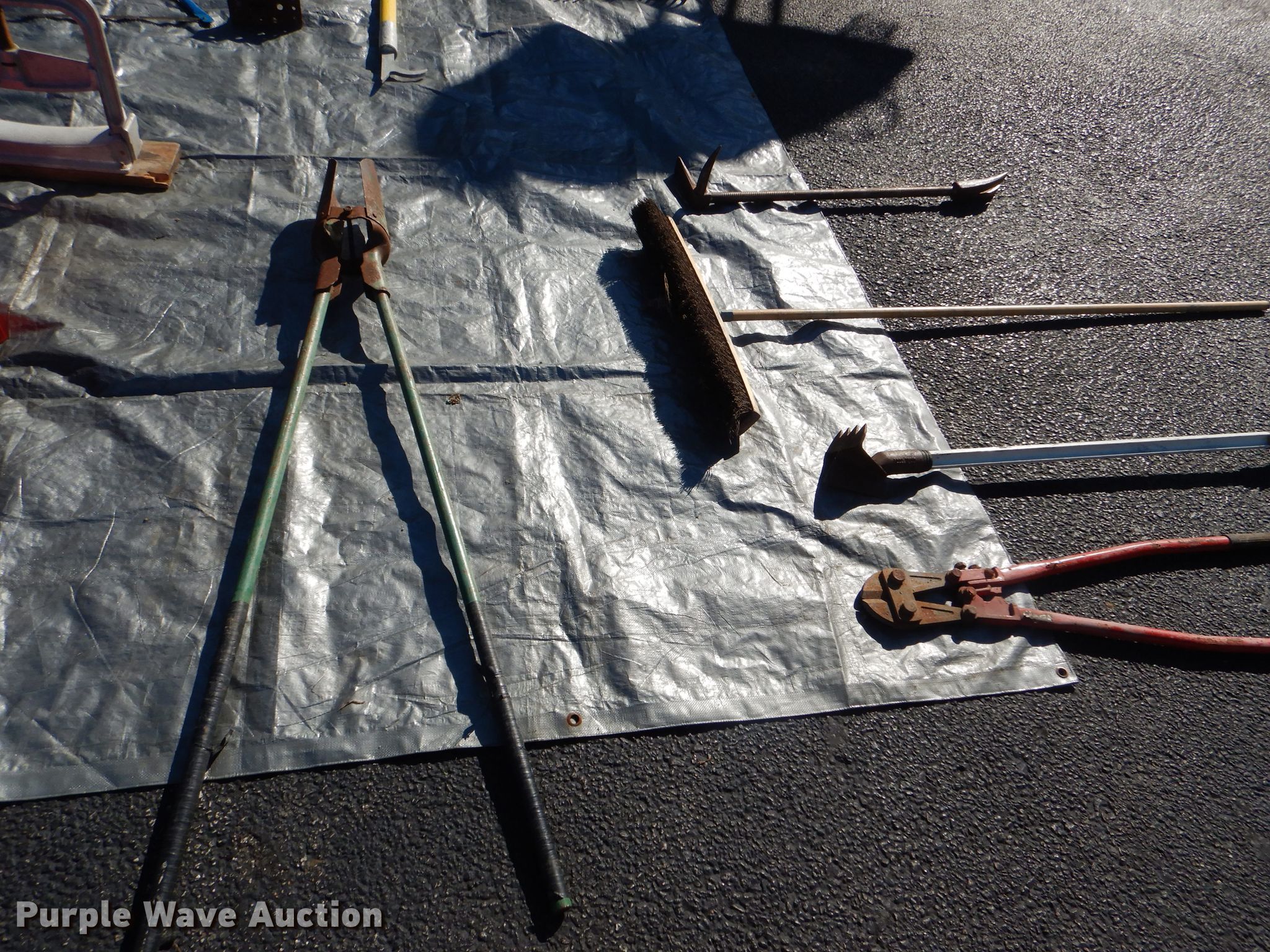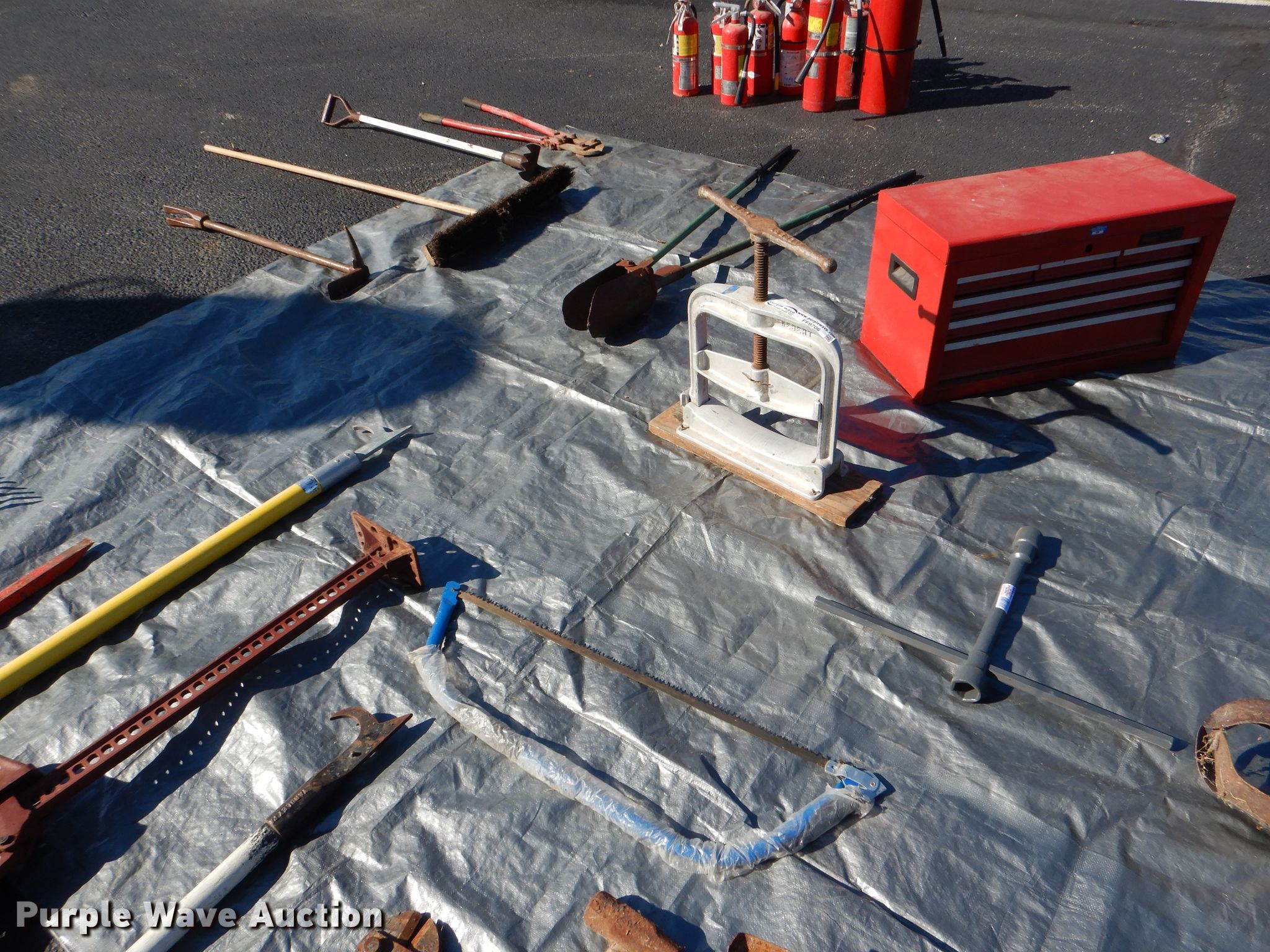 Purple Wave is selling a used Tools in Kansas. This item is a Tools with the following: Rake, Sledge hammers, Pry bars, Fire hooks, Hi-lift jacks, Tree saw, Bolt cutters, Shovel, Fire axes, Hay hook, Post hole diggers, Crowbar, Hose clamp, Toolbox, Lug wrench, Broom