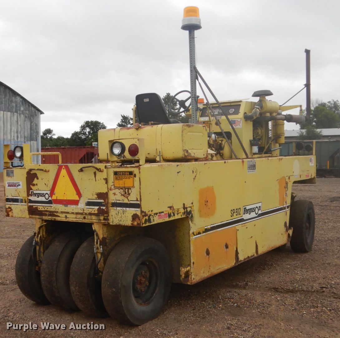 Purple Wave is selling a used Pneumatic Roller in South Dakota. This item is a Ferguson SP-912 pneumatic roller with the following: 2,318 hours on meter, John Deere four cylinder diesel engine, Direct-drive transmission, 4F-4R gears, (9) 8.5/90-15 tires, Serial 784