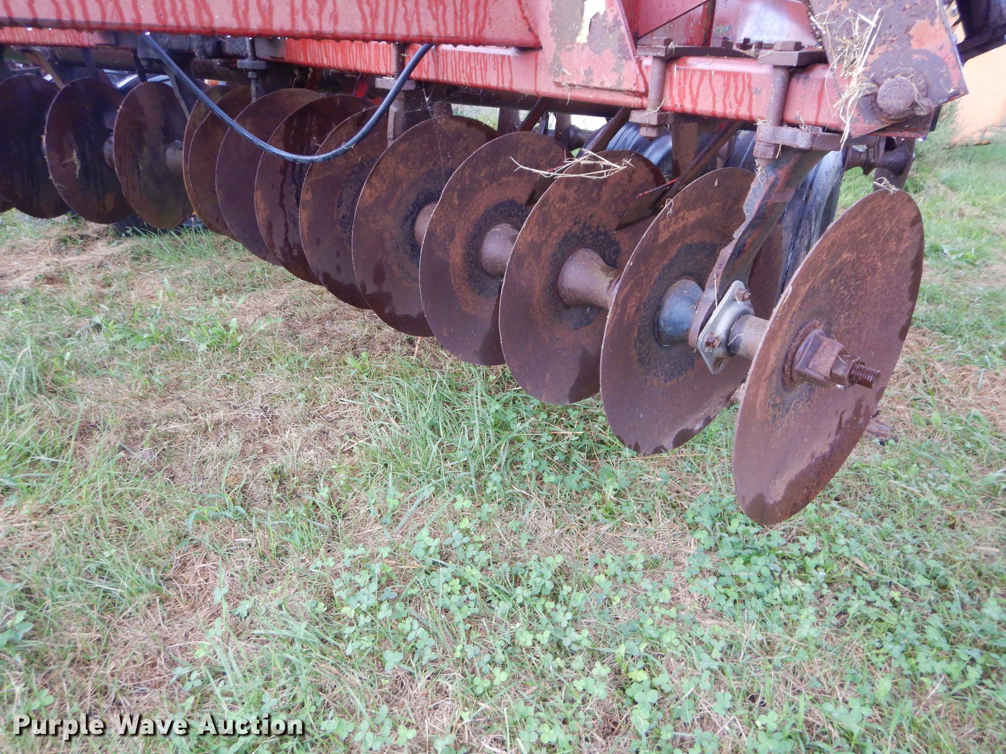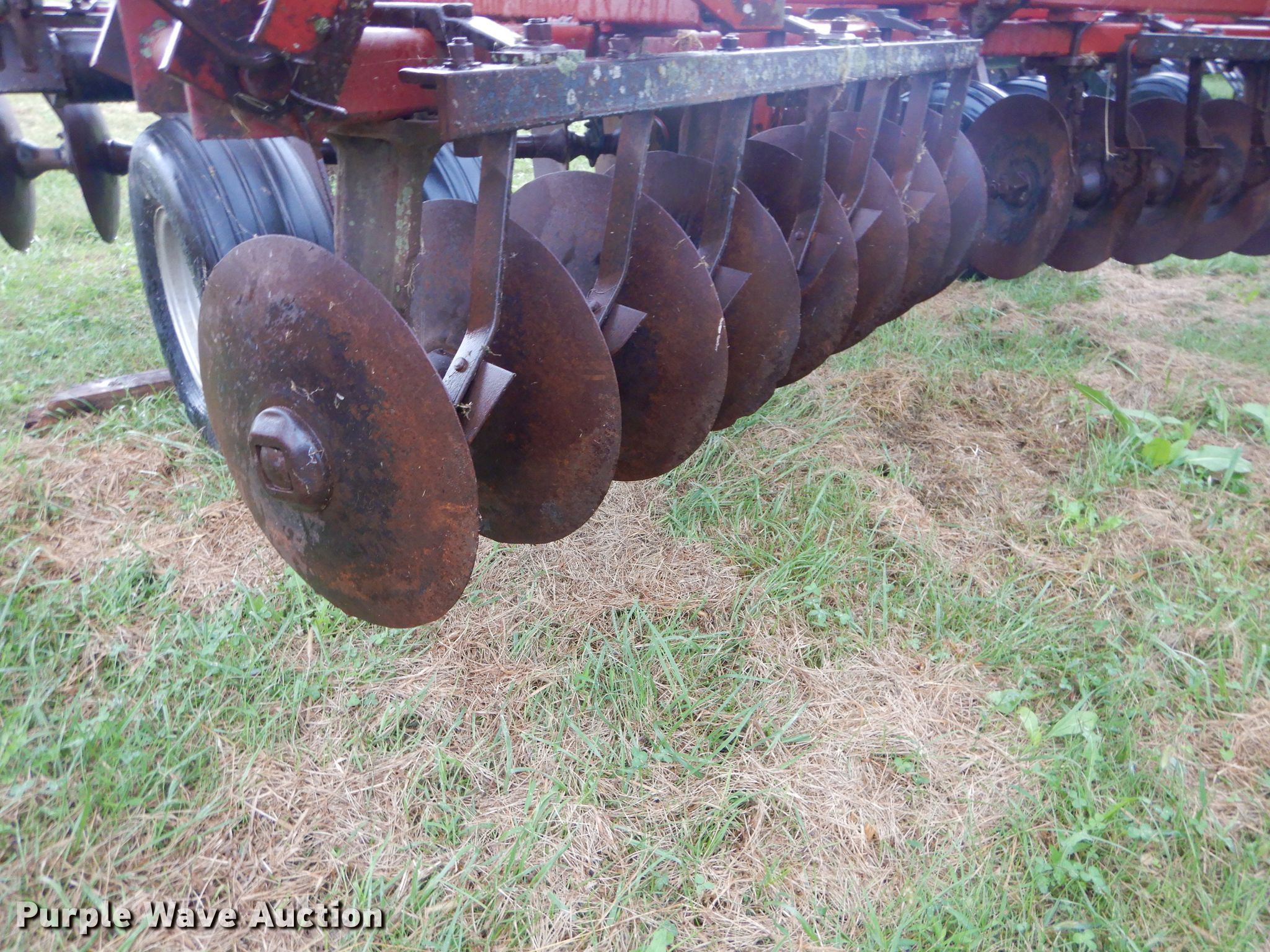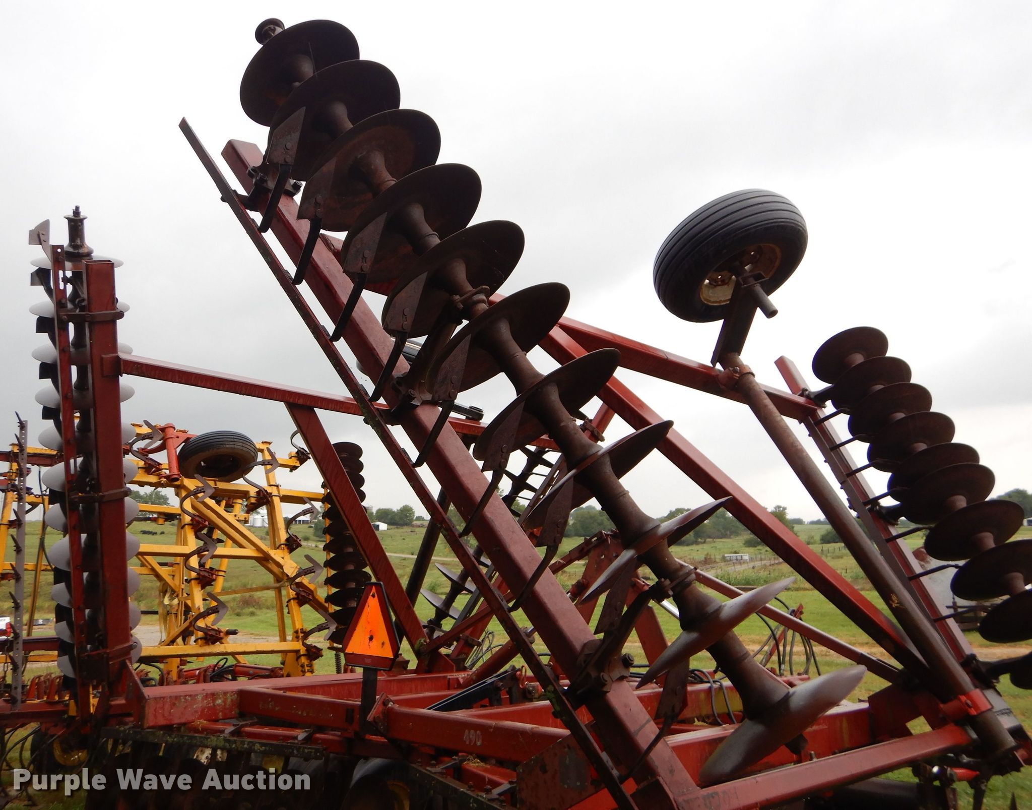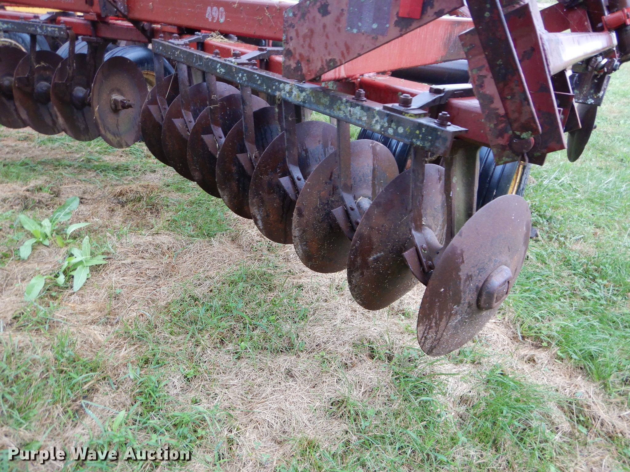 Purple Wave is selling a used Disk in Kansas. This item is a International 490 disk with the following: 28'W, 18" diameter disks, 9" spacing, Disk scrapers, Manual leveler, Hydraulic lift and fold, 11L-15 tires, Outside rear disks missing, Some scrapers missing, Serial 0470000U28057