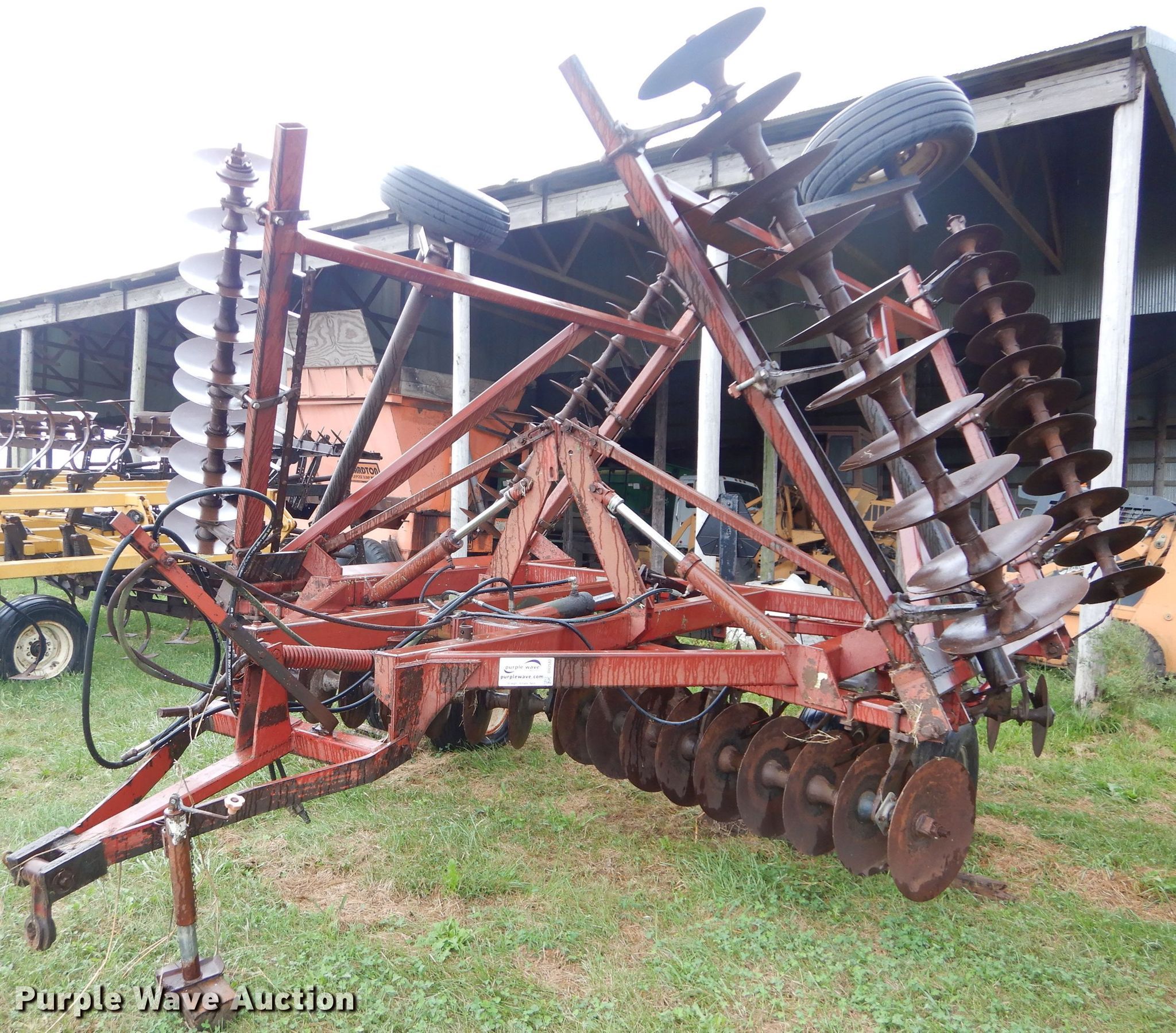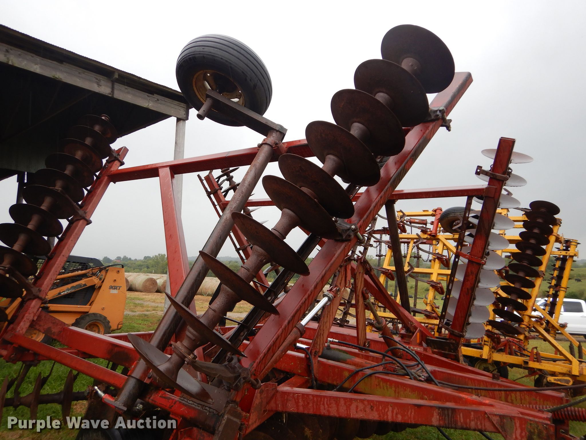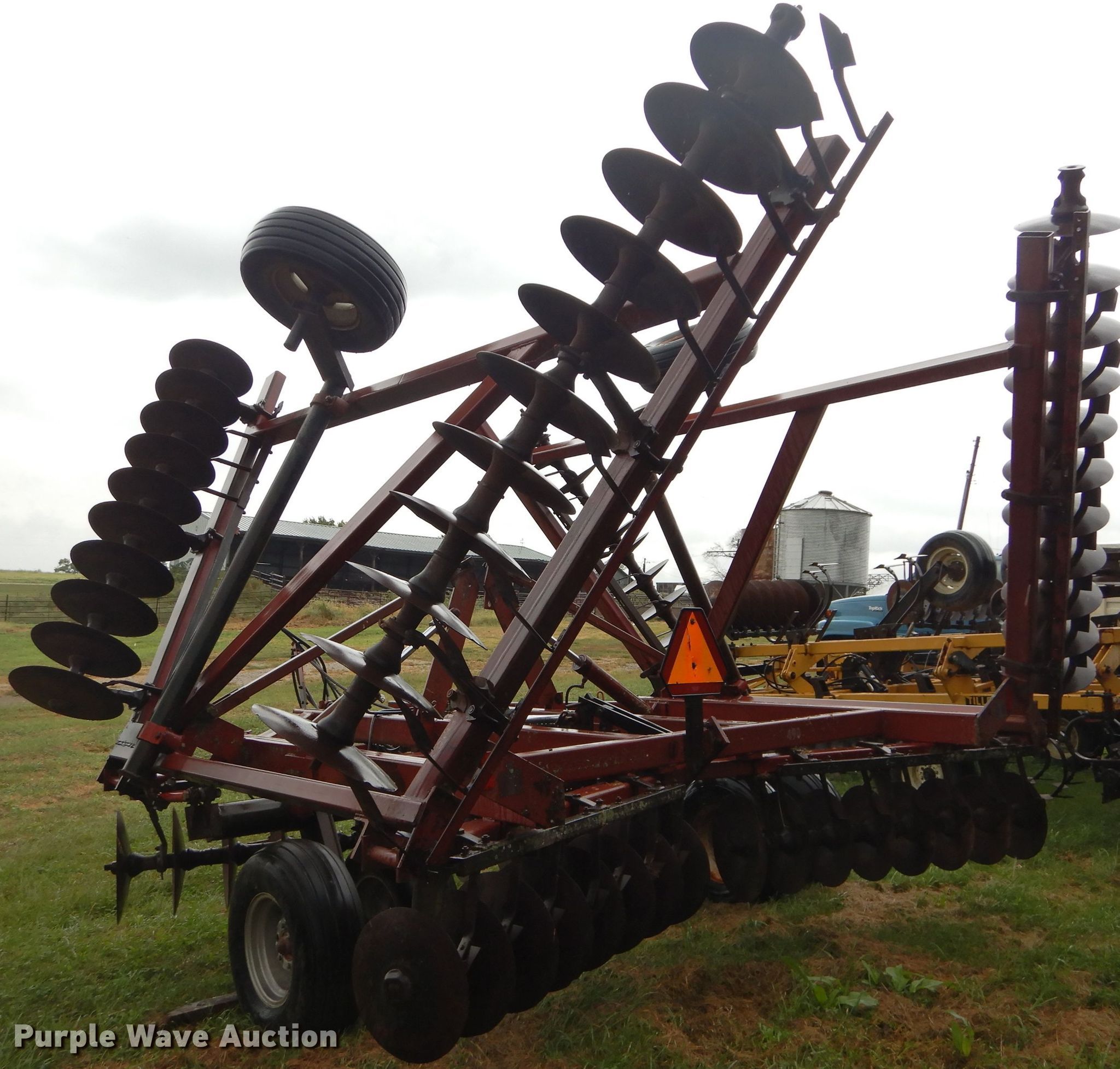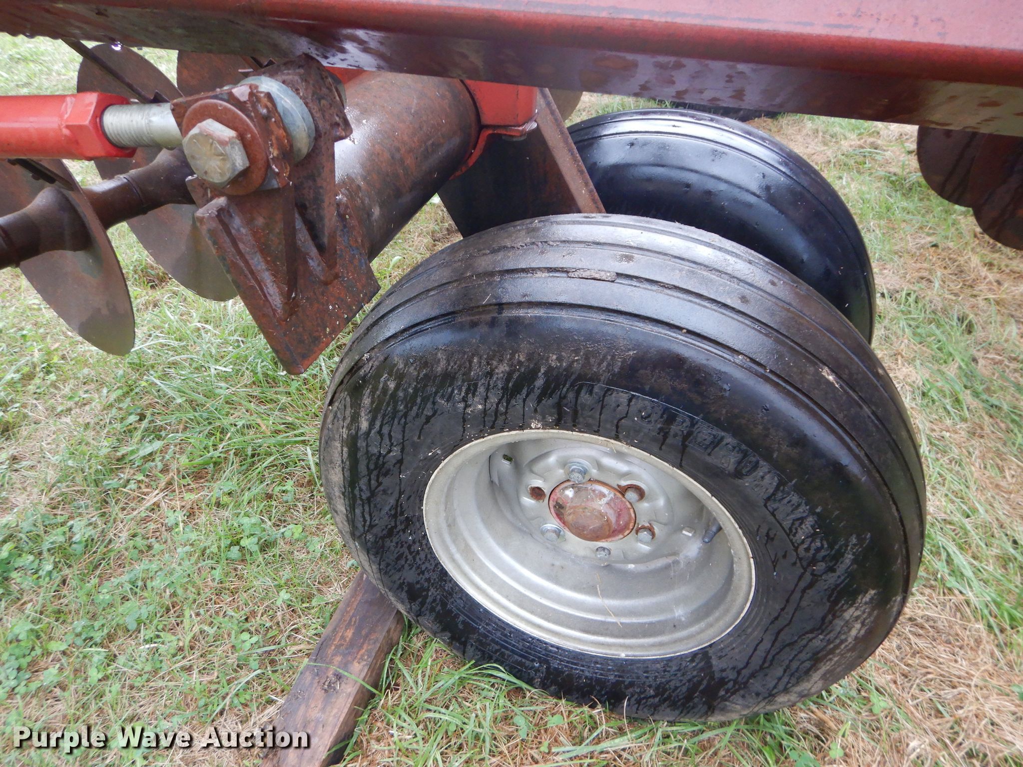 Purple Wave is selling a used Disk in Kansas. This item is a International 490 disk with the following: 28'W, 18" diameter disks, 9" spacing, Disk scrapers, Manual leveler, Hydraulic lift and fold, 11L-15 tires, Outside rear disks missing, Some scrapers missing, Serial 0470000U28057