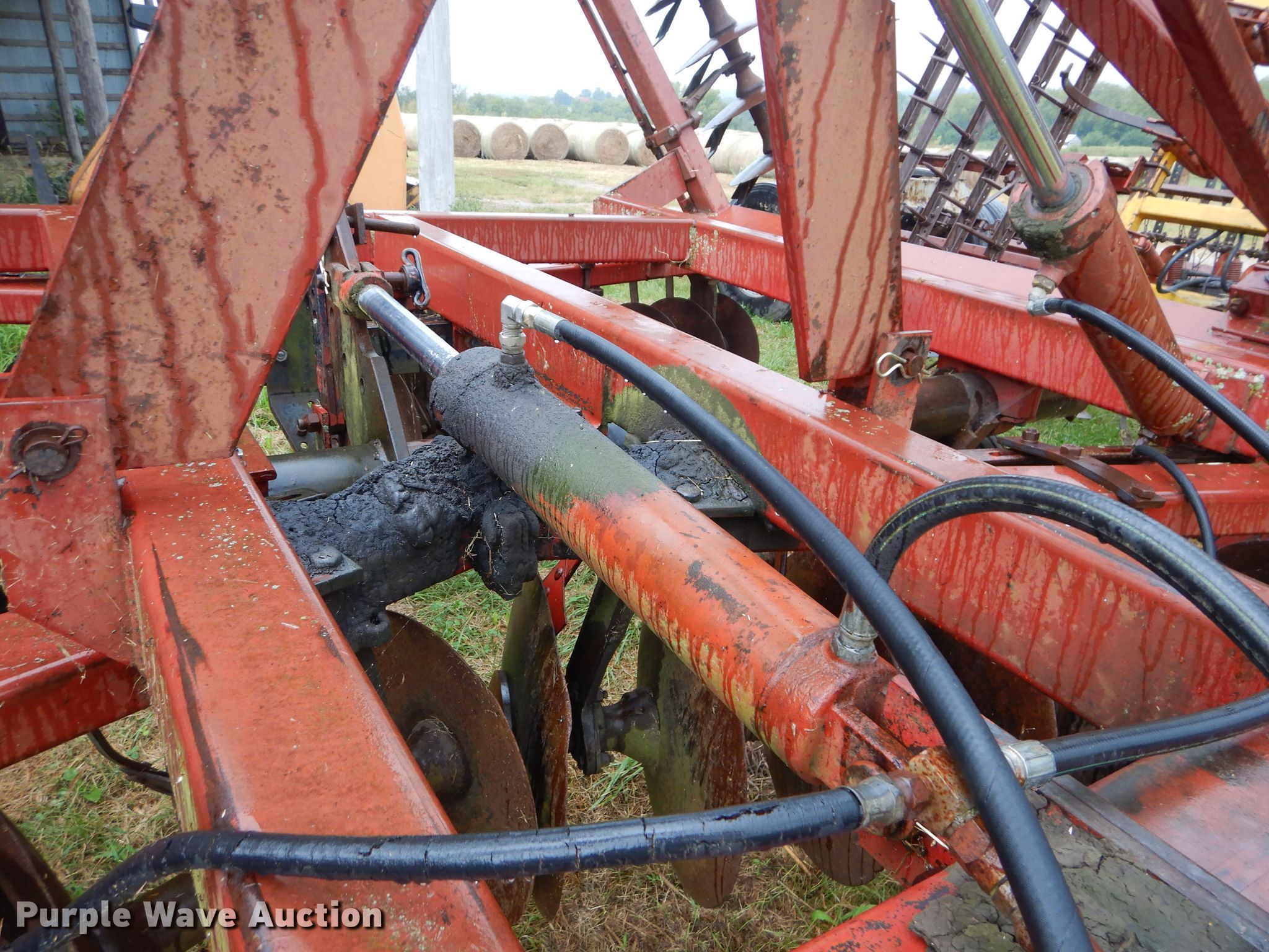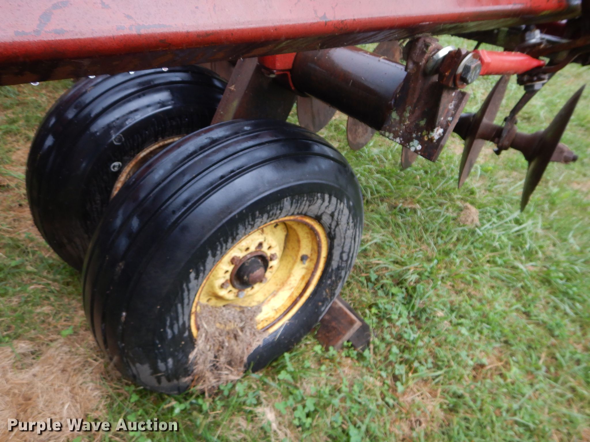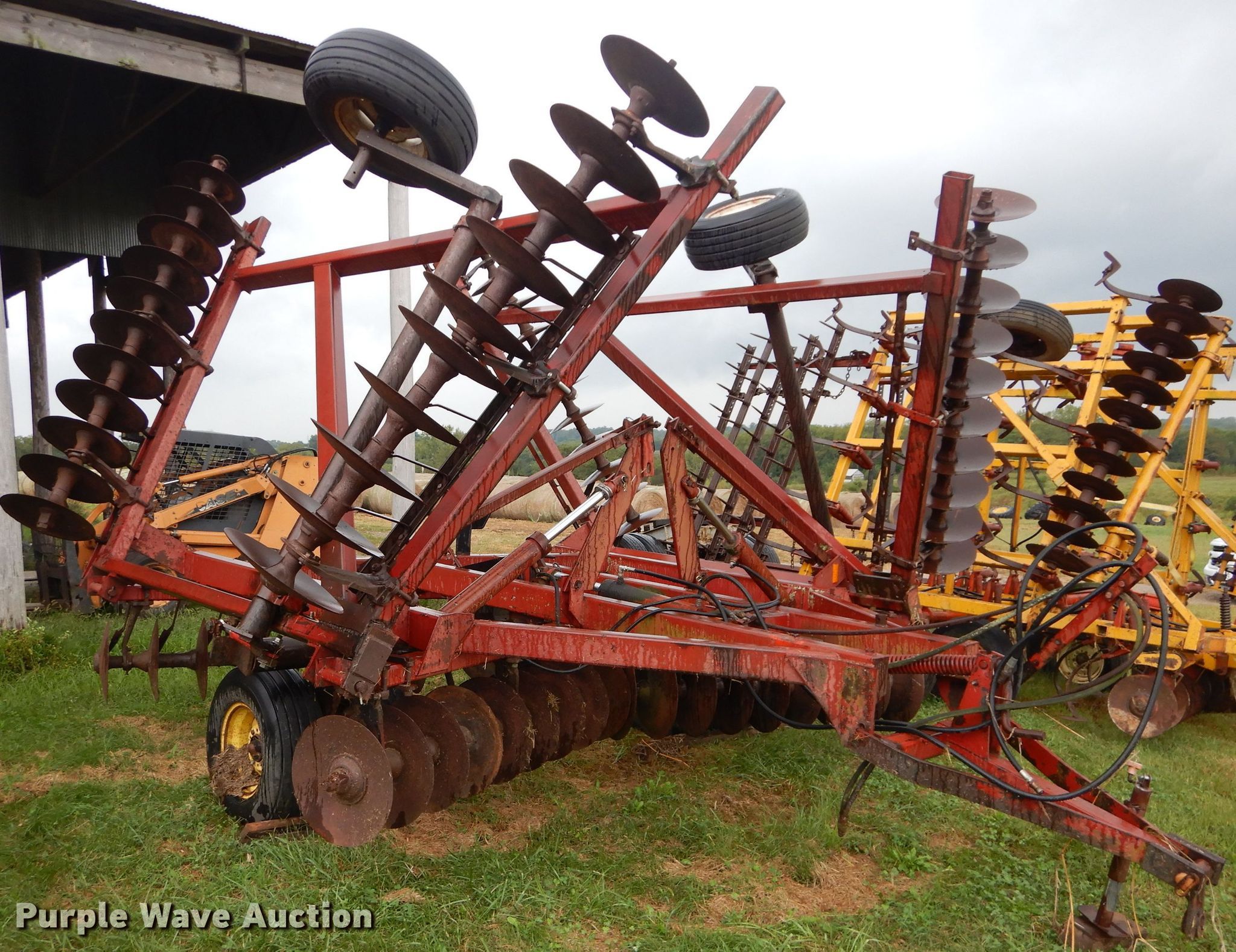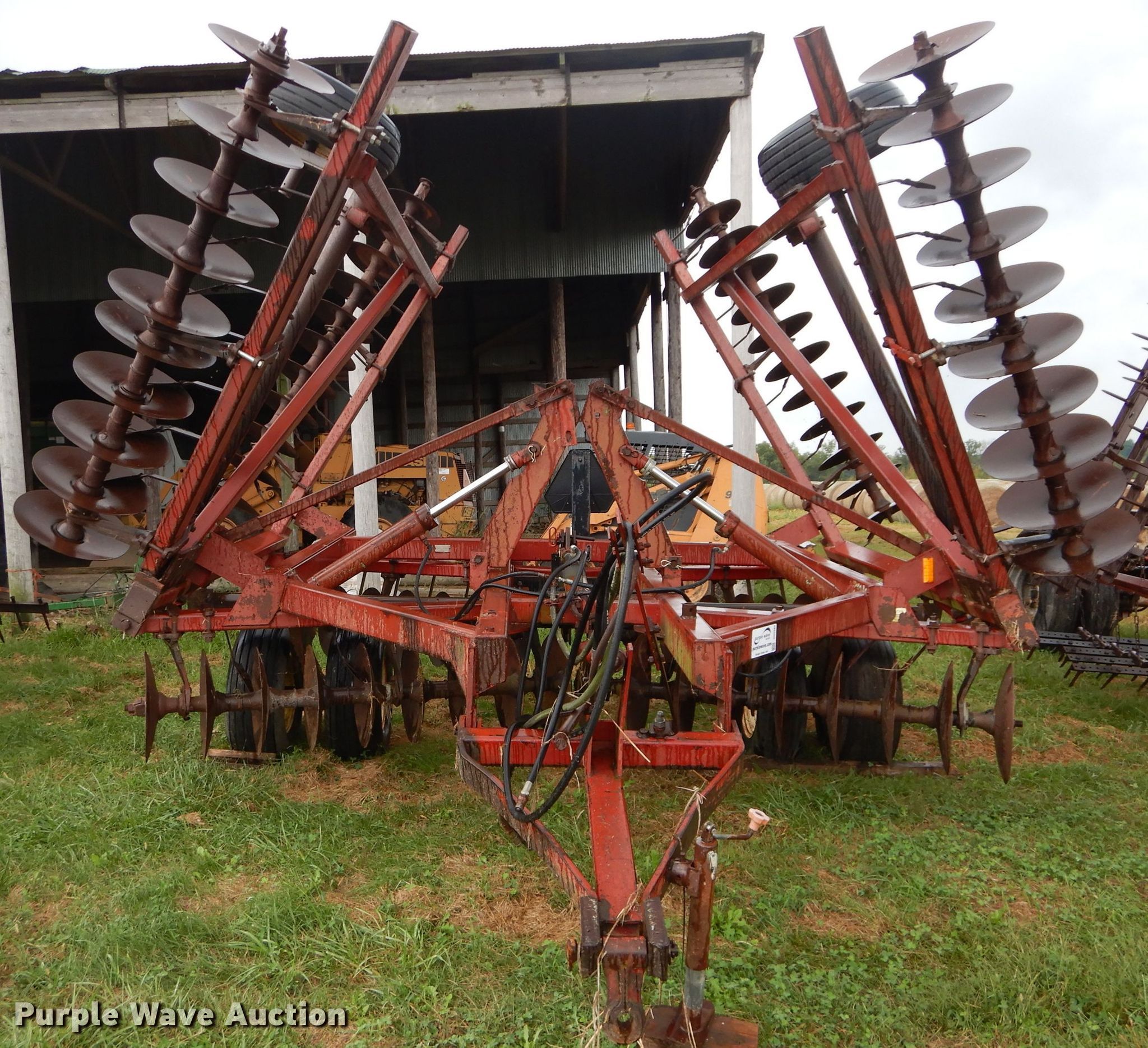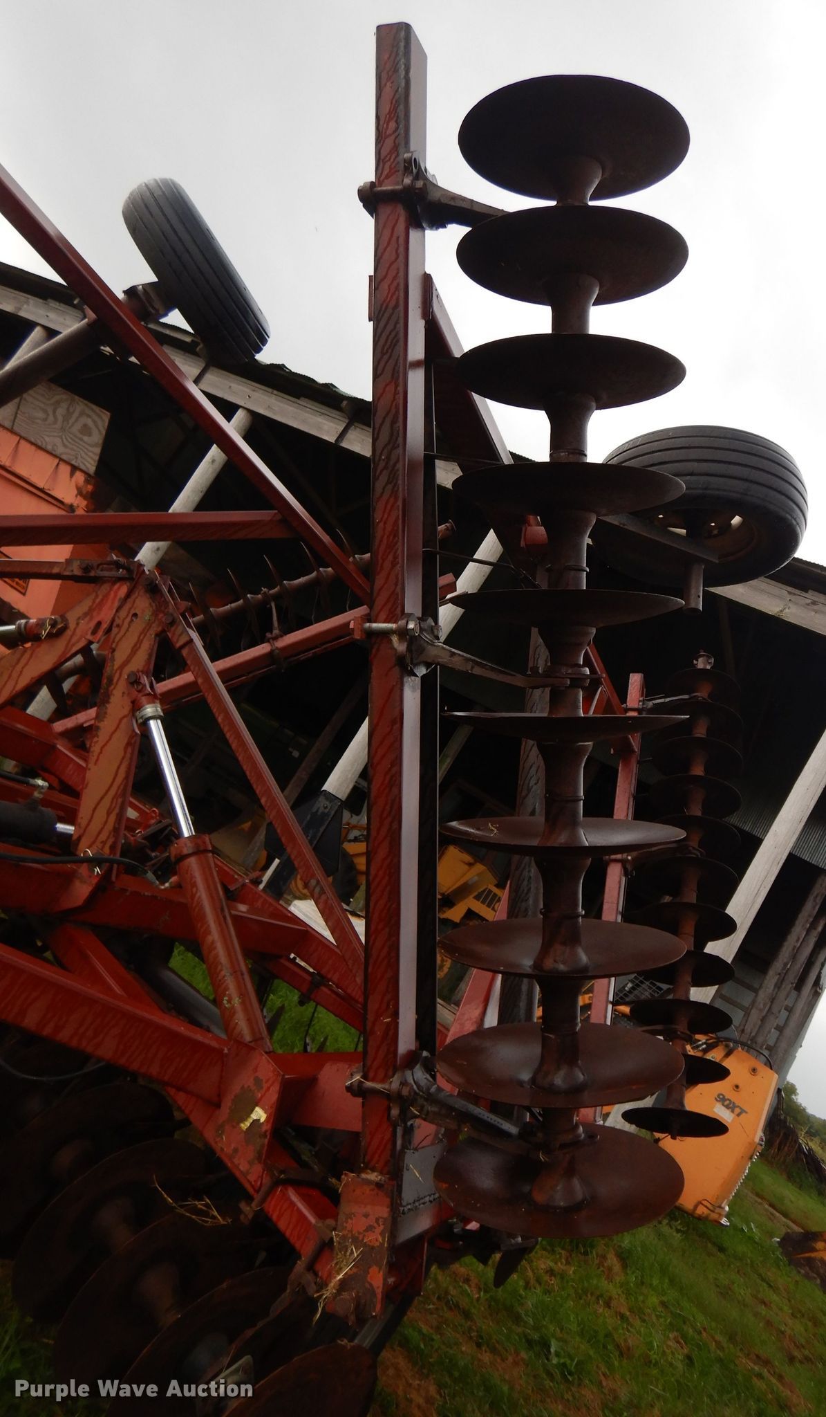 Purple Wave is selling a used Disk in Kansas. This item is a International 490 disk with the following: 28'W, 18" diameter disks, 9" spacing, Disk scrapers, Manual leveler, Hydraulic lift and fold, 11L-15 tires, Outside rear disks missing, Some scrapers missing, Serial 0470000U28057