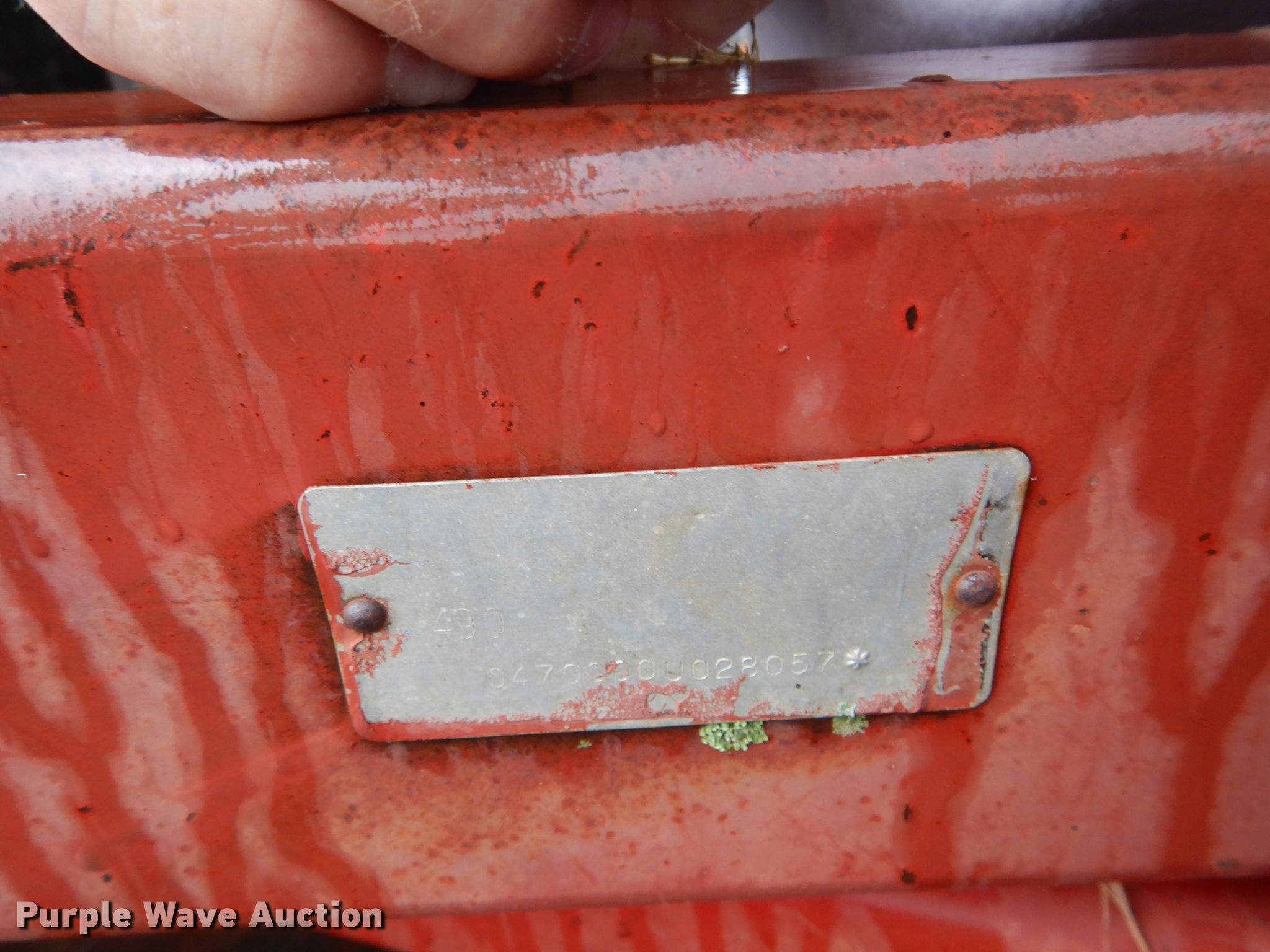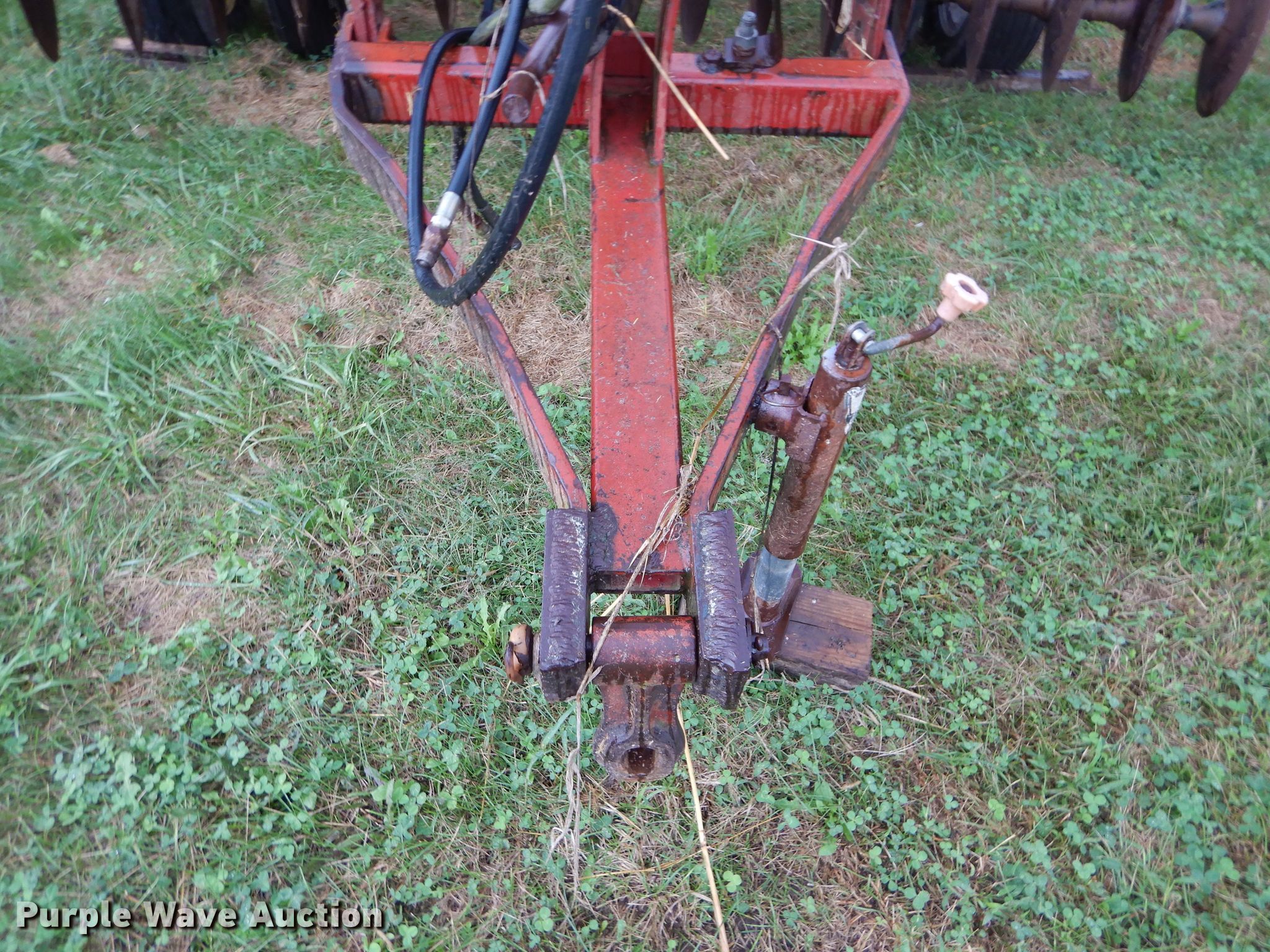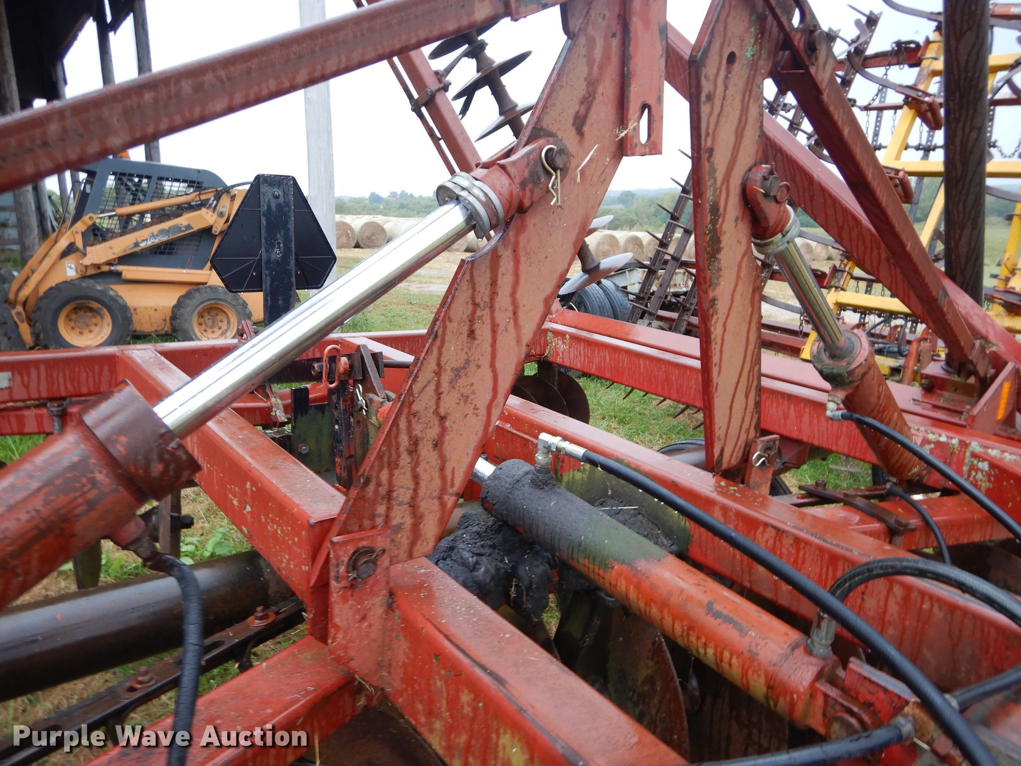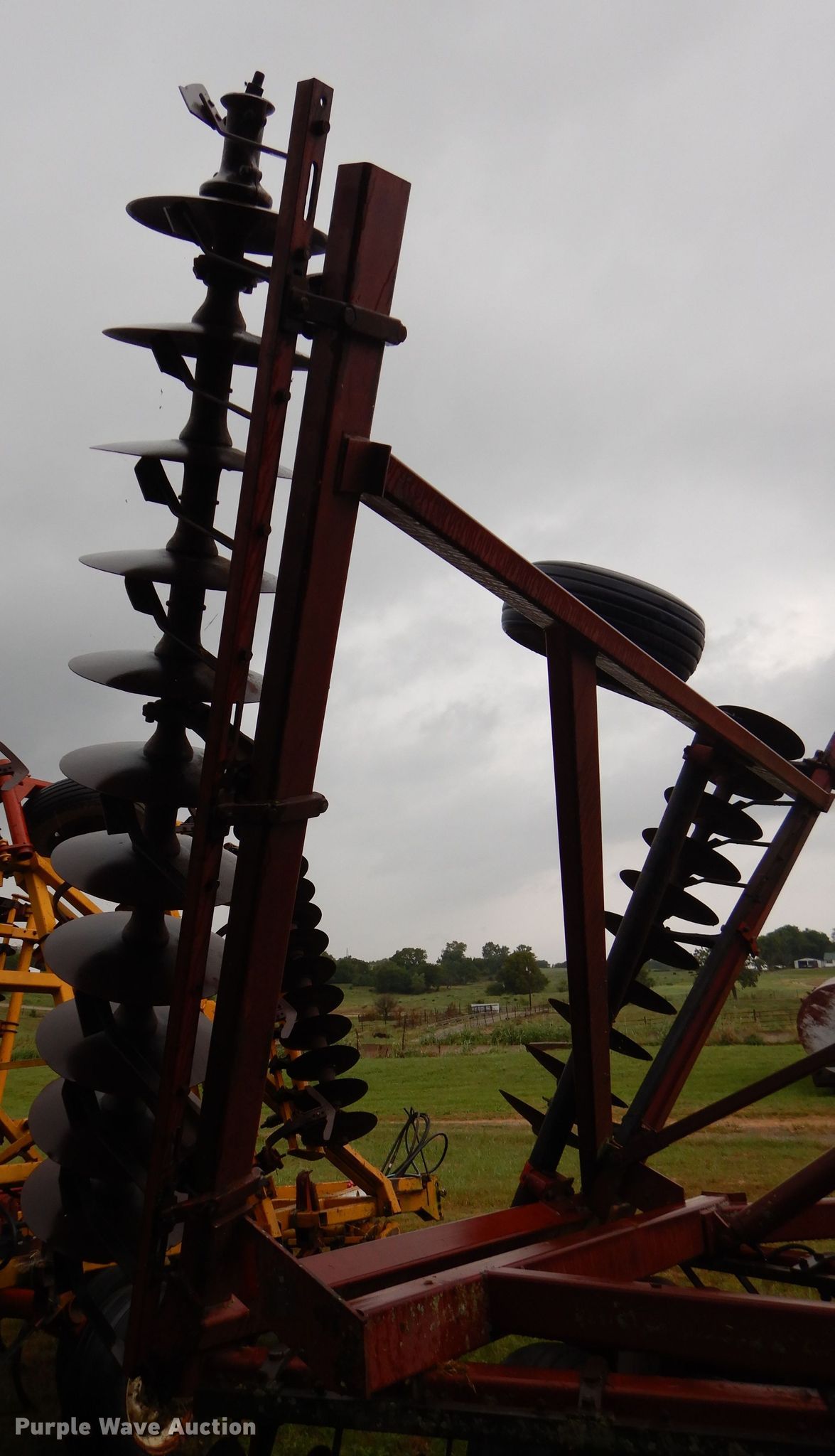 Purple Wave is selling a used Disk in Kansas. This item is a International 490 disk with the following: 28'W, 18" diameter disks, 9" spacing, Disk scrapers, Manual leveler, Hydraulic lift and fold, 11L-15 tires, Outside rear disks missing, Some scrapers missing, Serial 0470000U28057