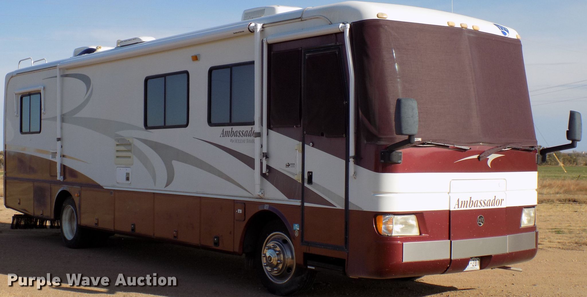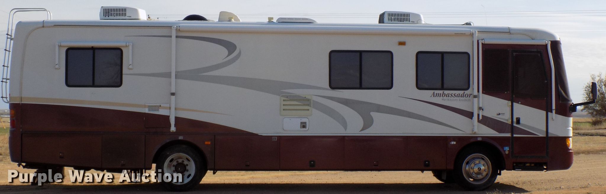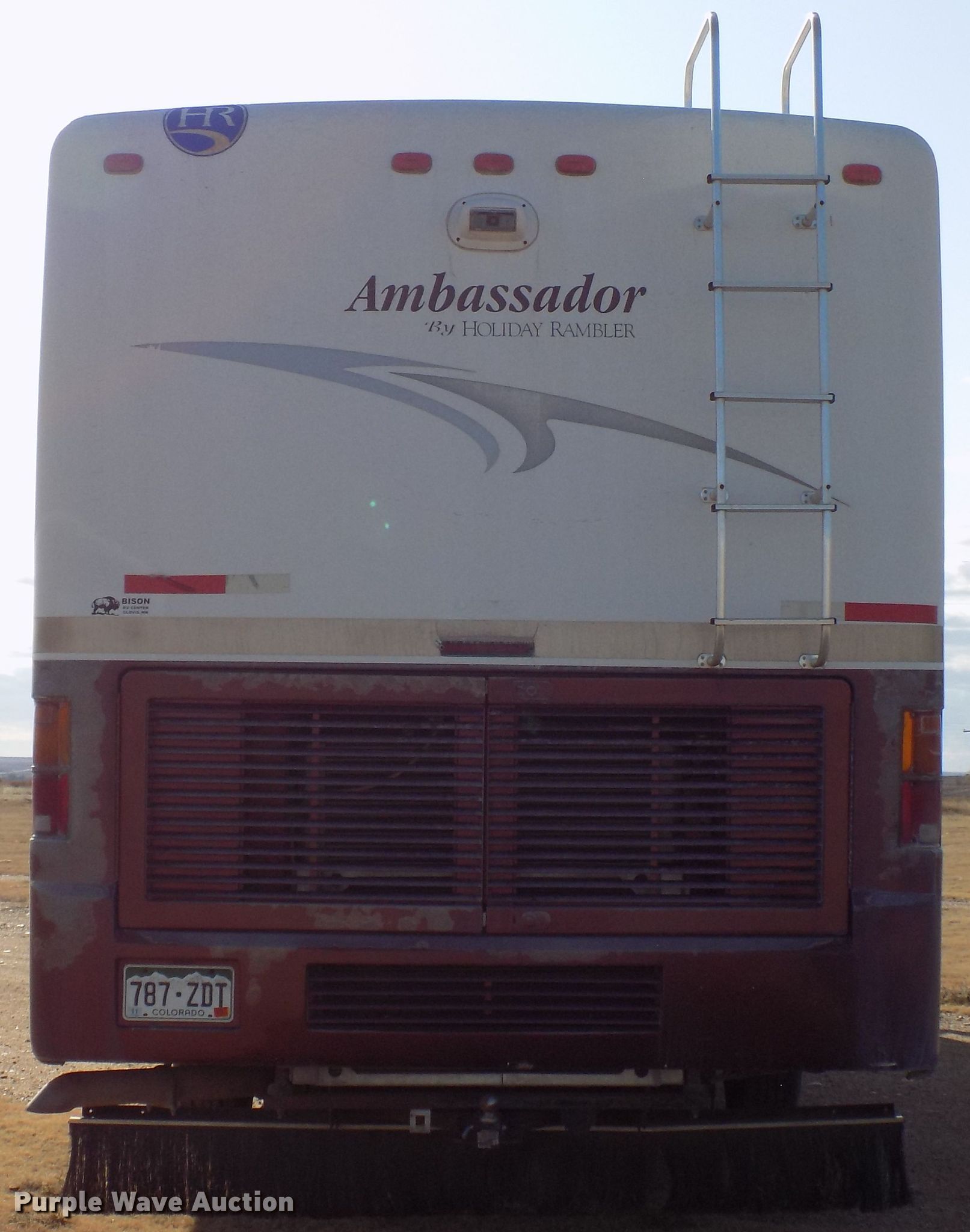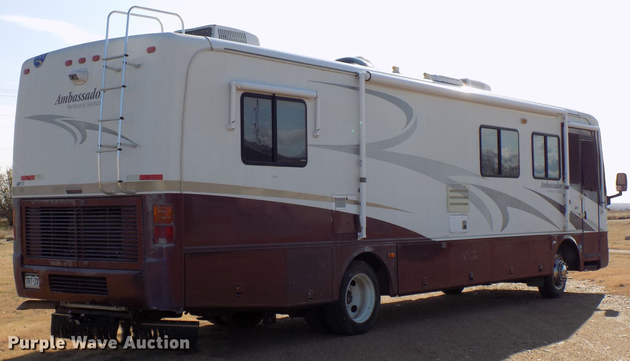 Purple Wave is selling a used RV in Colorado. This item is a 2000 Holiday Rambler Ambassador RV with the following: 52,456 miles on odometer, Cummins ISC 8.3L L6 diesel engine, Allison automatic transmission, Single axle, 36'L, Slide-out, (2) awnings, Kitchen, Sink, Refrigerator/freezer, Microwave, Gas stove, Living room, Table, Couch, Bathroom, Queen bed, (2) televisions, (2) AC units, Auto leveler, Onan 6300LP generator, Propane engine, Rear hitch, Air suspension, Air brakes, 255/70R22.5 tires, GVWR 22,000 lbs, Cracked windshield, Non-operational television, Living quarters battery weak