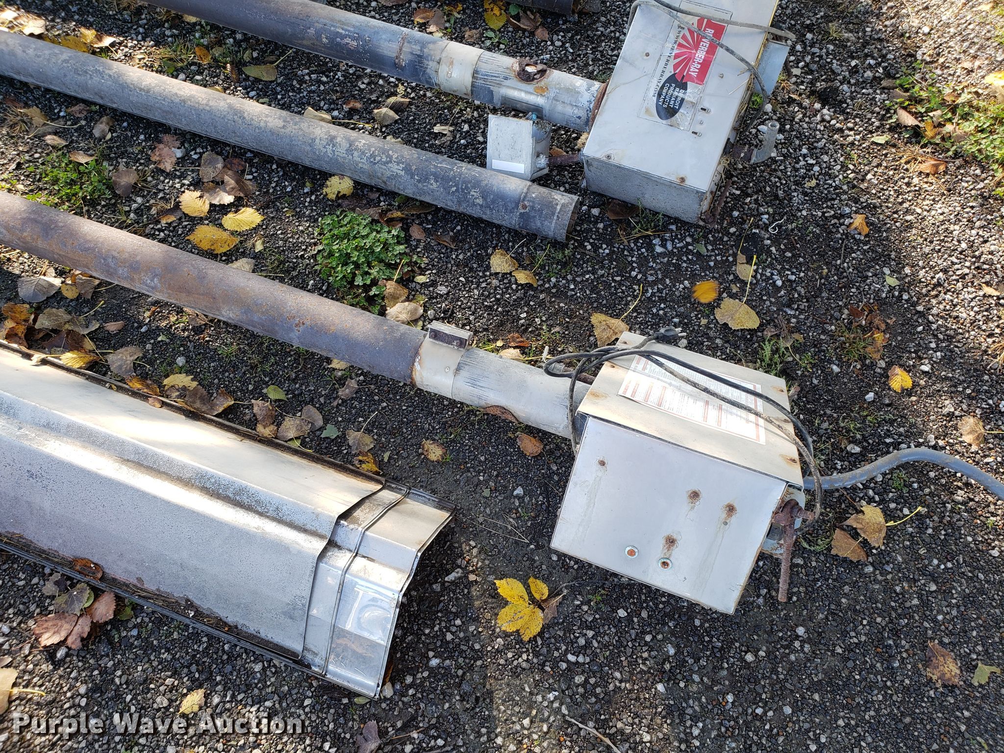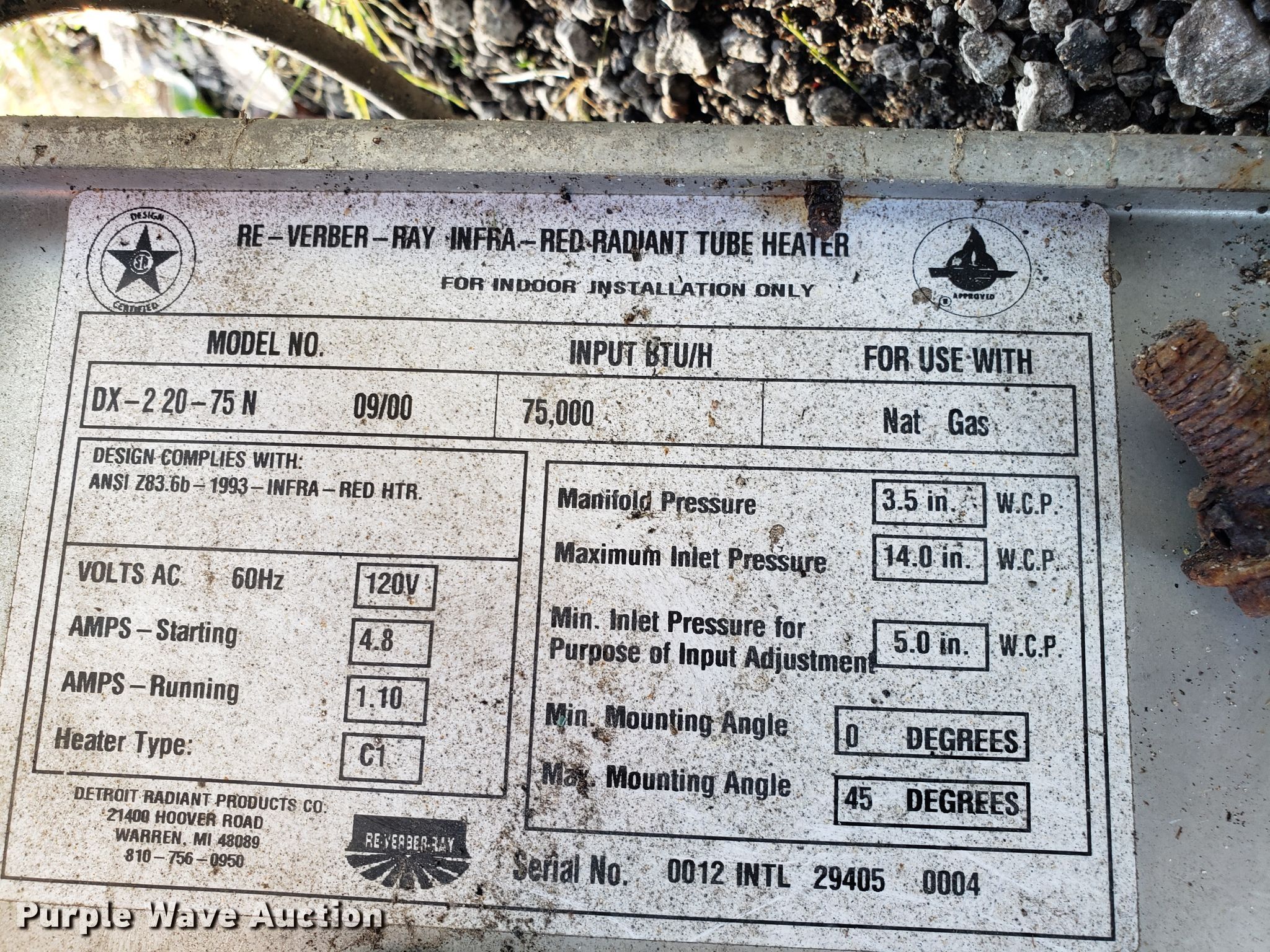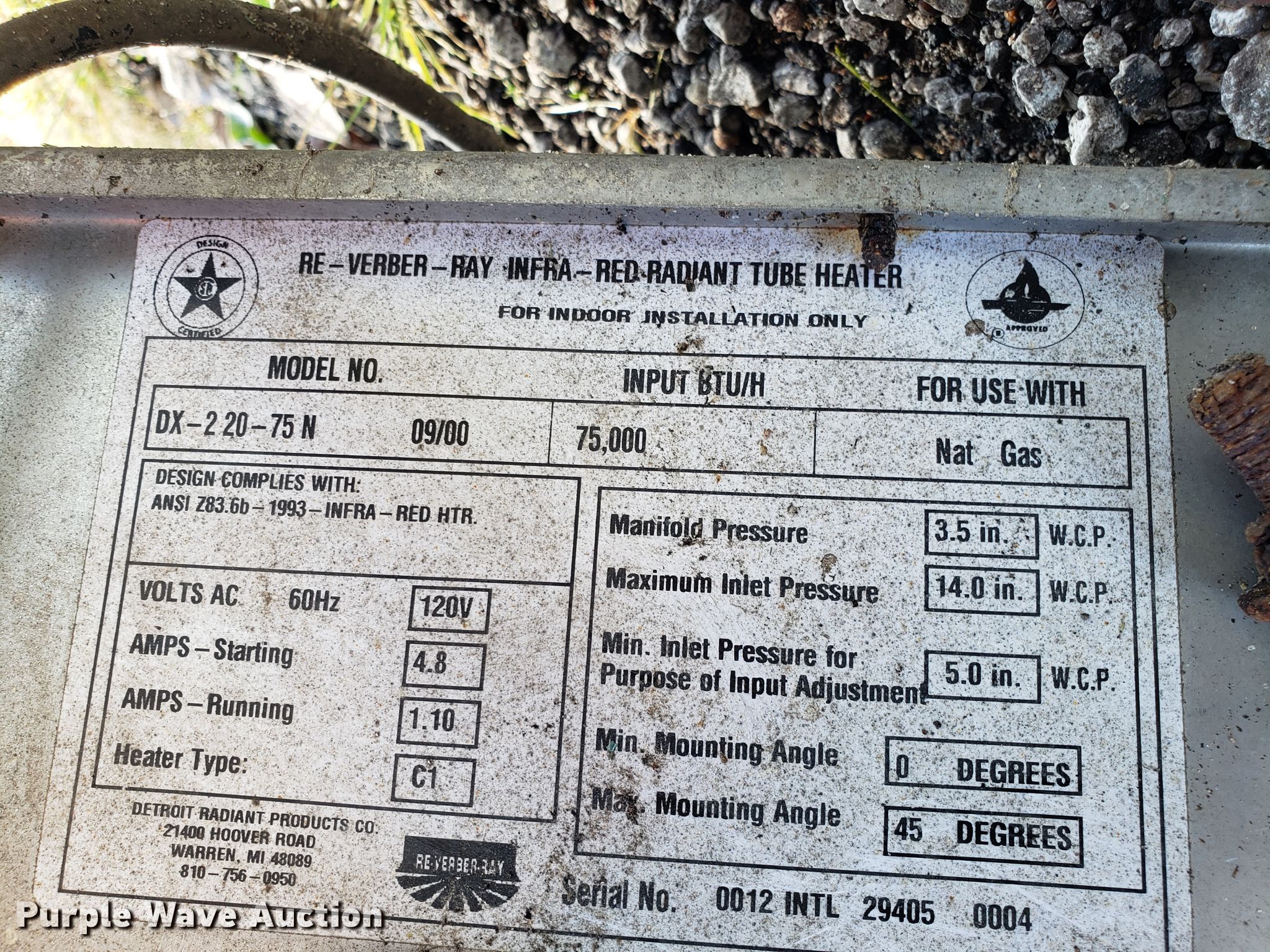 Purple Wave is selling a used Portable Heater or Fan in Missouri. This item is a (3) Re-Verber-Ray radiant heaters with the following: Natural gas, 75,000 BTU, 120V, Approx. 12'L piping