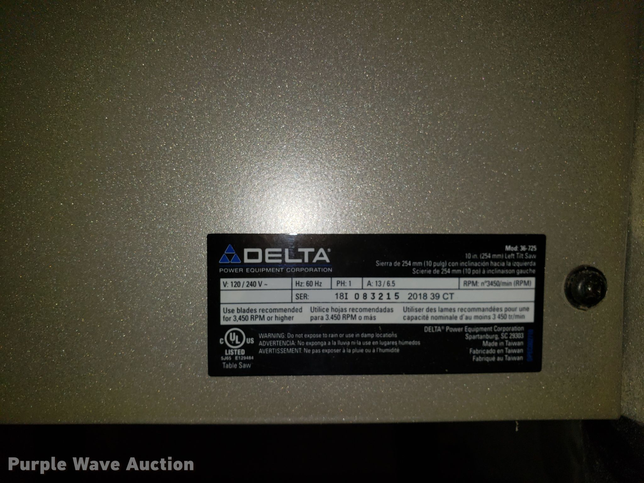 Purple Wave is selling a used Tools in Missouri. This item is a 2018 Delta 36-725 table saw with the following: 120V, Single phase, Serial 18I083215