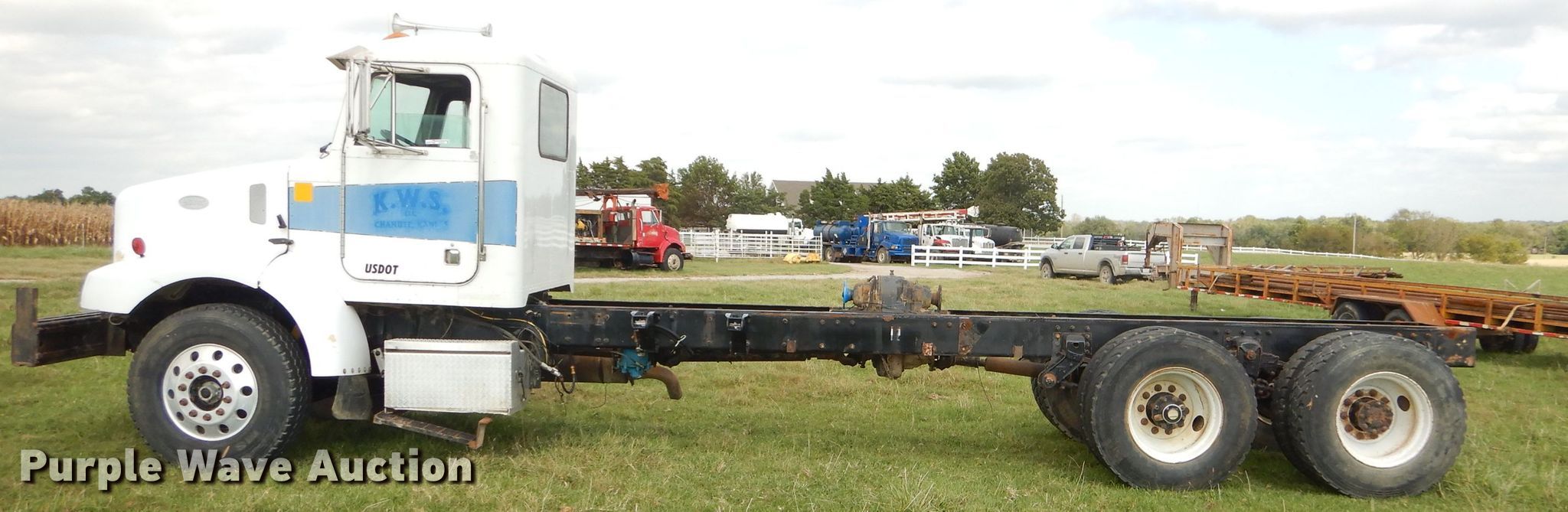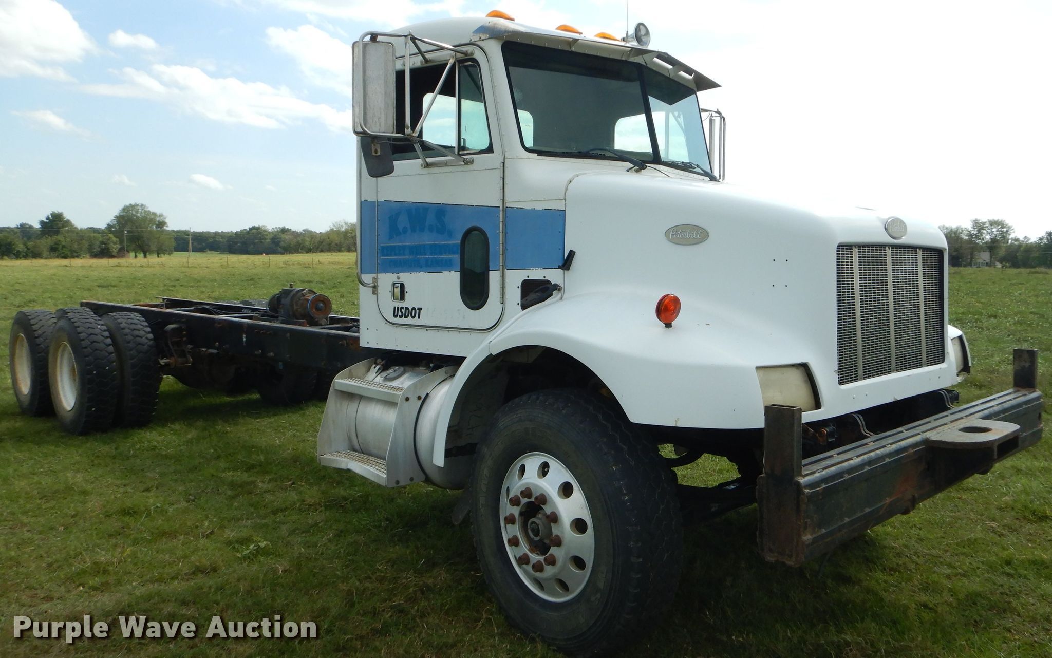 Purple Wave is selling a used Truck Chassis in Kansas. This item is a 1999 Peterbilt 330 truck cab and chassis with the following: 488,758 miles on odometer, 9,345 hours on meter, Caterpillar 3126 7.2L L6 diesel engine, Manual transmission, Tandem axle, Inter-axle differential lock, AC and heat, Cruise, PTO, Single fuel tank, Spring suspension, Air brakes, 315/80R22.5 front tires, 11R22.5 rear tires
