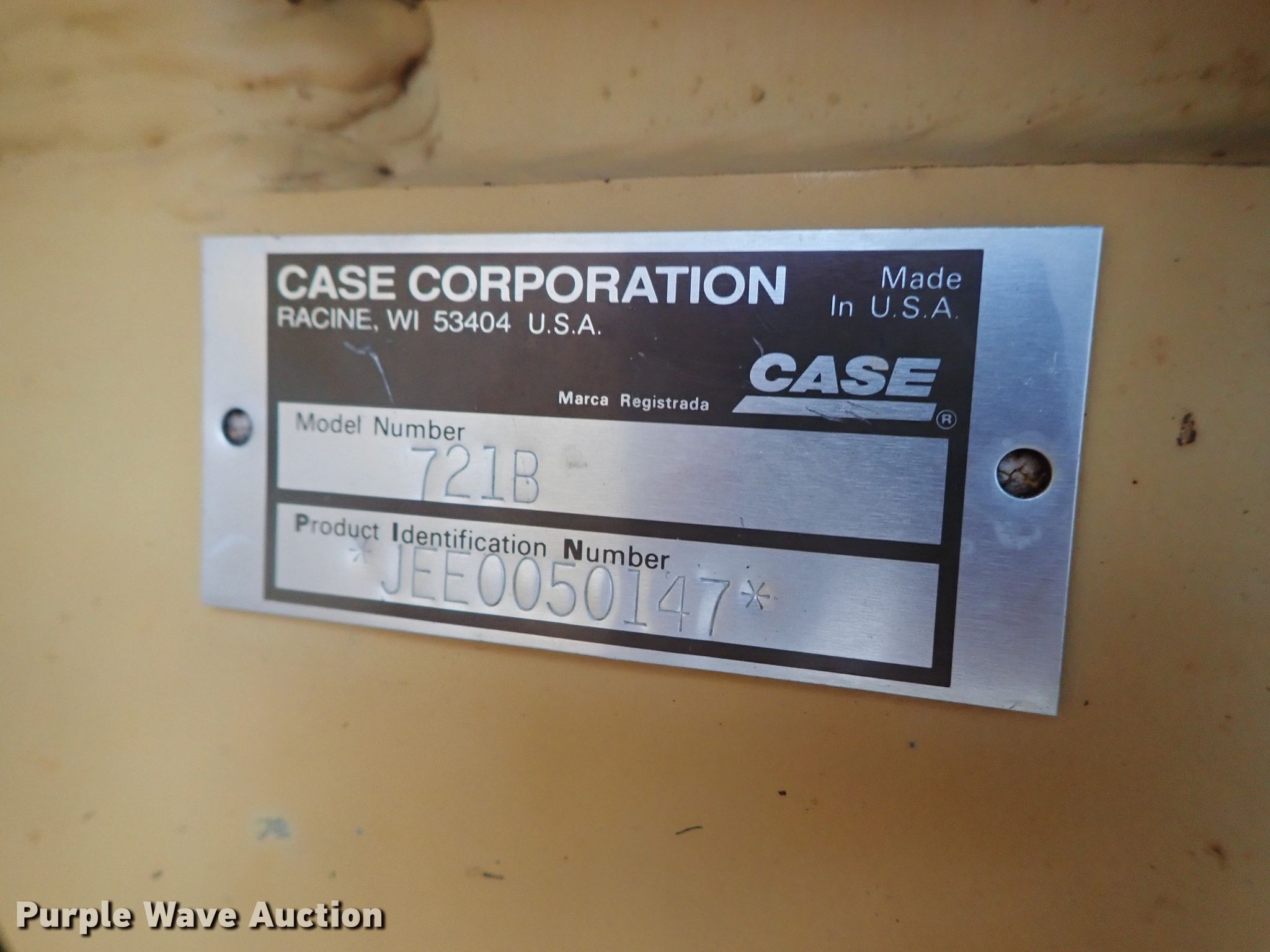 Purple Wave is selling a used Wheel Loader in Kansas. This item is a 1996 Case 721B wheel loader with the following: 1,429 hours on meter, Case 6T-830 six cylinder diesel engine, Serial 45231073, Powershift transmission, 4F-4R gears, Enclosed cab, Heat, Two lever bucket controls, Dymax DQ721 100"W general purpose bucket, Bolt-on cutting edge, Dymax 60"L pallet forks, Hydraulic quick coupler, 20.5-25 tires, Maintenance records available upon request, Serial JEE0050147