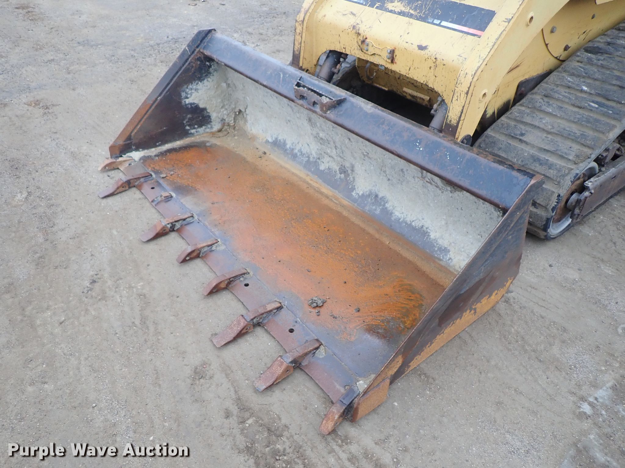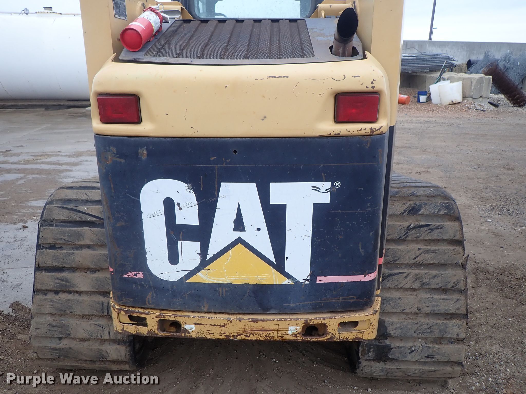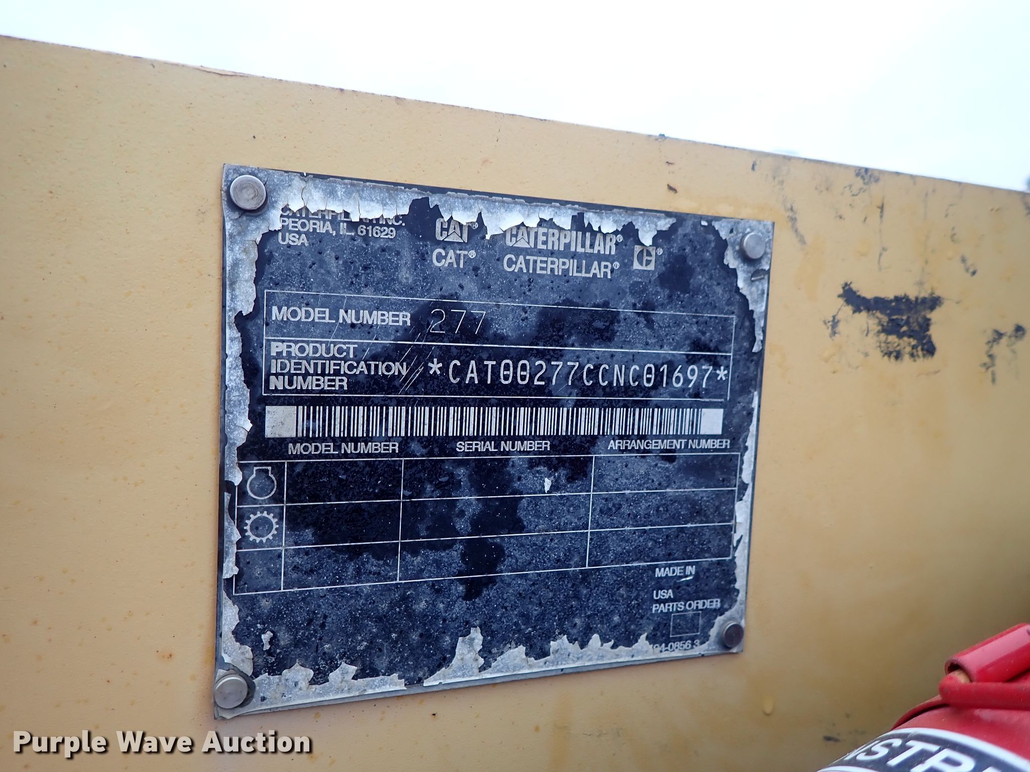 Purple Wave is selling a used Tracked Skid Steer Loader in Kansas. This item is a 2003 Caterpillar 277 skid steer with the following: 3,169 hours on meter, Perkins 2600 four cylinder diesel engine, 60.5 kW, Hydrostatic transmission, Enclosed cab, Heat, Hand bucket controls, 80"W bucket, Bolt-on cutting edge, Bolt-on teeth, Manual quick coupler, Auxiliary hydraulics, 17"W tracks, Door hinges missing, AC has been deleted, Serial CAT00277CCNC01697