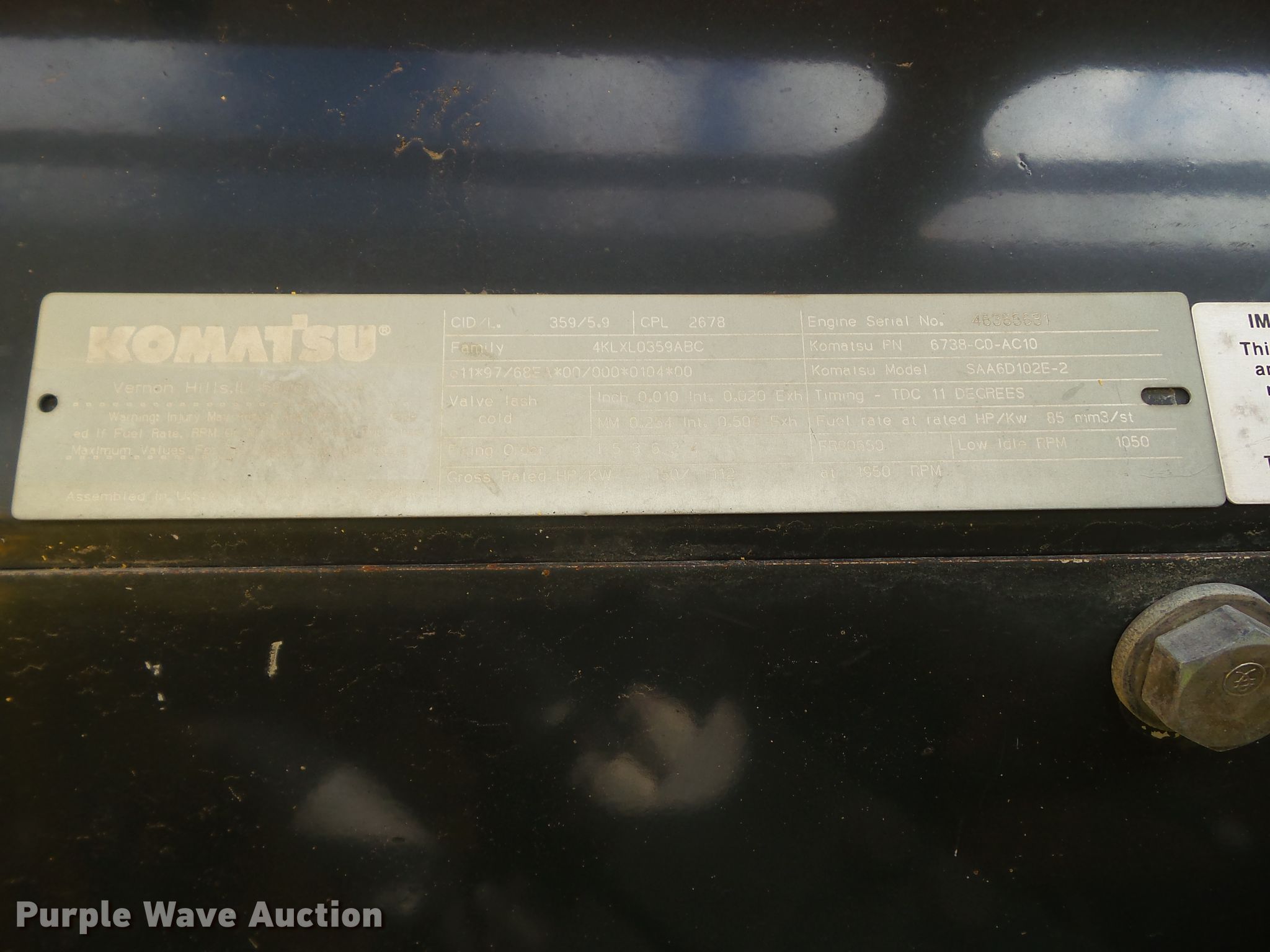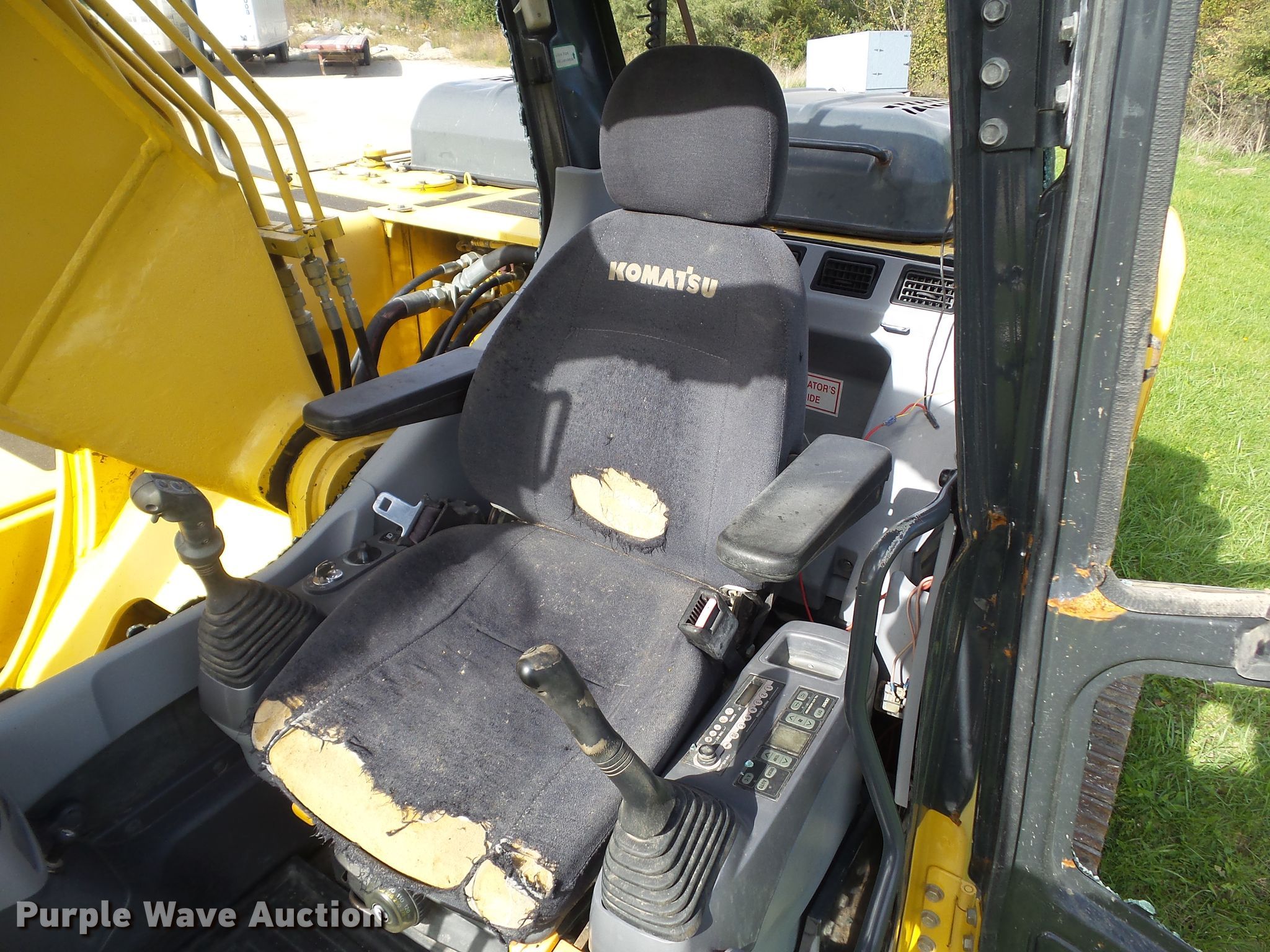 Purple Wave is selling a used Hydraulic Excavator in Iowa. This item is a 2004 Komatsu PC200LC-7L excavator with the following: 10,252 hours on meter, Komatsu 5AA6D102E-2 5.9L six cylinder diesel engine, 143 HP, Serial 46365631, Hydrostatic transmission, Enclosed cab, AC and heat, Two-way auxiliary hydraulics, Standard boom, 10.5' stick length, Esco 40"W bucket, Bolt-on cutting edge, (5) teeth, 31.5"W triple grouser track pads, Glass missing, Cab damaged, Serial A86838