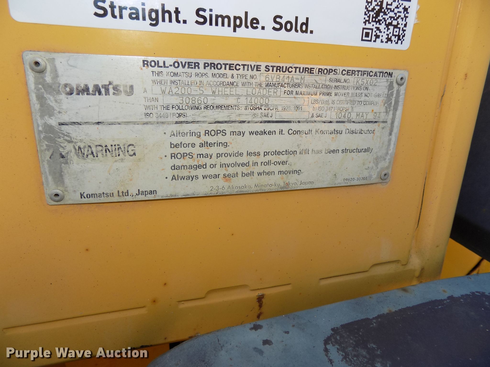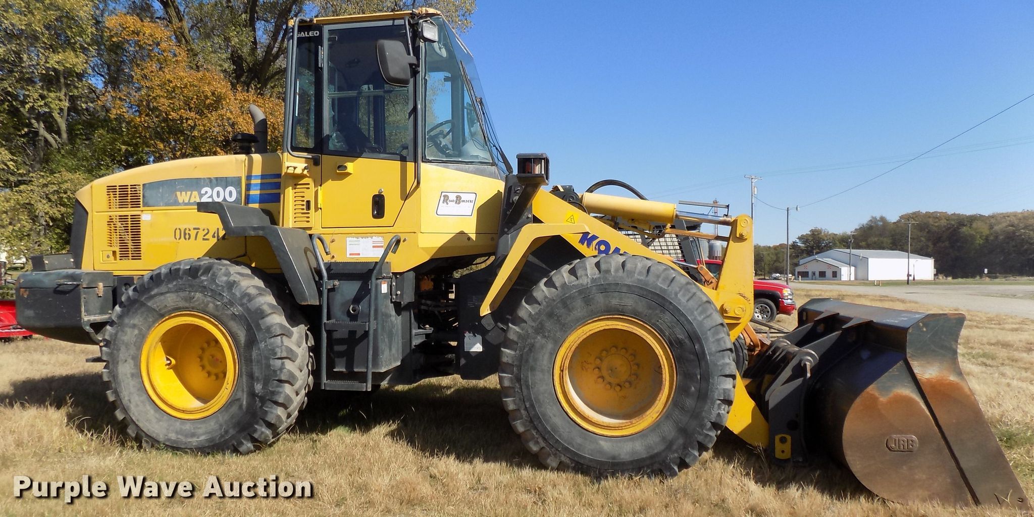 Purple Wave is selling a used Wheel Loader in Nebraska. This item is a 2006 Komatsu WA200-5 wheel loader with the following: 7,679 hours on meter, Komatsu 5.9L L6 diesel engine, 128 HP, Serial 26370494, Powershift transmission, 4F-4R gears, EROPS, AC and heat, Joystick bucket controls, JRB WA200-6 bucket, 2.5 cu.yd. capacity, JRB hydraulic quick coupler, 20.5R25 tires, Manual, Serial 67242, Unit# 067242