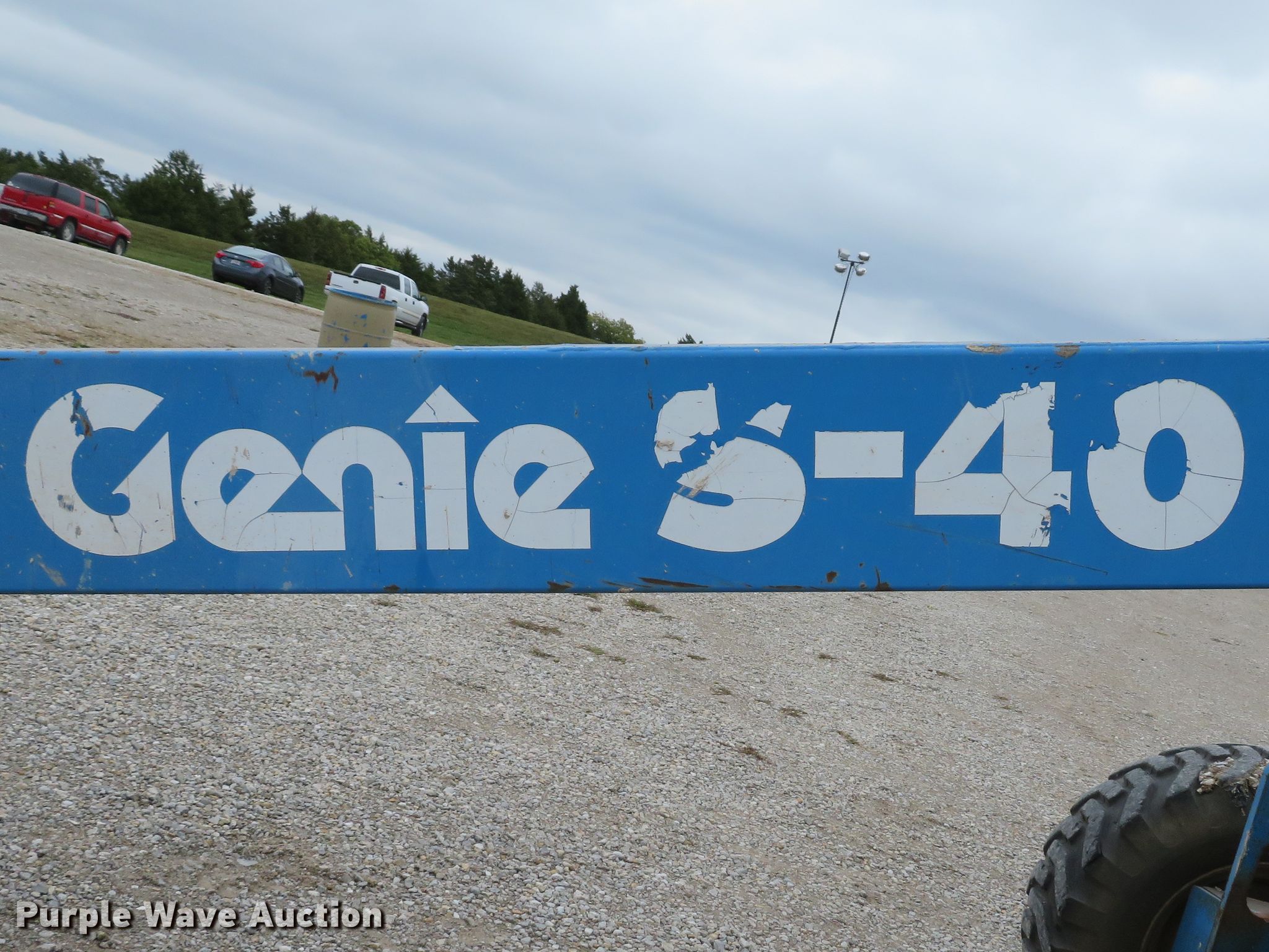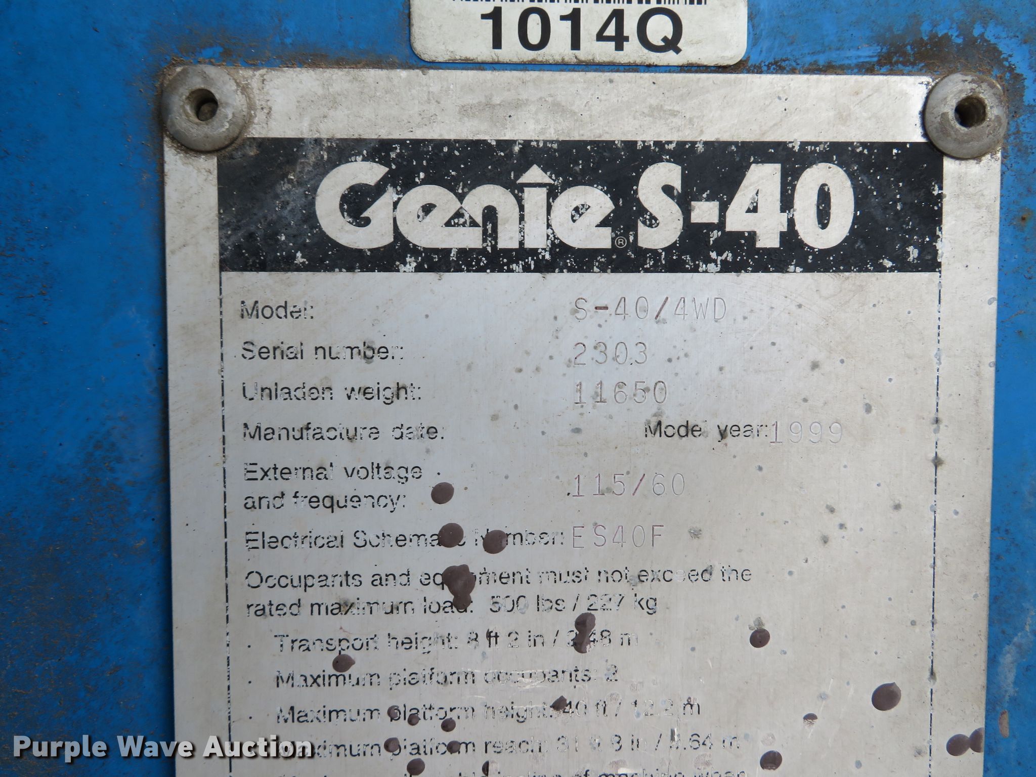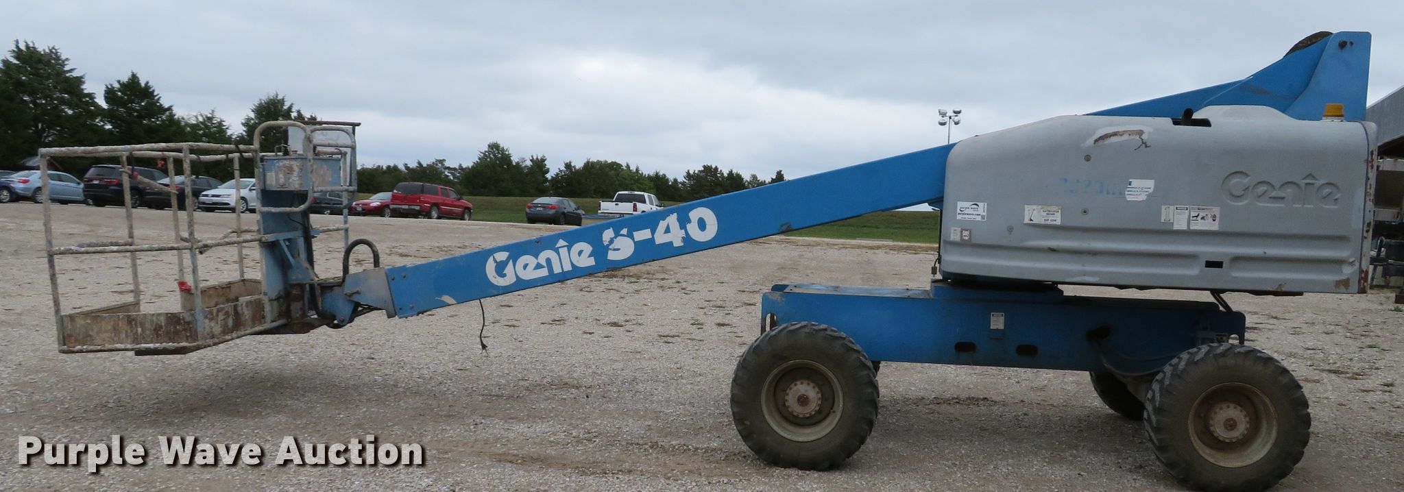 Purple Wave is selling a used Boom Lift in Missouri. This item is a 1999 Genie S40 boom lift with the following: 4,476 hours on meter, Ford LRG-425 EFI four cylinder dual fuel engine, Gas and propane capable, 500 lbs maximum lift capacity, 31'8" maximum reach, 40' maximum lift height, 33"L x 93"W platform, Platform and ground controls, Hydraulic platform rotation, Hydraulic leveling, 12-16.5 foam filled tires, Serial 2303