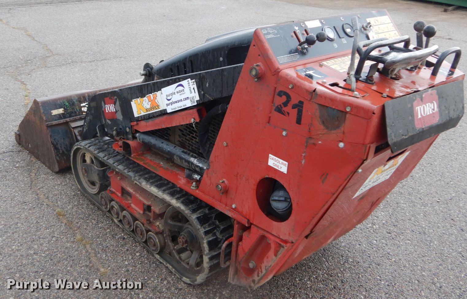 Purple Wave is selling a used Compact Utility Loader in Missouri. This item is a 2013 Toro TX427 compact utility loader with the following: 1,438 hours on meter, Kohler gas engine, 27 HP, Hydrostatic transmission, Hand bucket controls, 34"W bucket, Manual quick coupler, Auxiliary hydraulics, 6"W tracks, Serial 313000199, Unit# 21