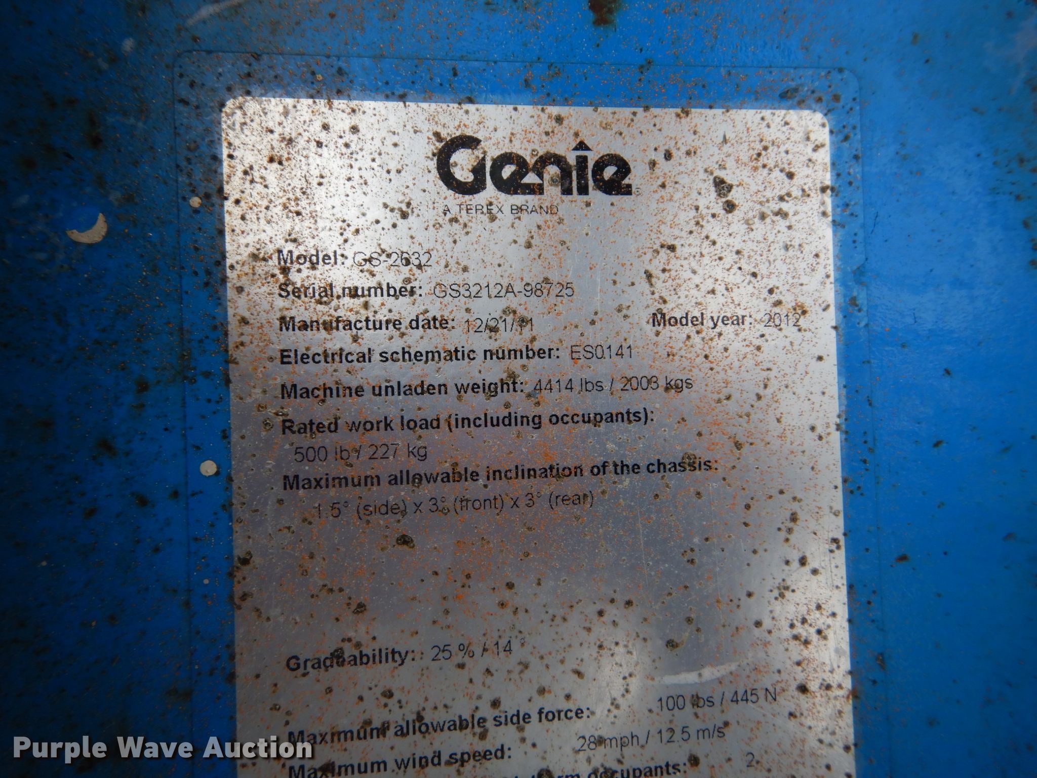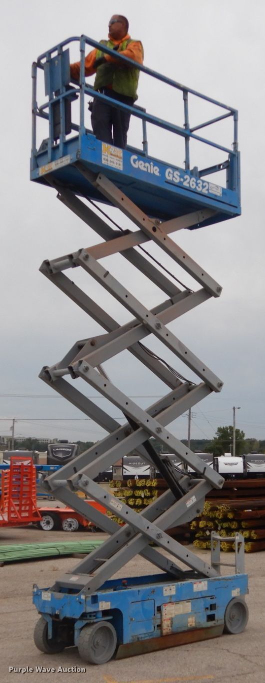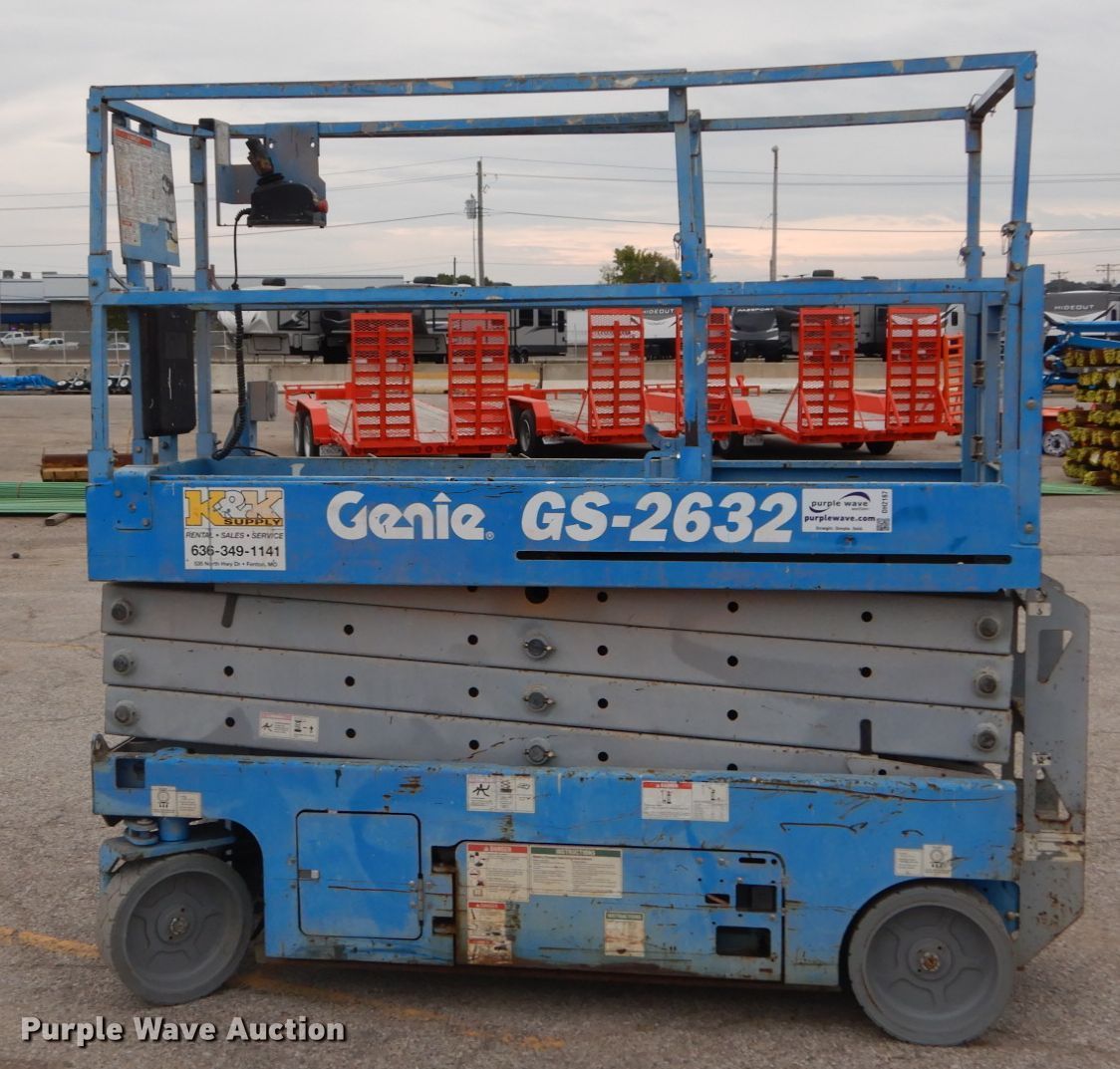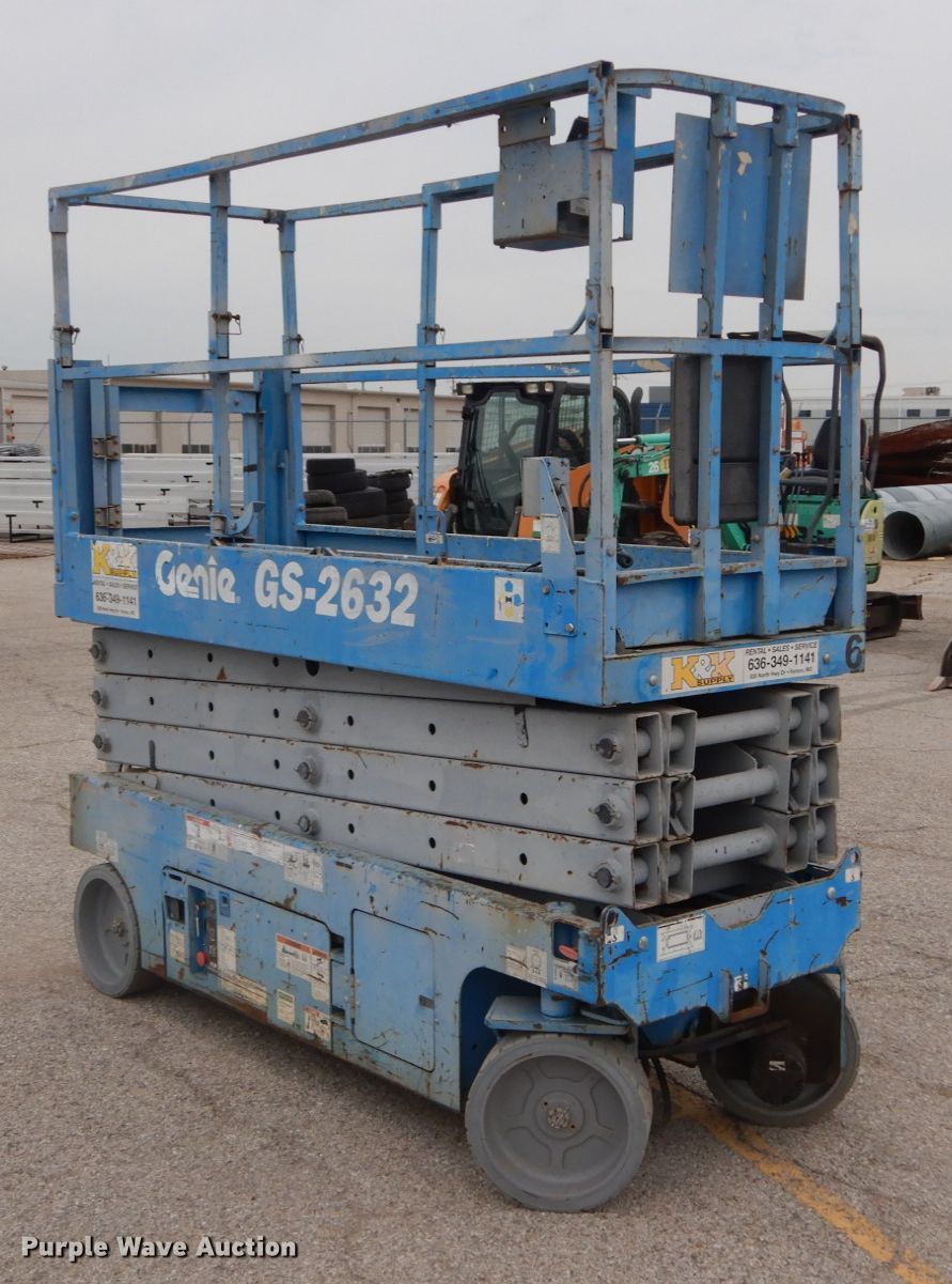 Purple Wave is selling a used Scissor or Vertical Lift in Missouri. This item is a 2012 Genie GS-2632 scissor lift with the following: 225 hours on meter, Electric operation, 500 lbs maximum lift capacity, 26' maximum lift height, 7'L x 2.5'W platform, Manual platform extensions, AC power outlet, Platform controls, 15 x 5 x 11 1/4 tires, Serial GS3212A98725
