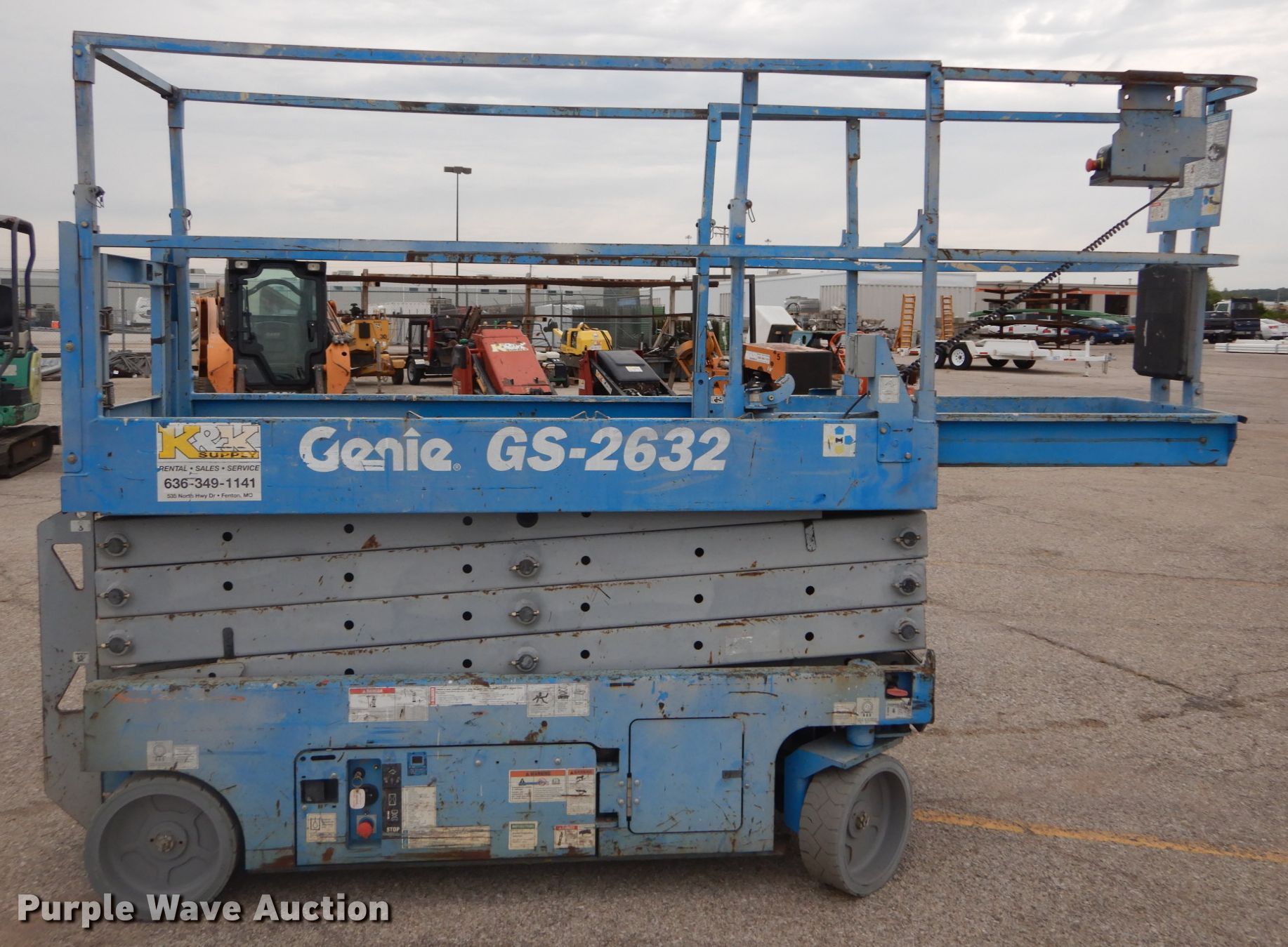 2012 Genie GS-2632 scissor lift. 225 hours on meter, Electric operation, 500 lbs maximum lift capacity, 26' maximum lift height, 7'L x 2.5'W platform Manual platform extensions, AC power outlet, Platform controls, 15 x 5 x 11 1/4 tires, Serial GS3212A98725. K & K Supply. 535 N Hwy Dr. Fenton, MO 63026