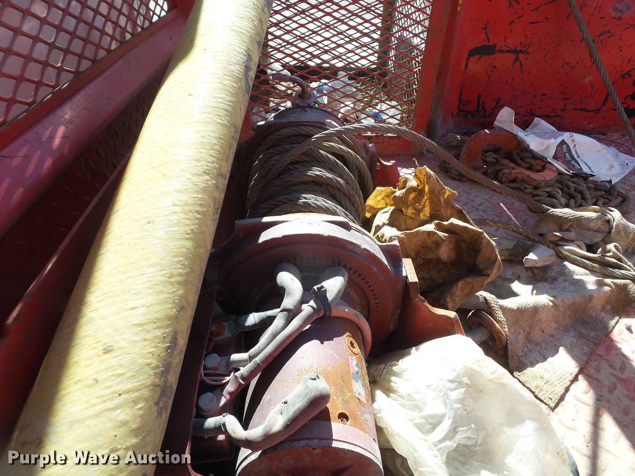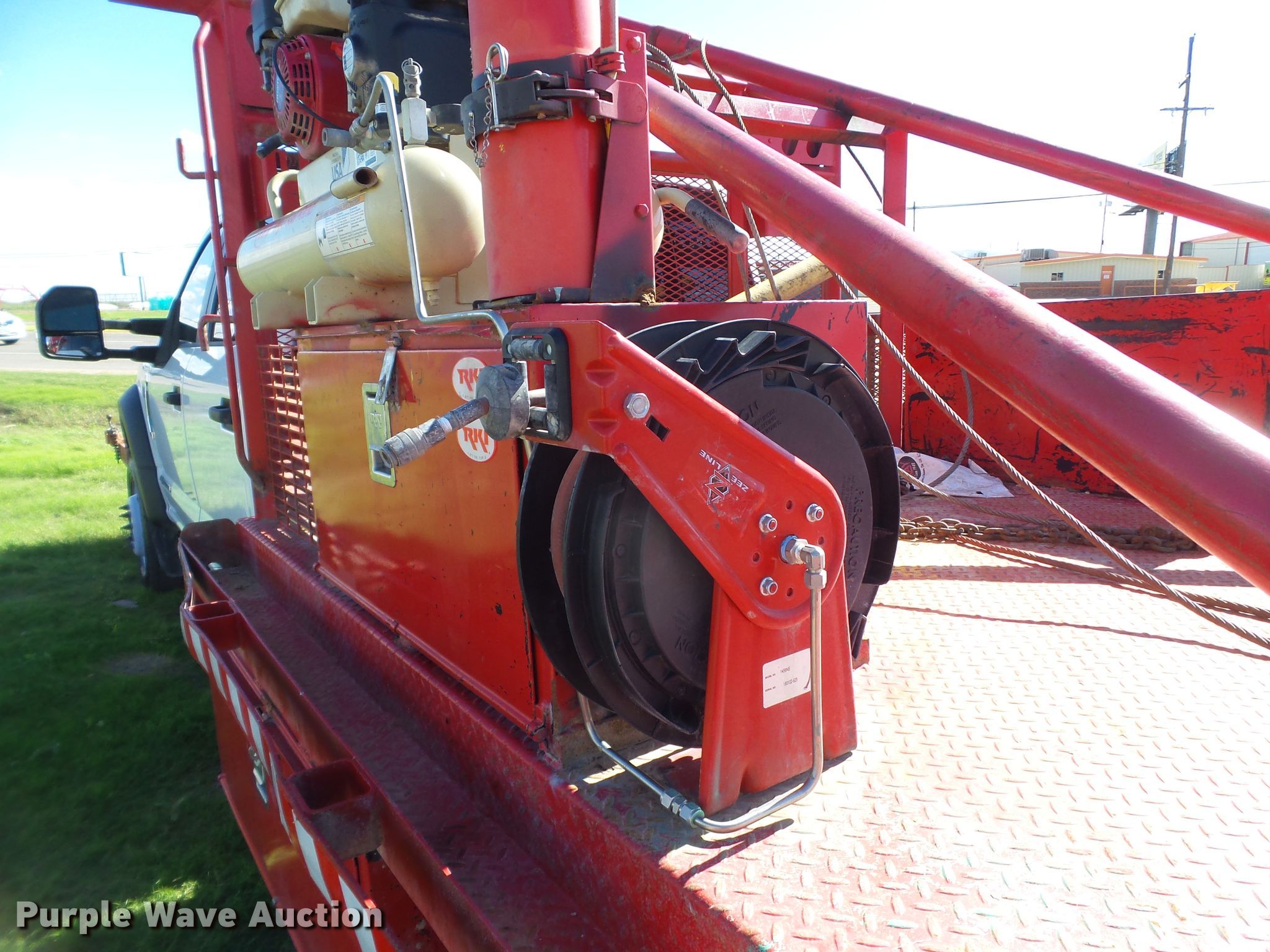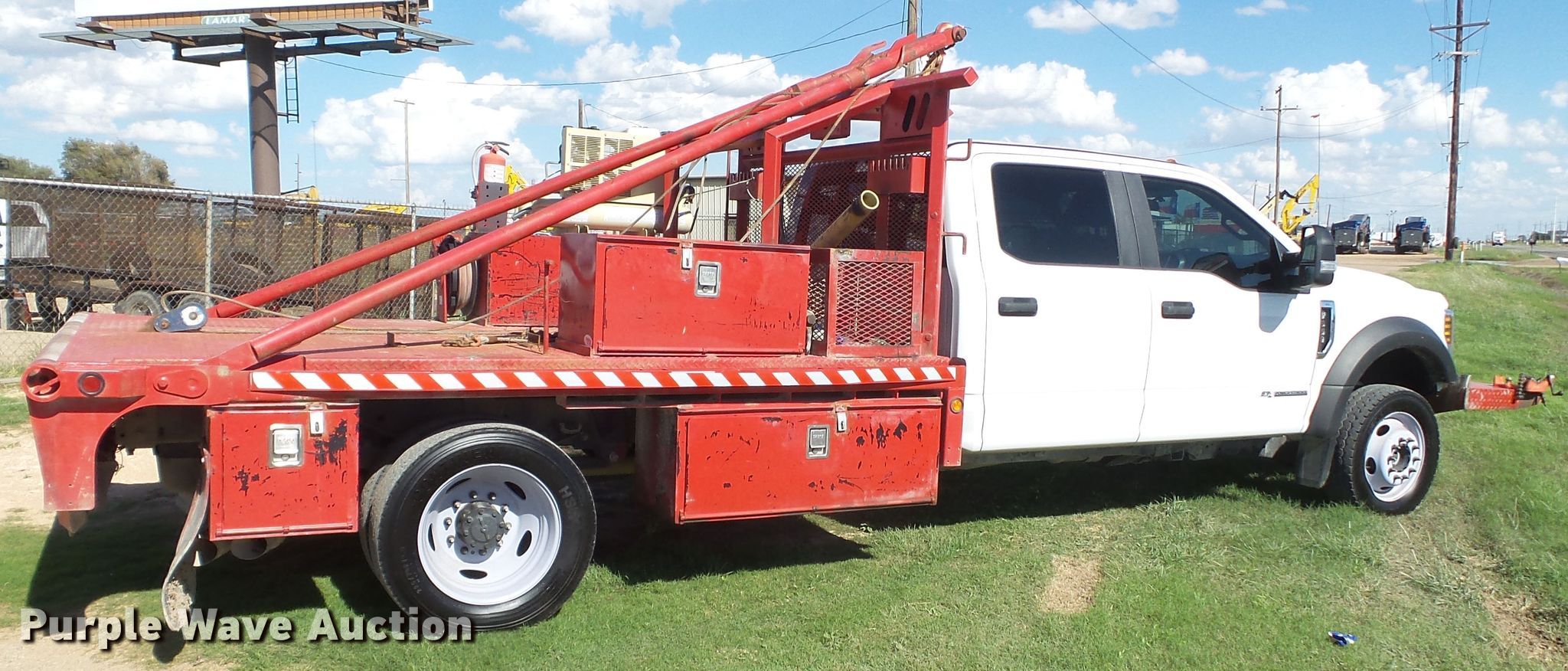 Purple Wave is selling a used Service Truck in Texas. This item is a 2018 Ford F550 Super Duty Crew Cab winch truck with the following: 57,582 miles on odometer, 6.7L V8 OHV 16V diesel engine, 330 HP, Automatic transmission, Single axle, Four wheel drive, AC and heat, 11.5'L x 8'7"W utility bed, Tulsa winch, 161"L gin poles, Rolling tailboard, Ingersoll Rand air compressor, Honda GX160 gas engine, Spring suspension, Hydraulic brakes, 225/70R19.5 tires