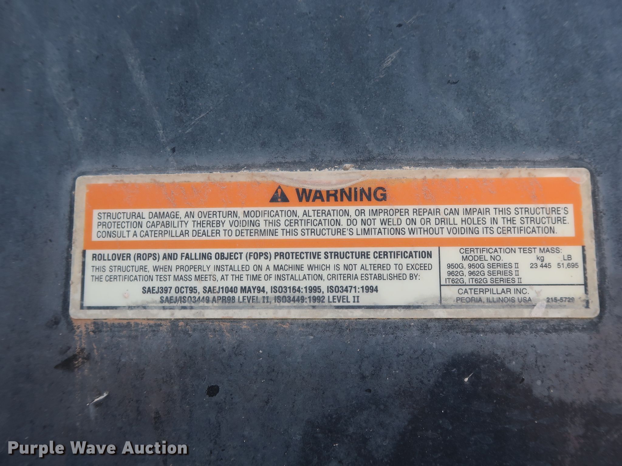 Purple Wave is selling a used Wheel Loader in Oklahoma. This item is a 2005 Caterpillar 950G Series II wheel loader with the following: 17,808 hours on meter, Caterpillar 3126 7.2L six cylinder diesel engine, 197 HP, Powershift transmission, 4F-4R gears, EROPS, AC and heat, Joystick bucket controls, Ride control, Caterpillar 100"W general purpose bucket, Bolt-on cutting edge, 23.5R25 tires, Serial CAT0950GTAXX01319, Unit# 206230