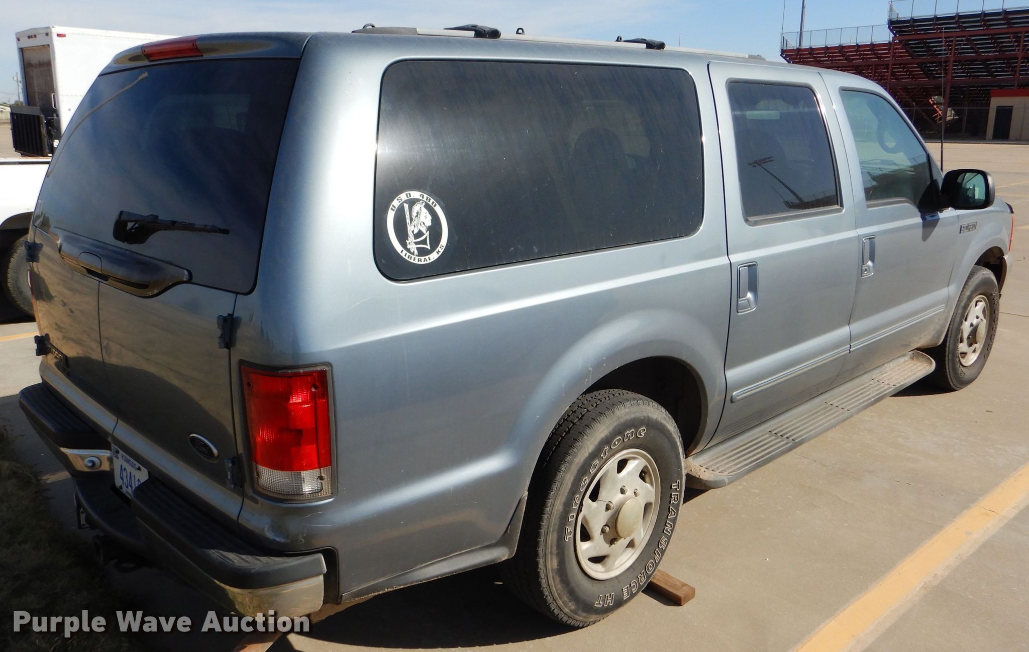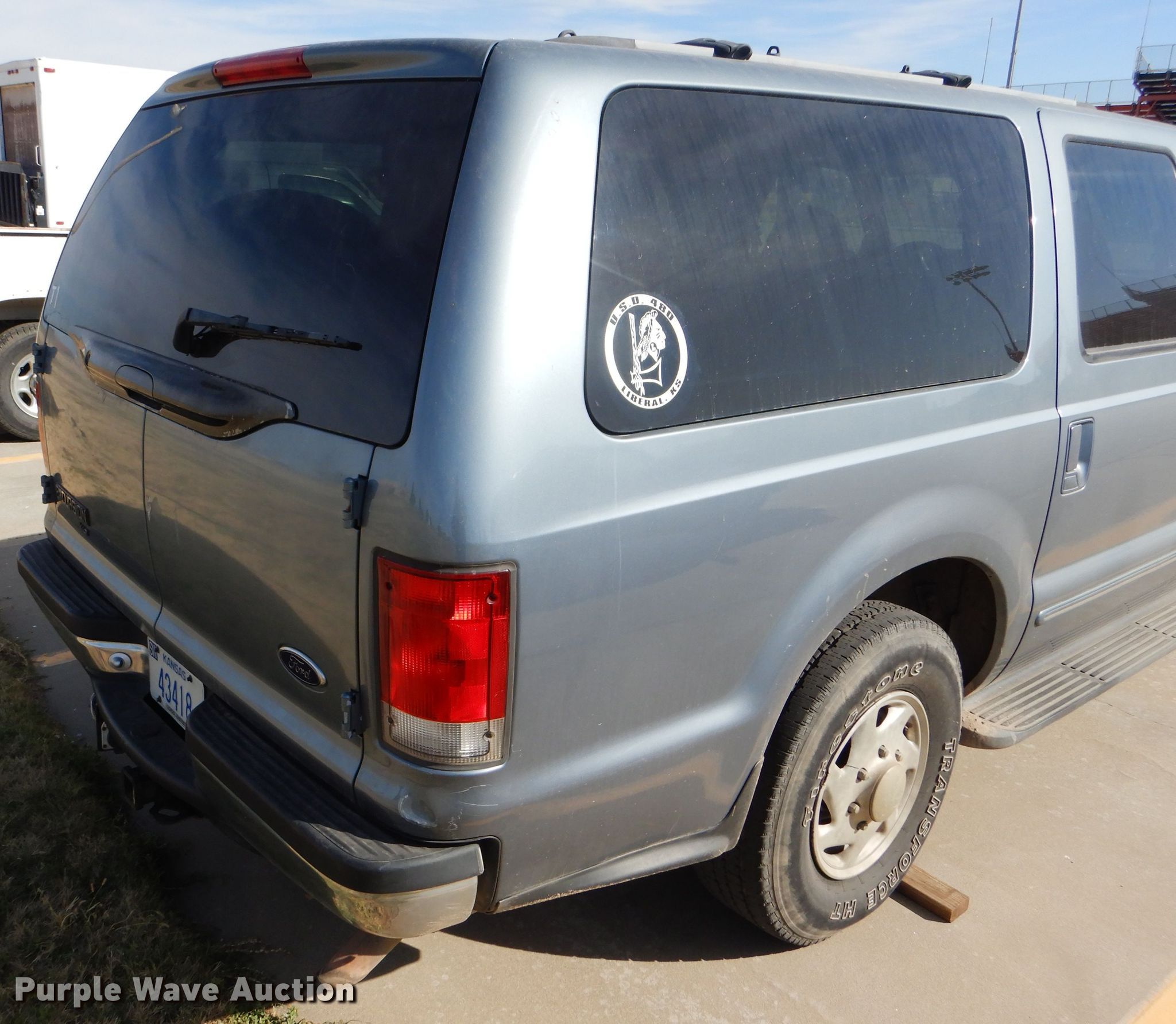 2000 Ford Excursion SUV. 189,429 miles on odometer, 5.4L V8 SOHC 16V gas engine, Automatic transmission, AC and heat, Cruise, Power windows and locks, 265/75R16 tires, Ignition column locked, Unit will not start or move, Unknown operating condition. Kansas title. 1FMNU40L7YED72876. Liberal School Bus Barn. 1703 W 4th St. Liberal, KS 67901