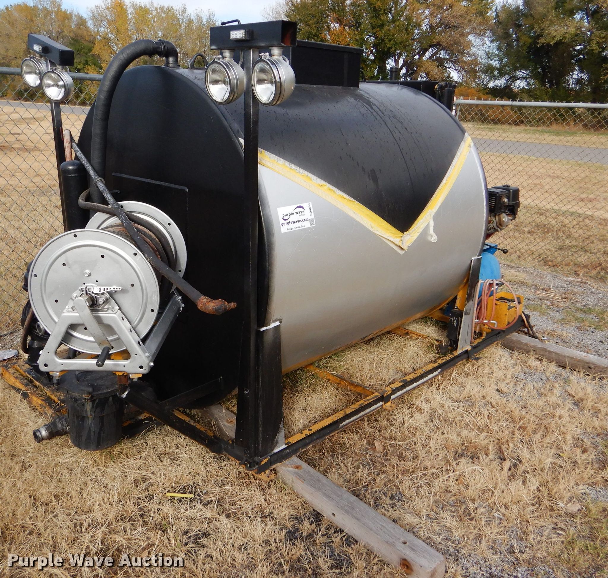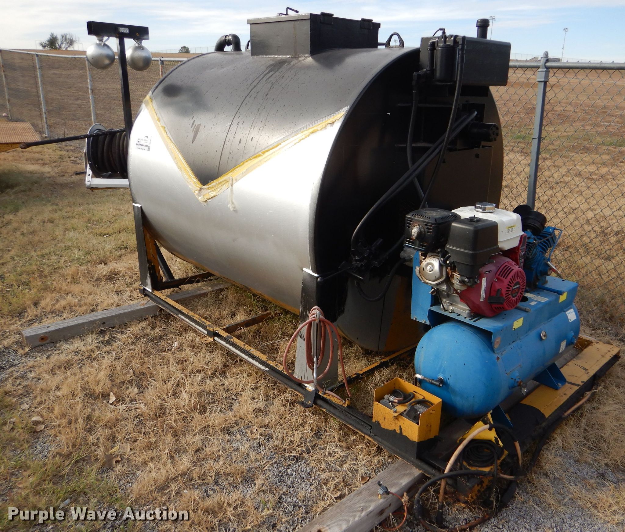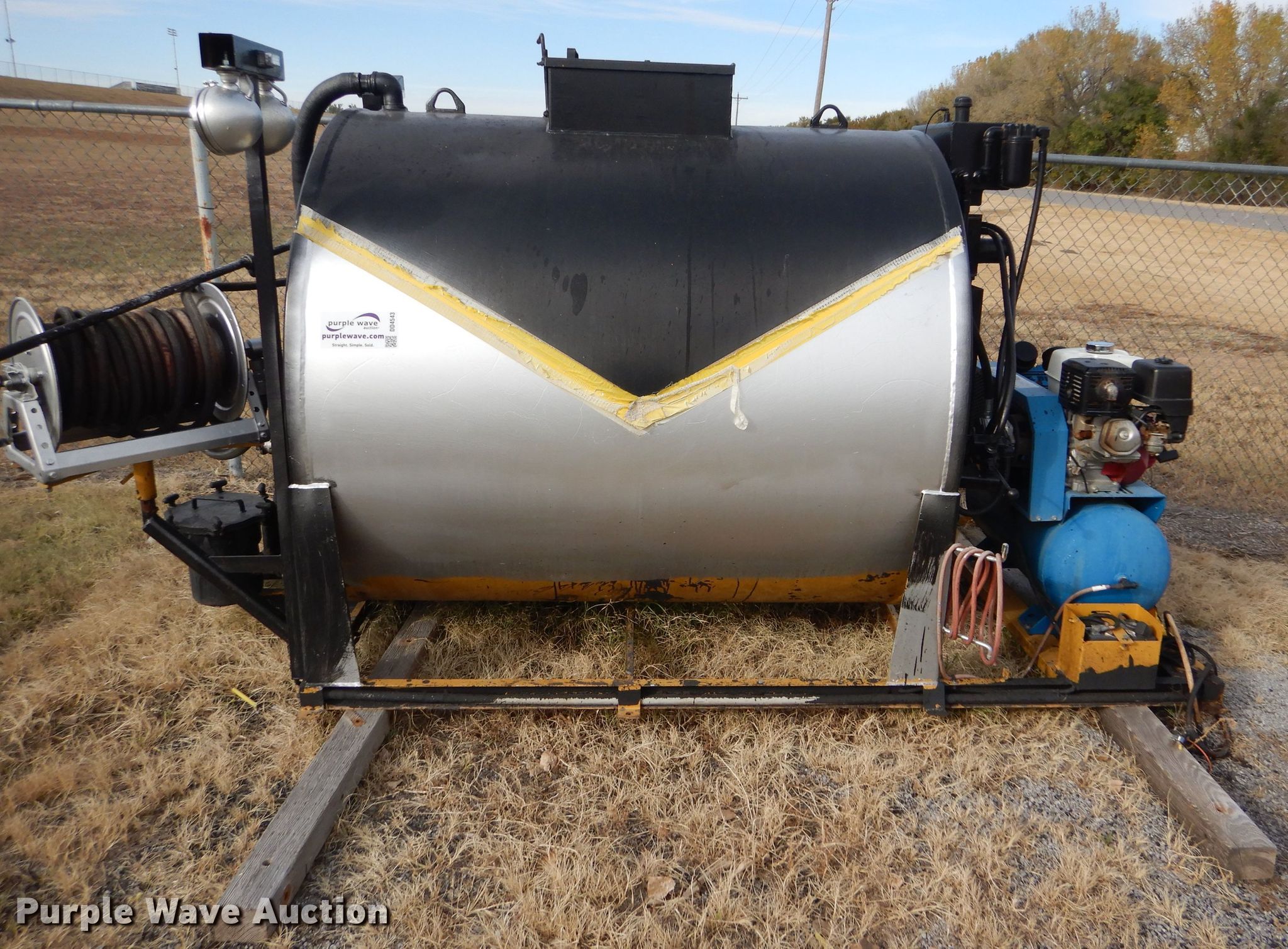 Purple Wave is selling a used Pot Hole Patcher in Kansas. This item is a Seal-rite SR-850 seal coater with the following: 130" x 74" x 73", 850 gallon tank, Jenny air compressor, Honda GX390 gas engine, Hydraulic agitation, 25"W manway, Hose reel with spray wand, Skid mounted, Dead battery, Unknown operating condition