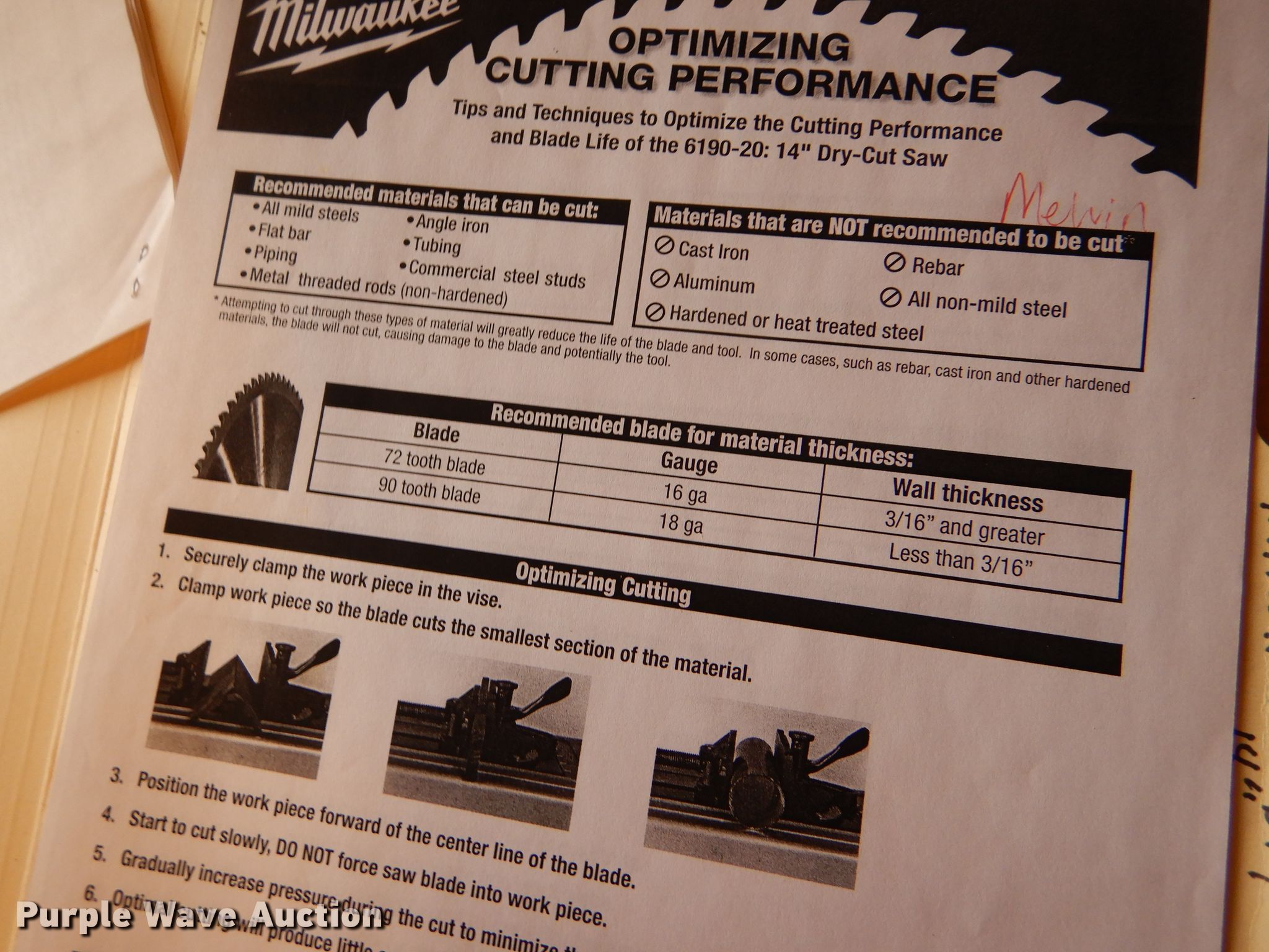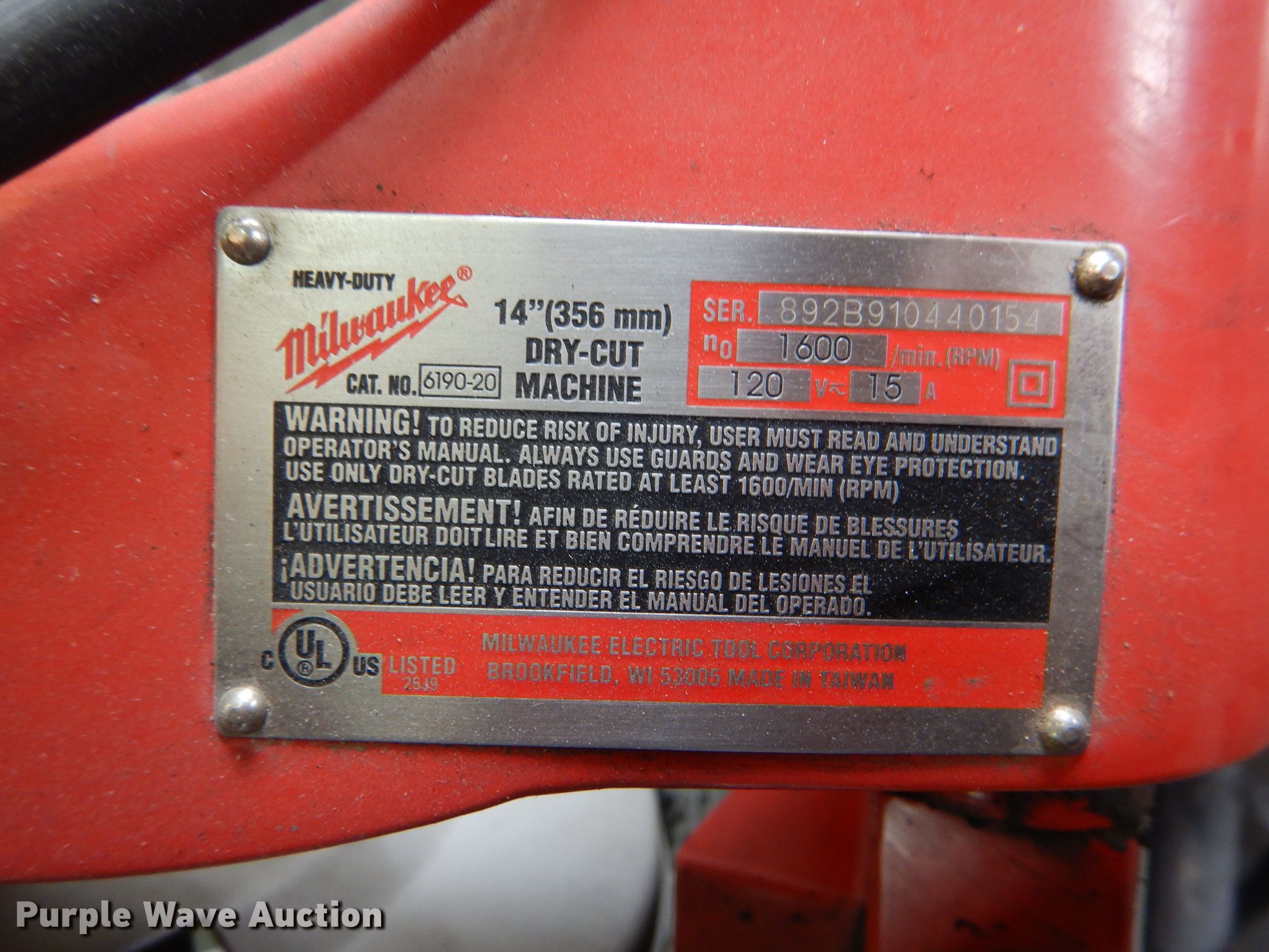 Purple Wave is selling a used Tools in Kansas. This item is a Milwaukee dry-cut saw with the following: 14", 1,600 RPM, 12V, 72 or 90 tooth blade recommended, Serial 892B910440154