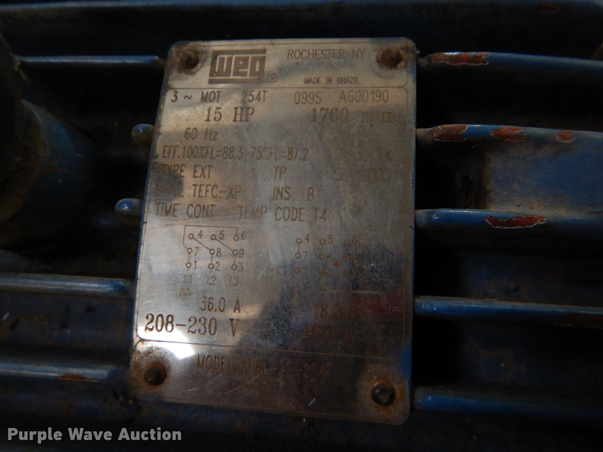 WEG electric motor. 208-220V, 460V, 15 HP, Three phase, Unit has not been used in four years, Unknown operating condition. City of Meade. 623 Carthage St. Meade, KS 67864