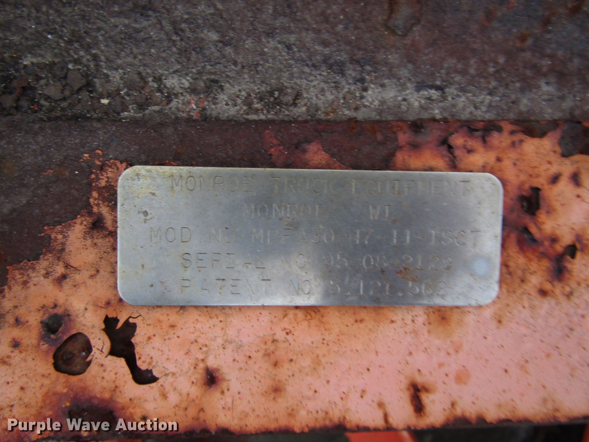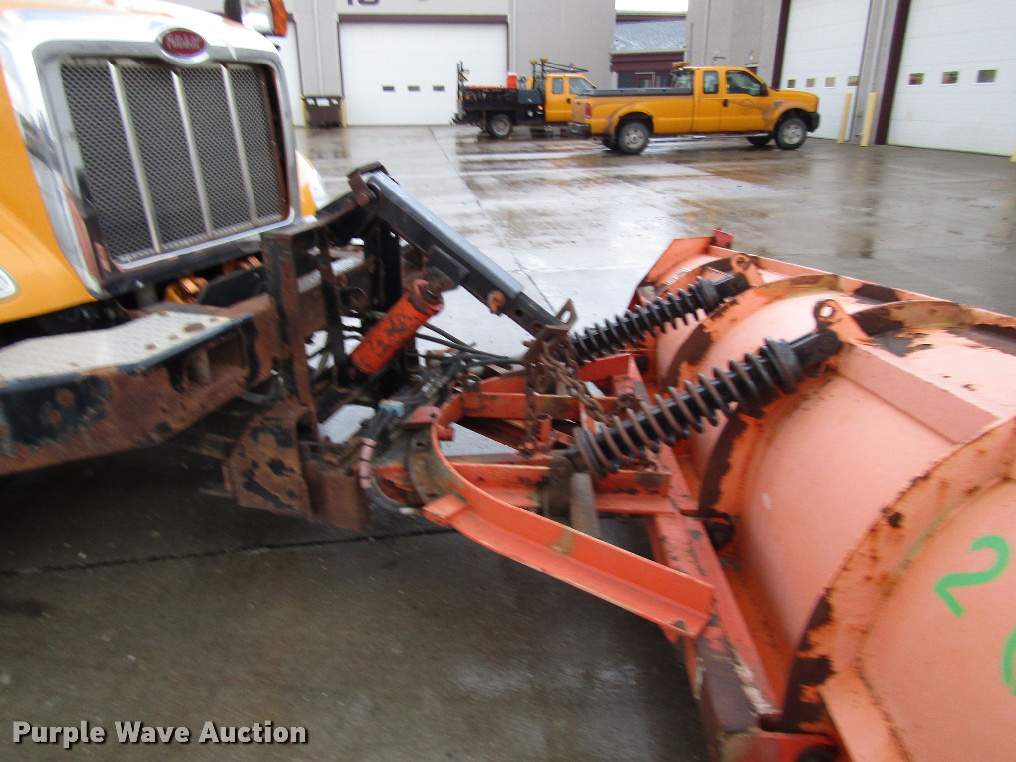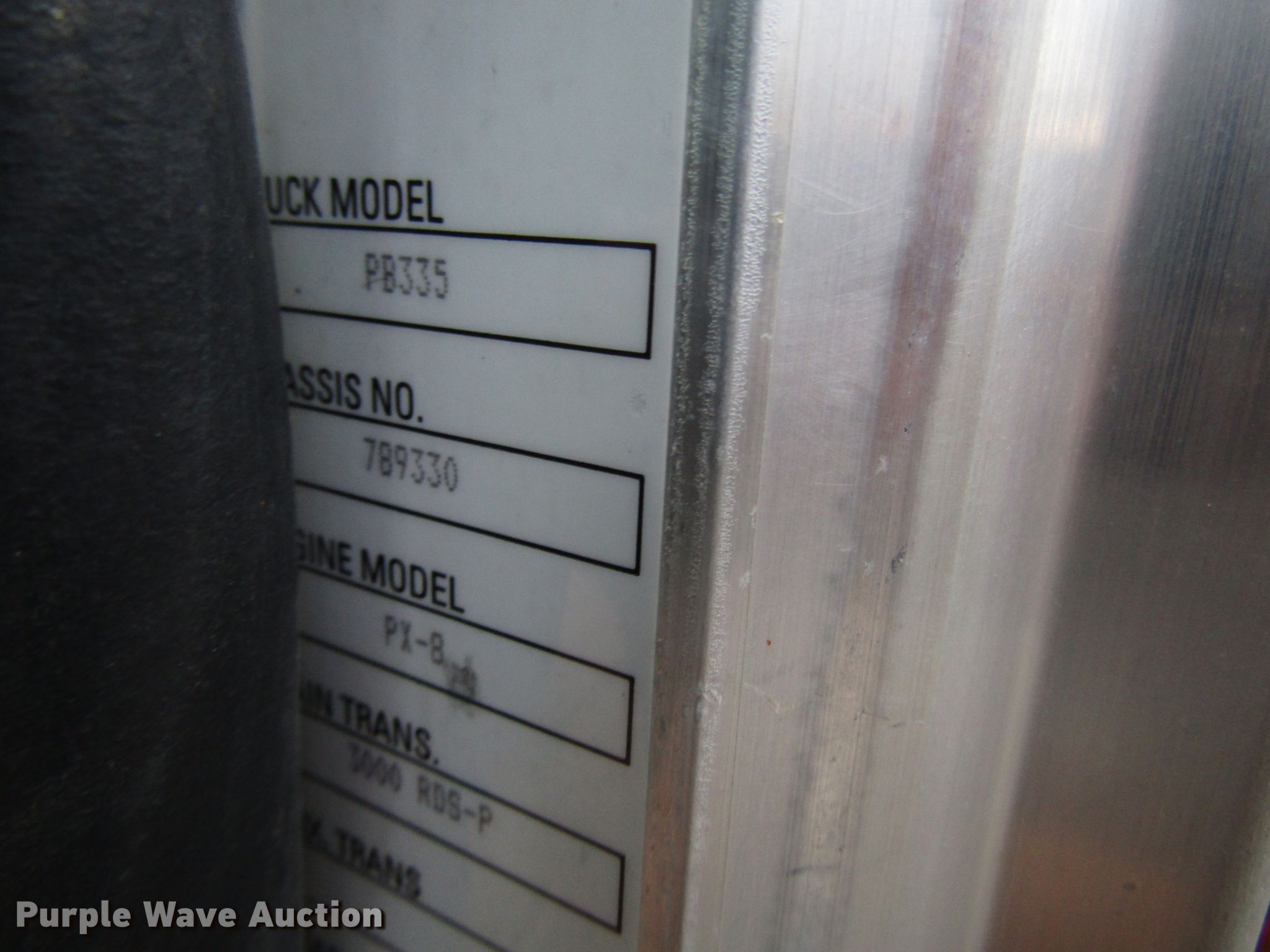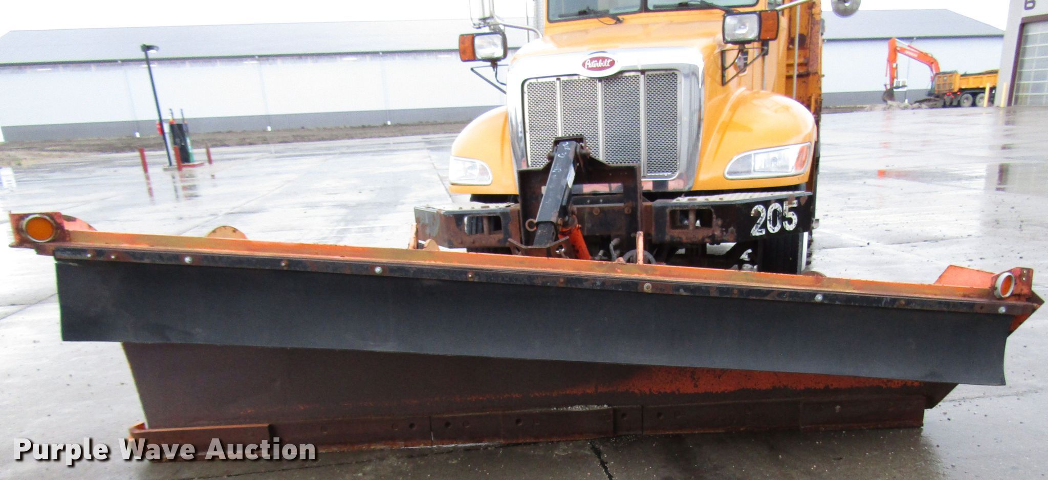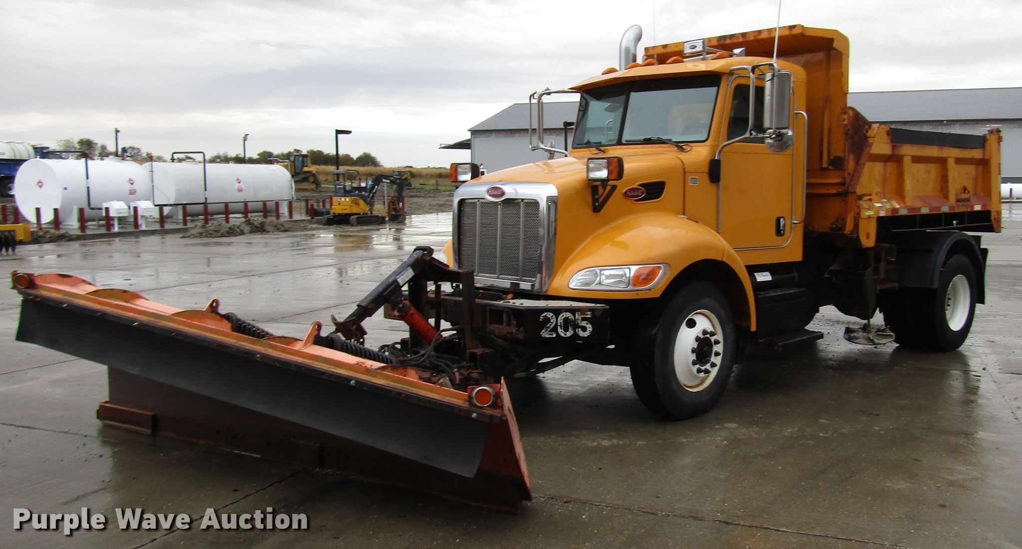 Purple Wave is selling a used Construction Dump Truck in Iowa. This item is a 2009 Peterbilt 335 dump truck with the following: 228,998 miles on odometer, 9,781 hours on meter, Paccar PX-8 8.3L L6 diesel engine, Automatic transmission, Single axle, Inter-axle differential lock, AC and heat, Power windows, Heated mirrors, PTO, American OI-85STD steel dump bed, 10.5'L x 96"W, 26" side height, 5.5" side board height, Bed vibrator, Single ram hoist, Air operated end gate, American OI85STD spreader, Monroe MPFA304711ISCT plow, 132"W, Air suspension, Air brakes, 168" wheelbase, 11R22.5 tires, GVWR 33,000 lbs, FAWR 12,000 lbs, RAWR 21,000 lbs, Unit# 205