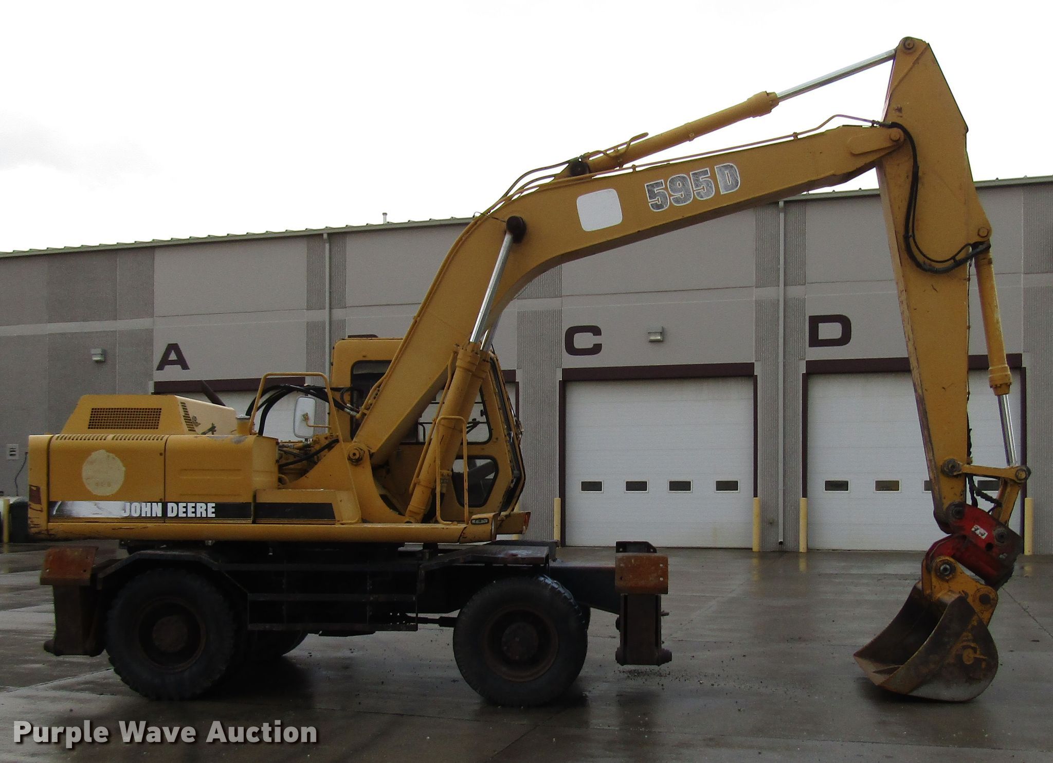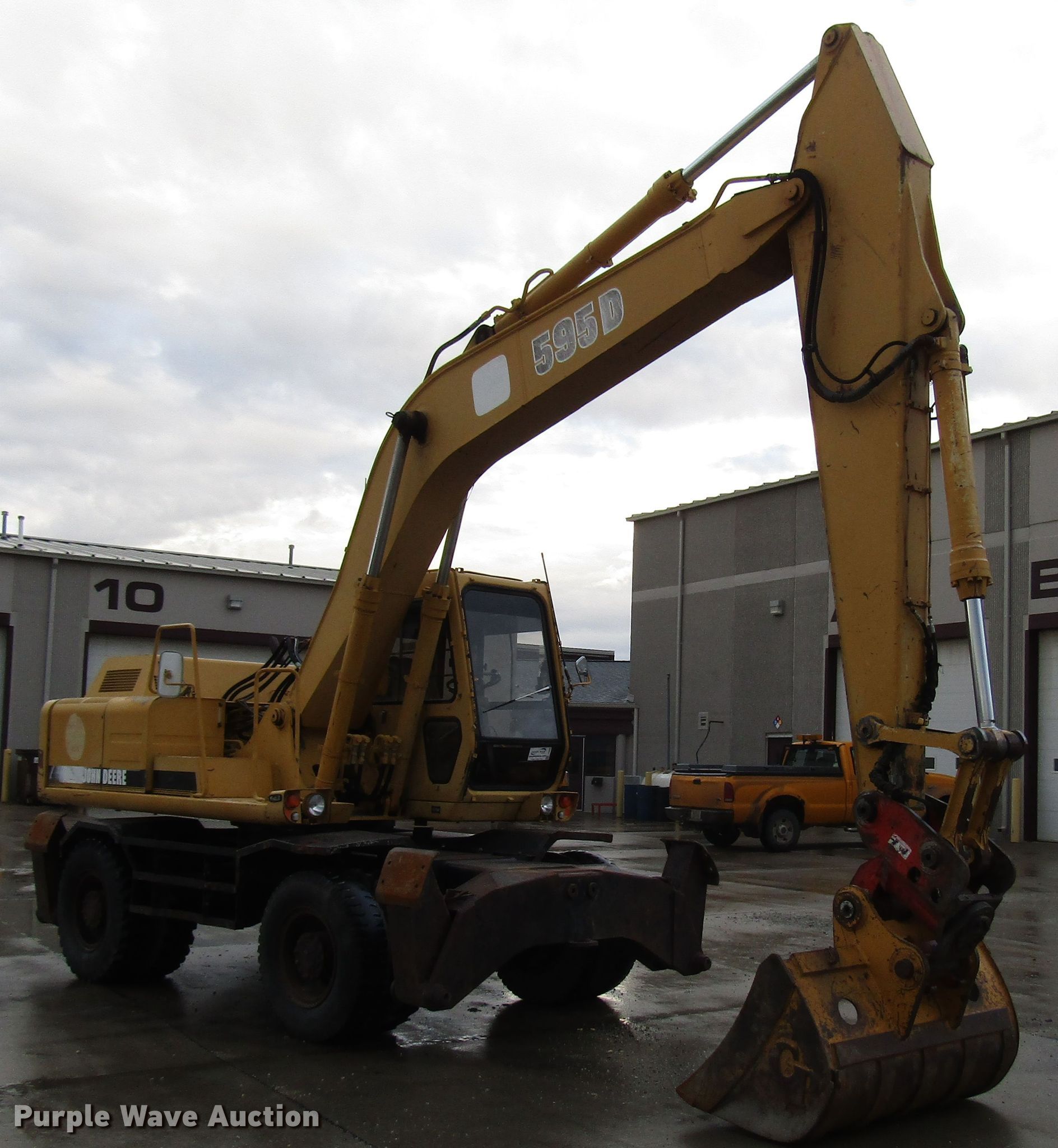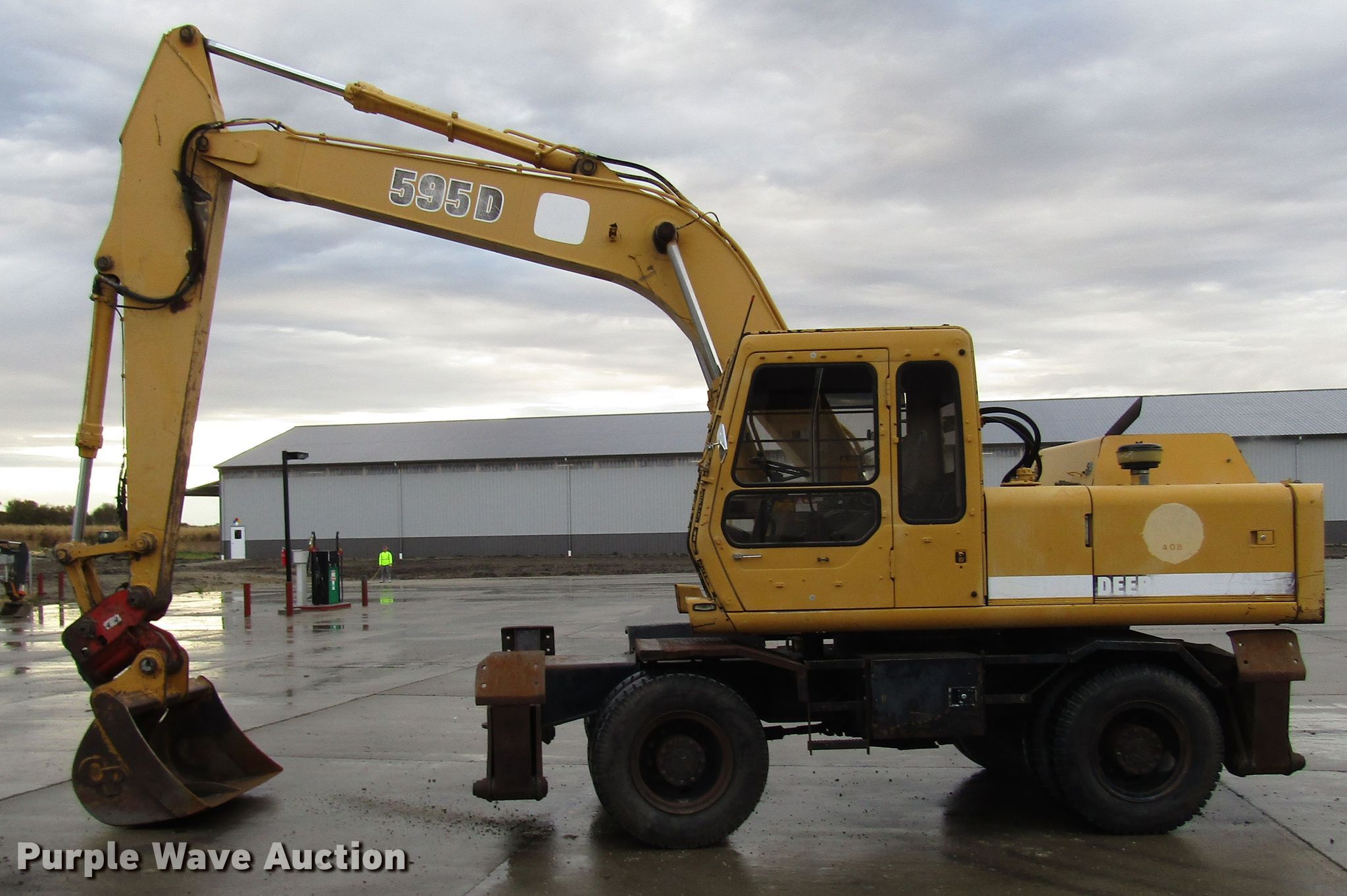 Purple Wave is selling a used Rubber Tired Excavator in Iowa. This item is a 1994 John Deere 595D rubber tire excavator with the following: 8,525 hours on meter, John Deere four cylinder diesel engine, Two speed hydrostatic transmission, EROPS, AC and heat, Pattern changer, Standard boom, 10'2" stick length, 60"W bucket, Weld-on cutting edge, Bucket rotation, Counter weights, 10.00-20 tires, Intermittent outrigger issues, Serial FF595DS001374