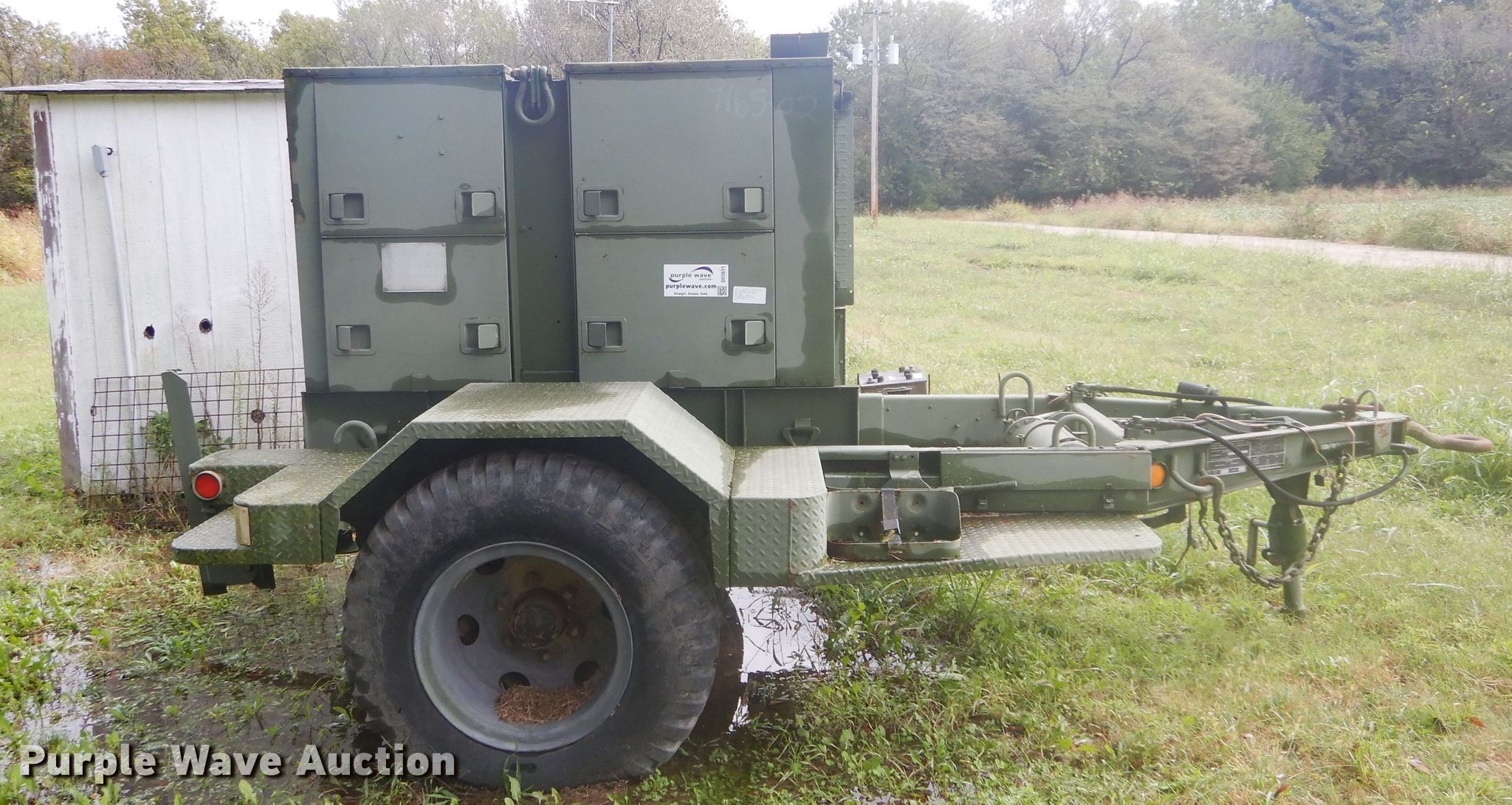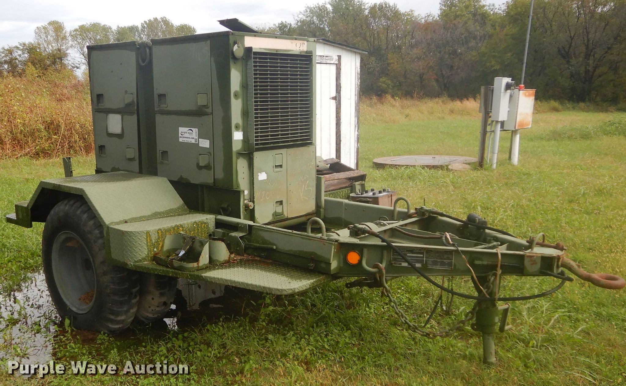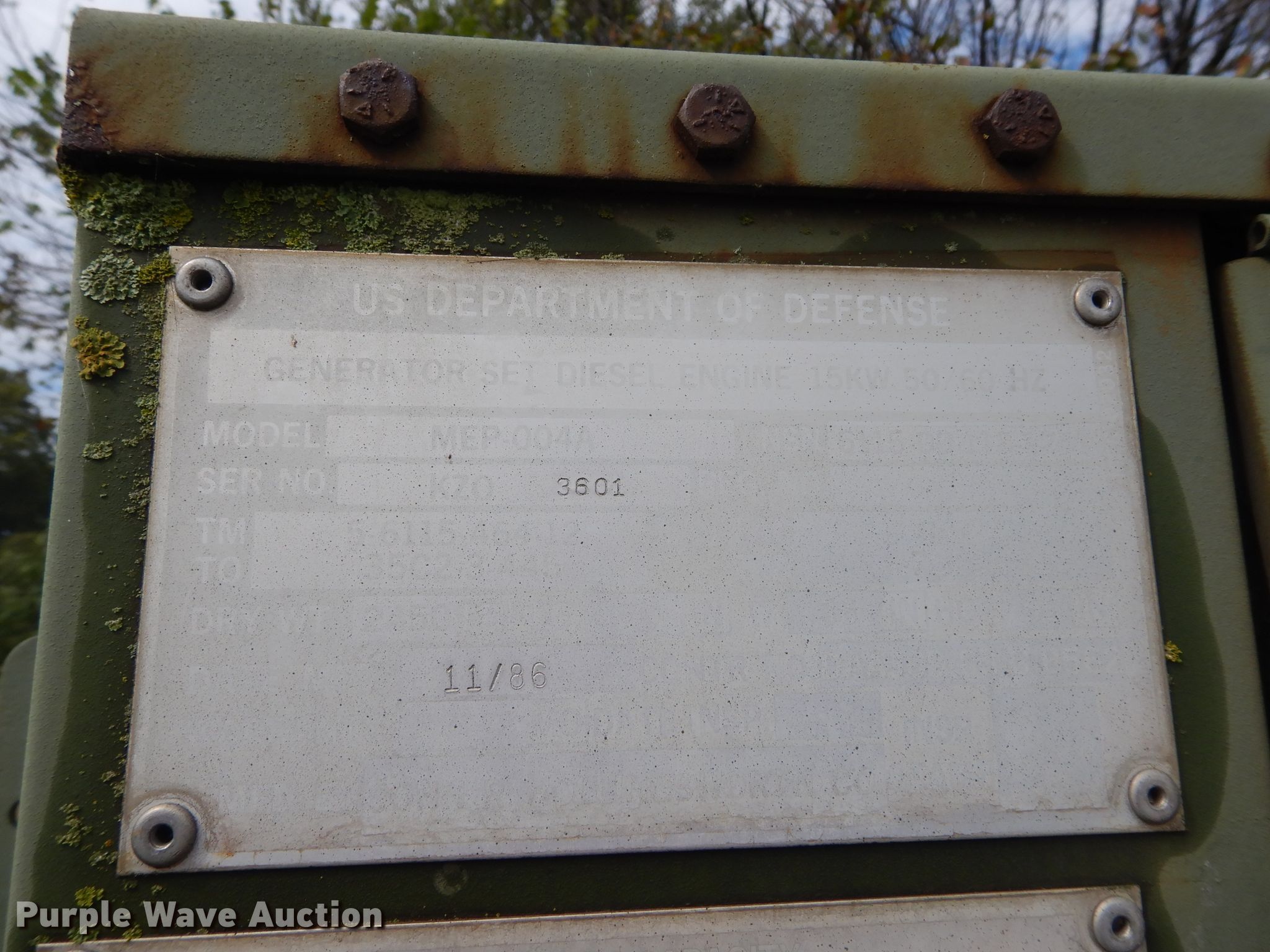 Purple Wave is selling a used Generator Set in Kansas. This item is a 1986 Military MEP004A generator with the following: 795 hours on meter, White four cylinder diesel engine, 15 kW, Three phase, Fuel tank, Pintle hitch, 9.00-20 tires, Unknown operating condition, Serial KZ03601