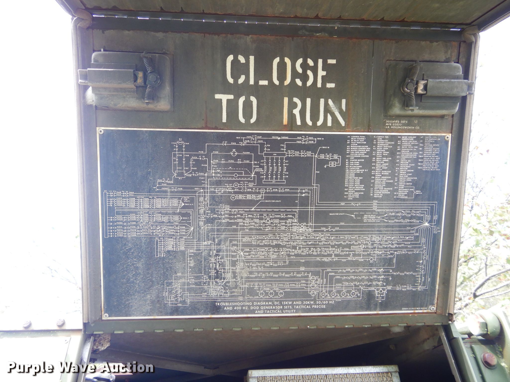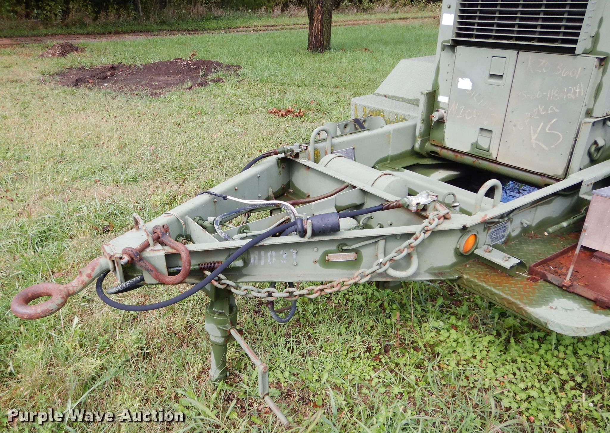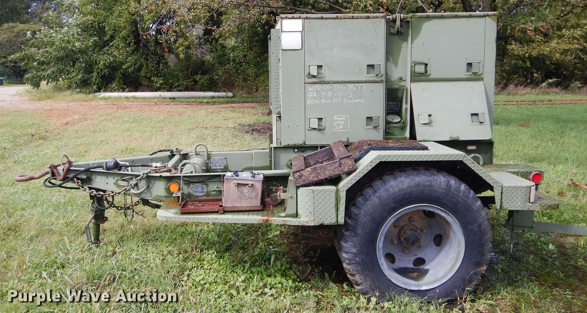 Purple Wave is selling a used Generator Set in Kansas. This item is a 1986 Military MEP004A generator with the following: 795 hours on meter, White four cylinder diesel engine, 15 kW, Three phase, Fuel tank, Pintle hitch, 9.00-20 tires, Unknown operating condition, Serial KZ03601