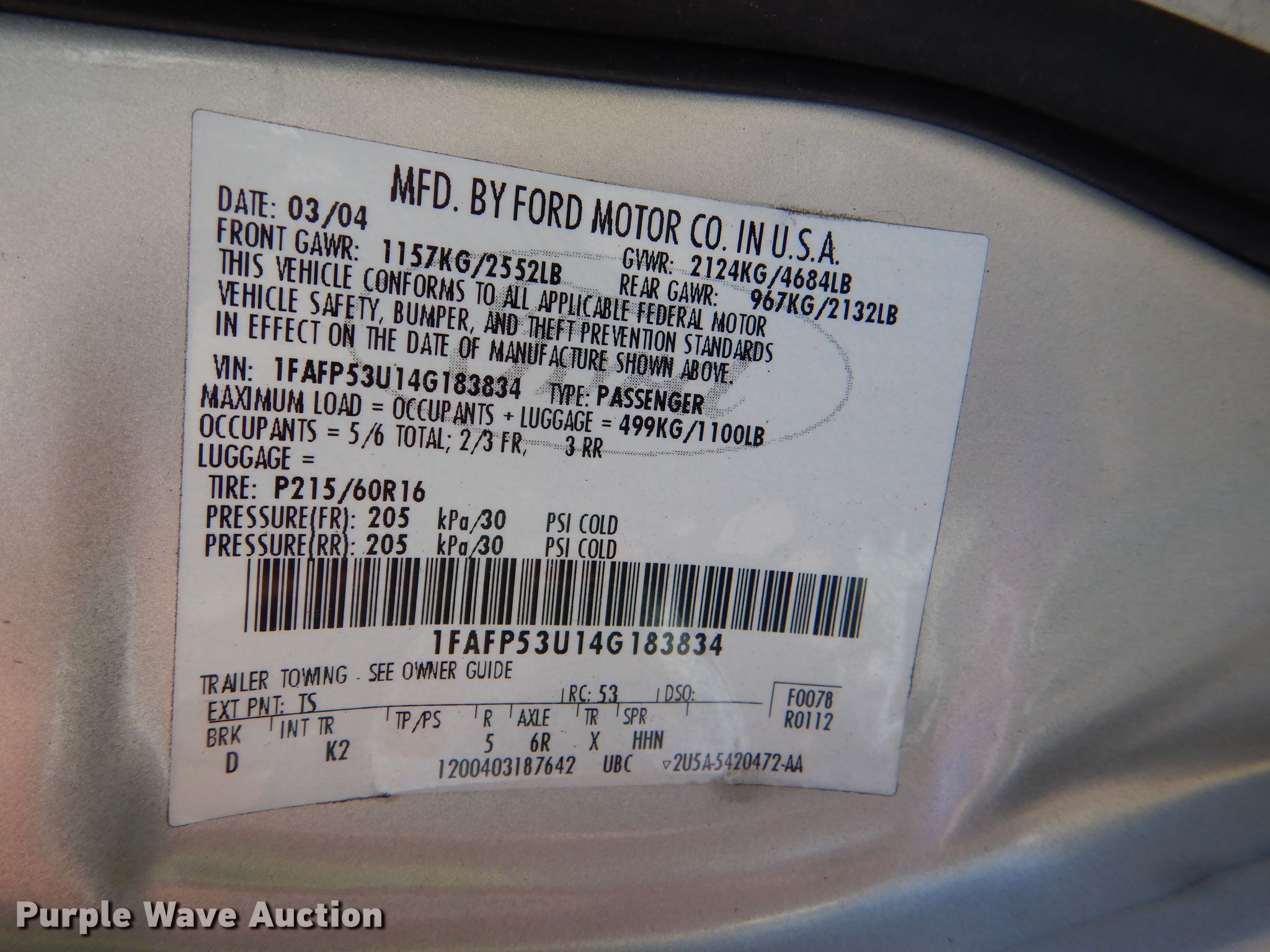 Purple Wave is selling a used Passenger Vehicle in Kansas. This item is a 2004 Ford Taurus with the following: 96,024 miles on odometer, 3.0L V6 OHV 12V gas engine, Automatic transmission, AC and heat, Cruise, Power windows, locks, and seat, 215/60R16 tires, Unit# AA15334