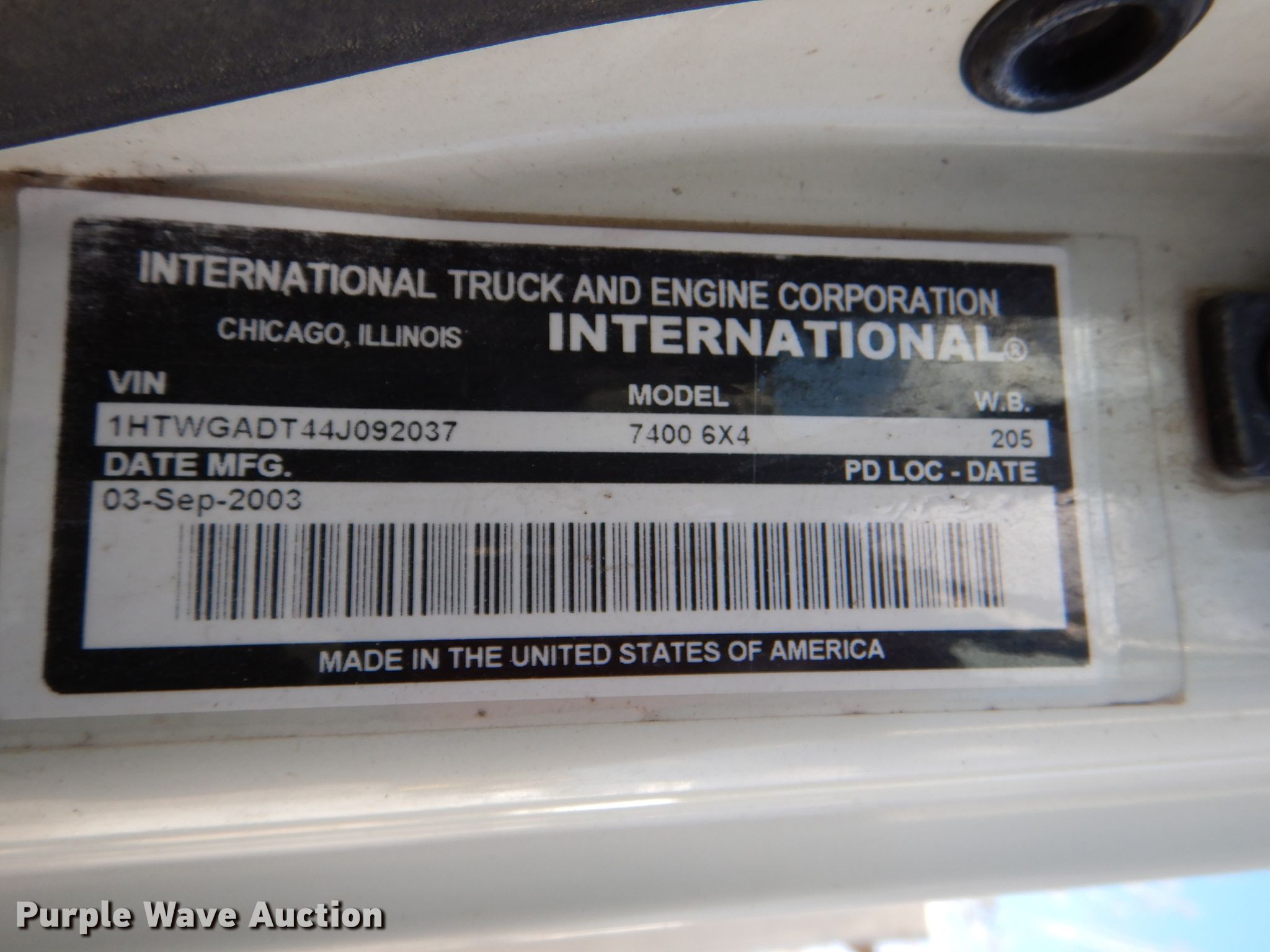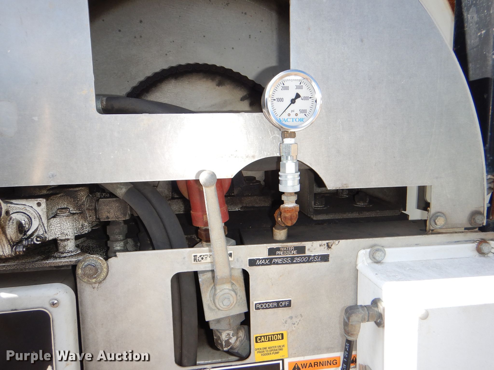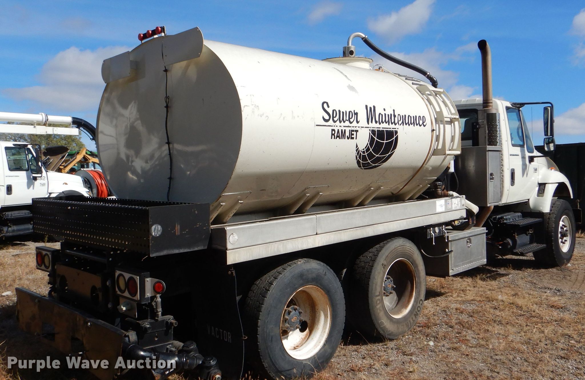 Purple Wave is selling a used Vacuum Truck in Kansas. This item is a 2004 International 7400 sewer jetter truck with the following: 59,129 miles on odometer, International DT530 8.7L L6 diesel engine, Allison 3500 automatic transmission, Tandem axle, AC and heat, Cruise, Heated mirrors, 2003 Vactor F8025 sewer jetter, Top hatch, Vactor water pump, 2,500 psi, 80 gpm, Front hydraulic hose reel, 1" hose, Serial 03-11T-1378, Spring suspension, Air brakes, 204" wheelbase, 425/65R22.5 front tires, 11R22.5 rear tires, Fender extension missing, Unit# AA211822