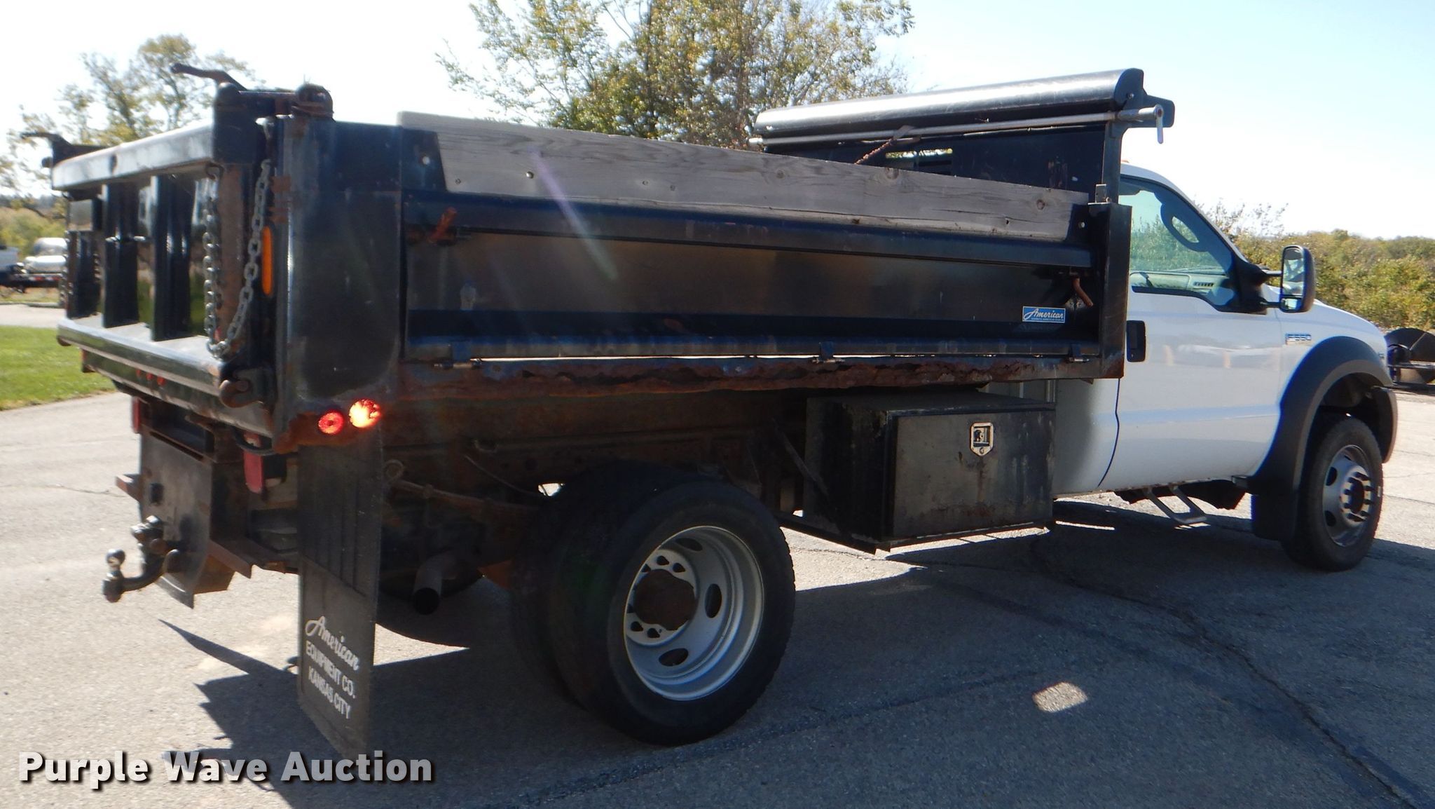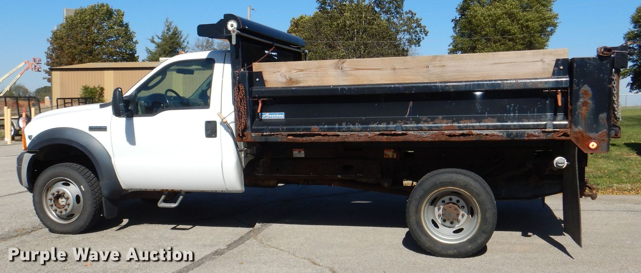 Purple Wave is selling a used Construction Dump Truck in Kansas. This item is a 2007 Ford F550 Super Duty dump truck with the following: 31,932 miles on odometer, 6.8L V10 SOHC 30V gas engine, Automatic transmission, Four wheel drive, AC and heat, Cruise, Pro Class dump bed, 11'L x 95"W, 16" side height, 8" side board height, Single cylinder electric over hydraulic hoist, Manual operated end gate, Roll tarp, Spring suspension, Hydraulic brakes, 225/70R19.5 tires, Maintenance records available upon request, ABS light on, Exhaust needs replaced