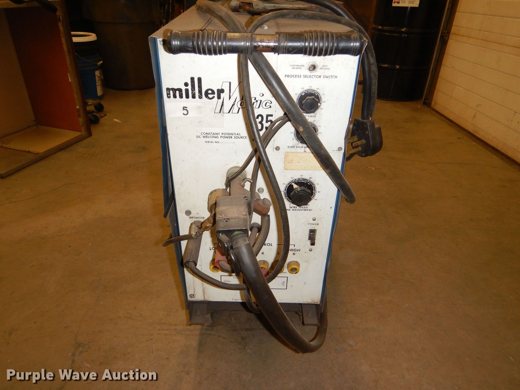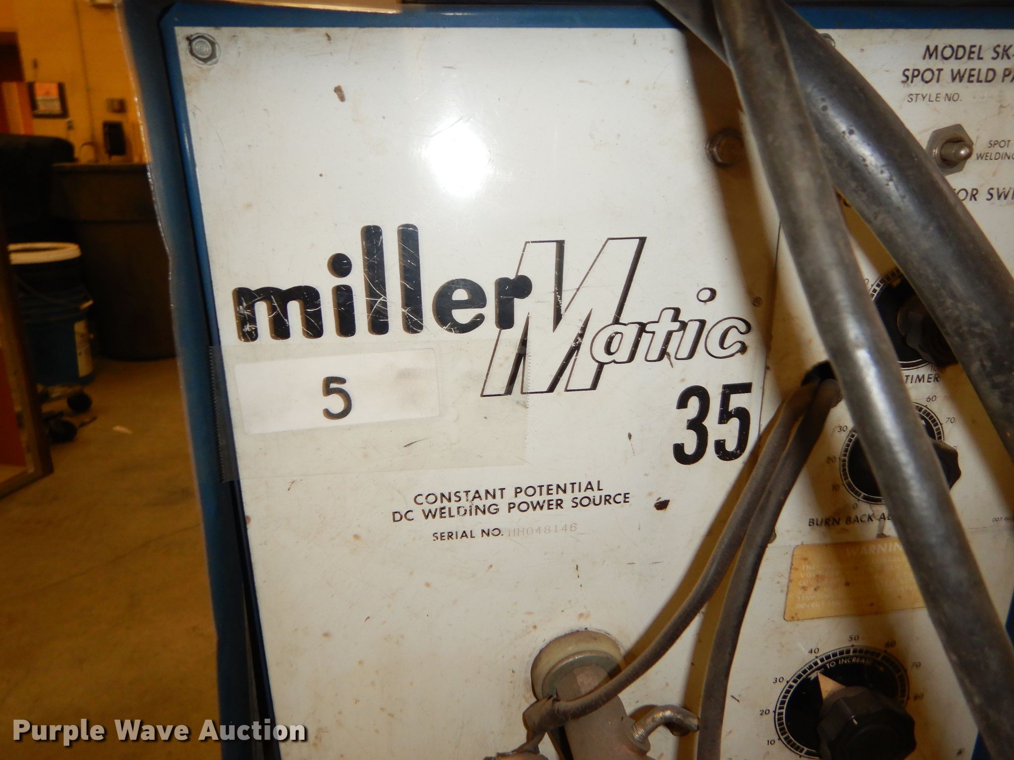 Purple Wave is selling a used Welder (Manual) in Kansas. This item is a Millermatic 35 mig welder with the following: 208/230V, Single phase, 60 percent duty cycle, Bottle not included, Serial HH048146