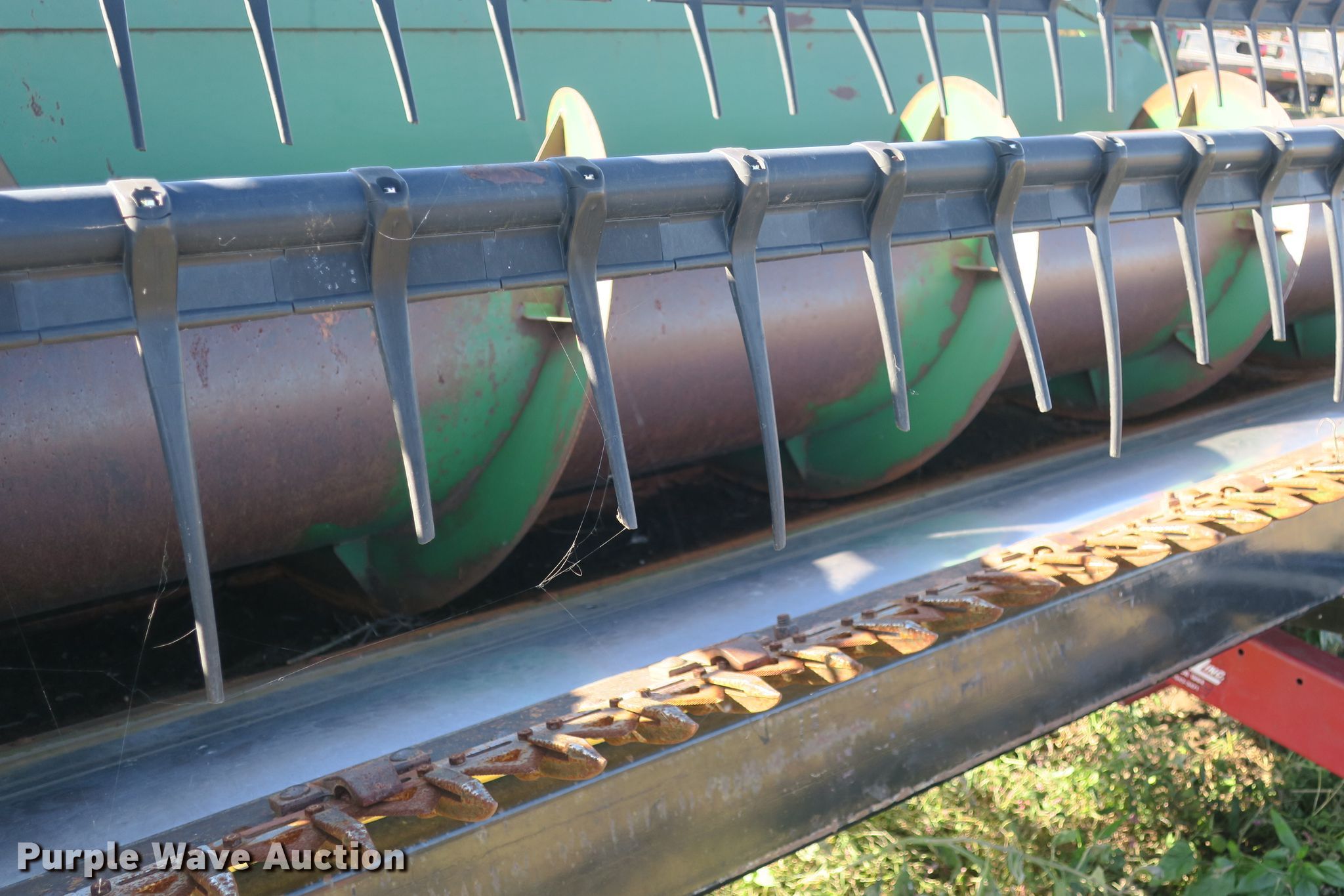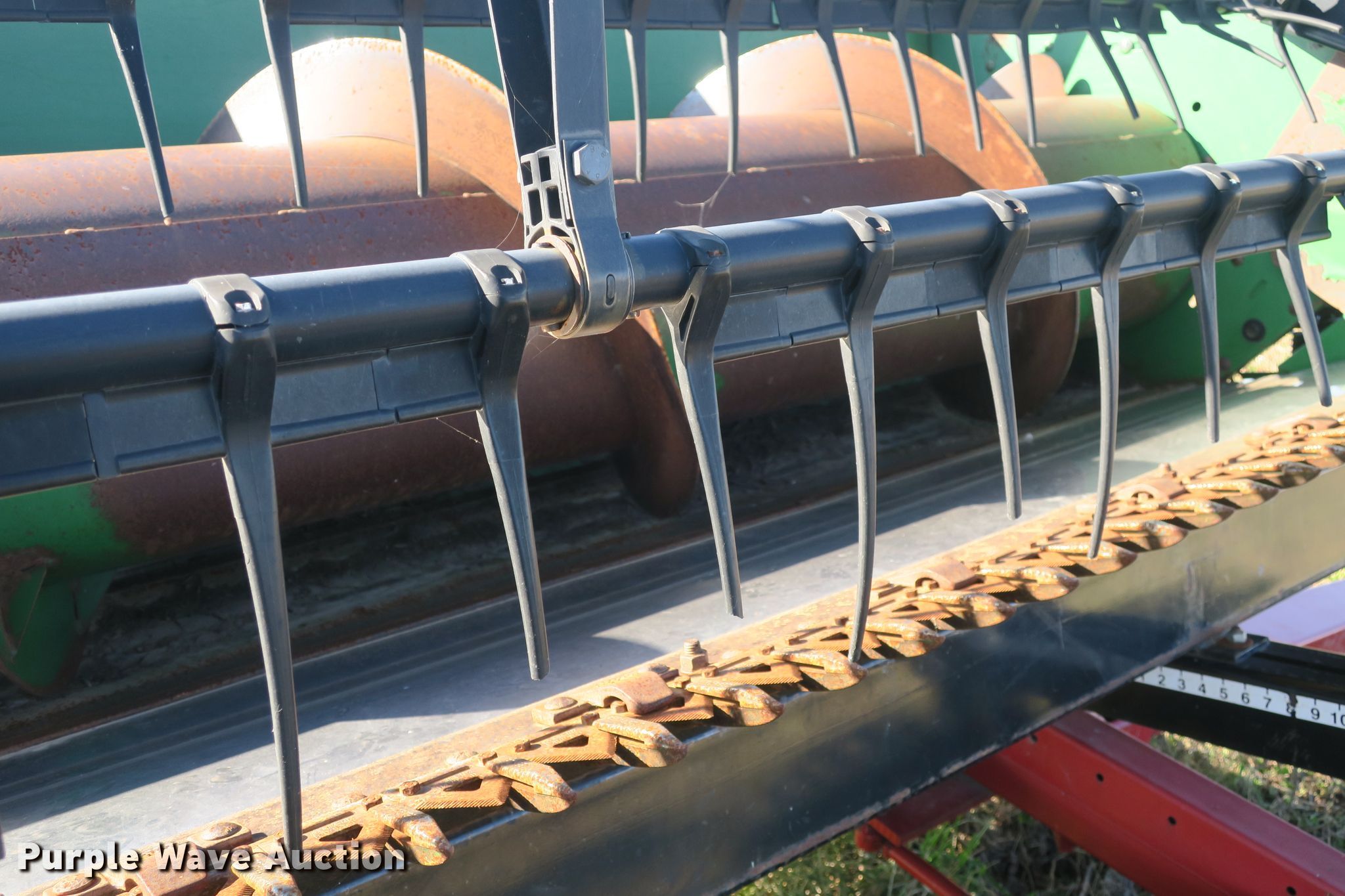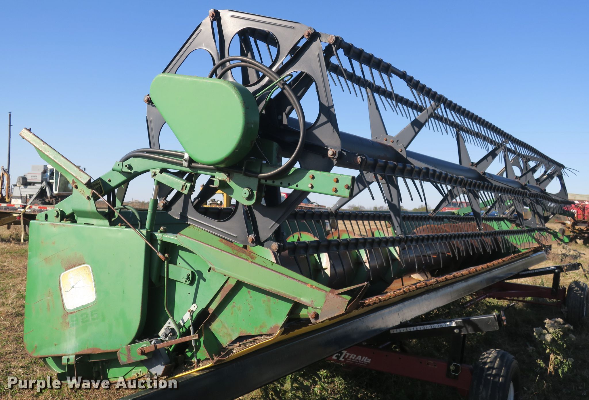 1992 John Deere 925 flex head. 25'W, Finger reel, Hydraulic fore/aft, Hydraulic reel height control, Poly skid plates, Trailer not included. Walker Springs Ranch. 452 Hwy 97. Lockwood, MO 65682