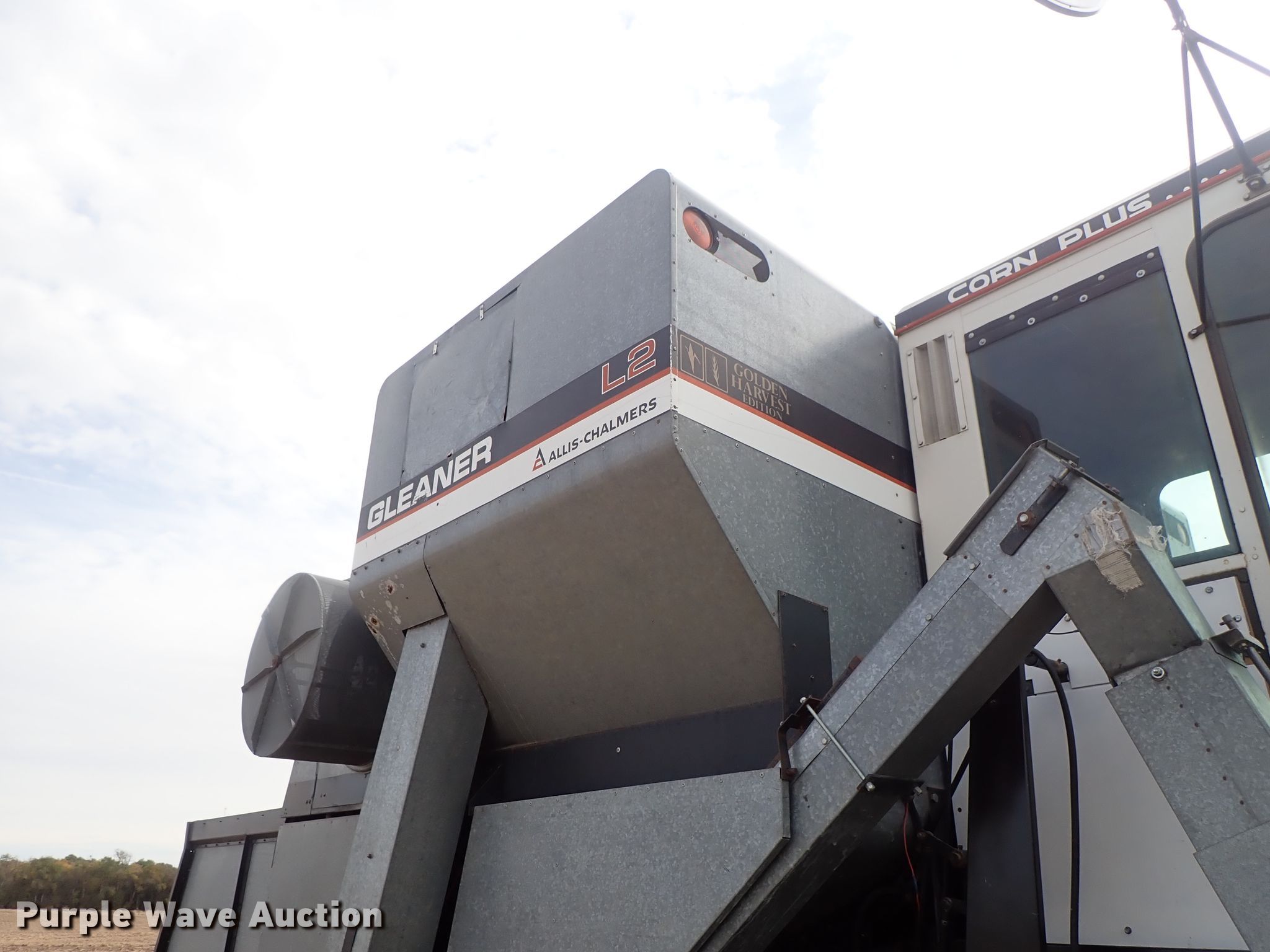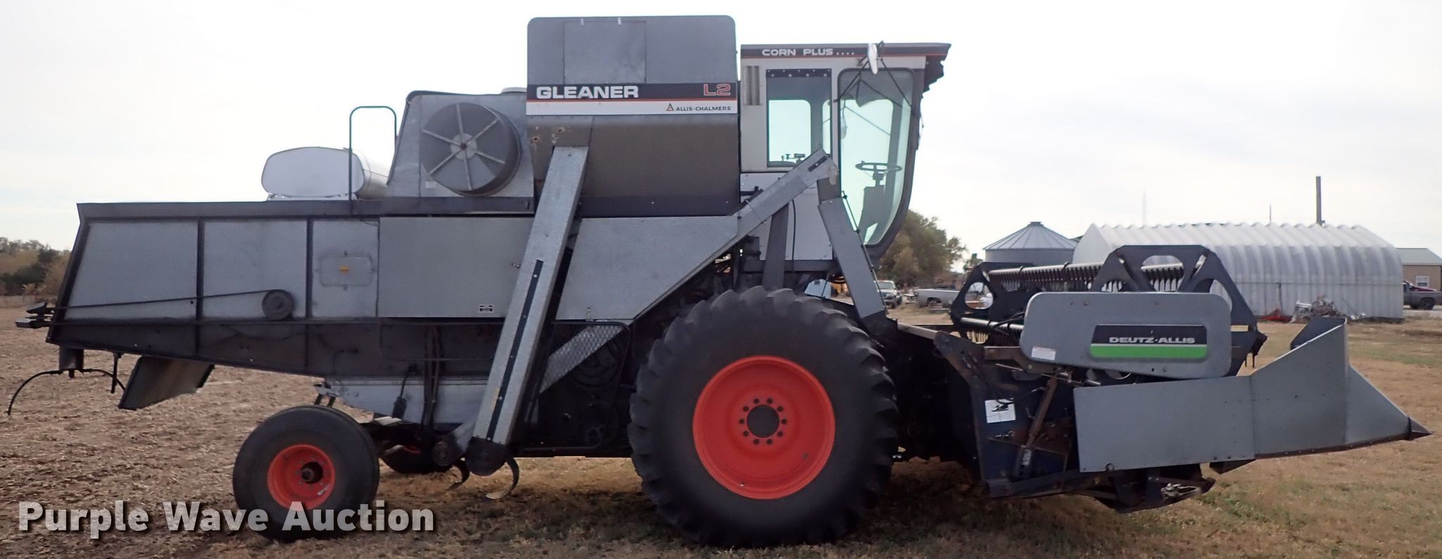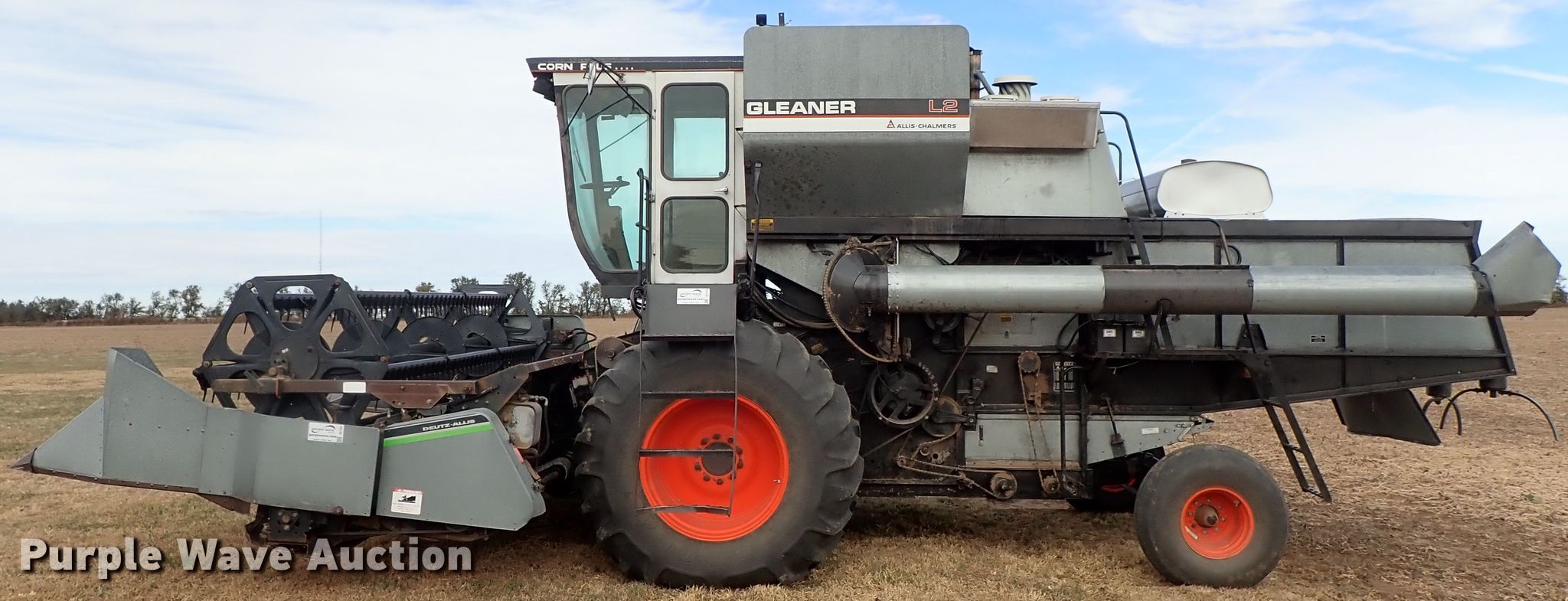 Purple Wave is selling a used Combine in Kansas. This item is a Gleaner L2 combine with the following: 845 engine hours on meter, 2,321 separator hours on meter, Six cylinder diesel engine, Hydrostatic transmission, Feederhouse, Variable speed, AC and heat, Chaff spreader, 14'L unloading auger, 23.1-34 front tires, 14L-16.1 rear tires, Head not included, Serial L-K24276H-GHF376