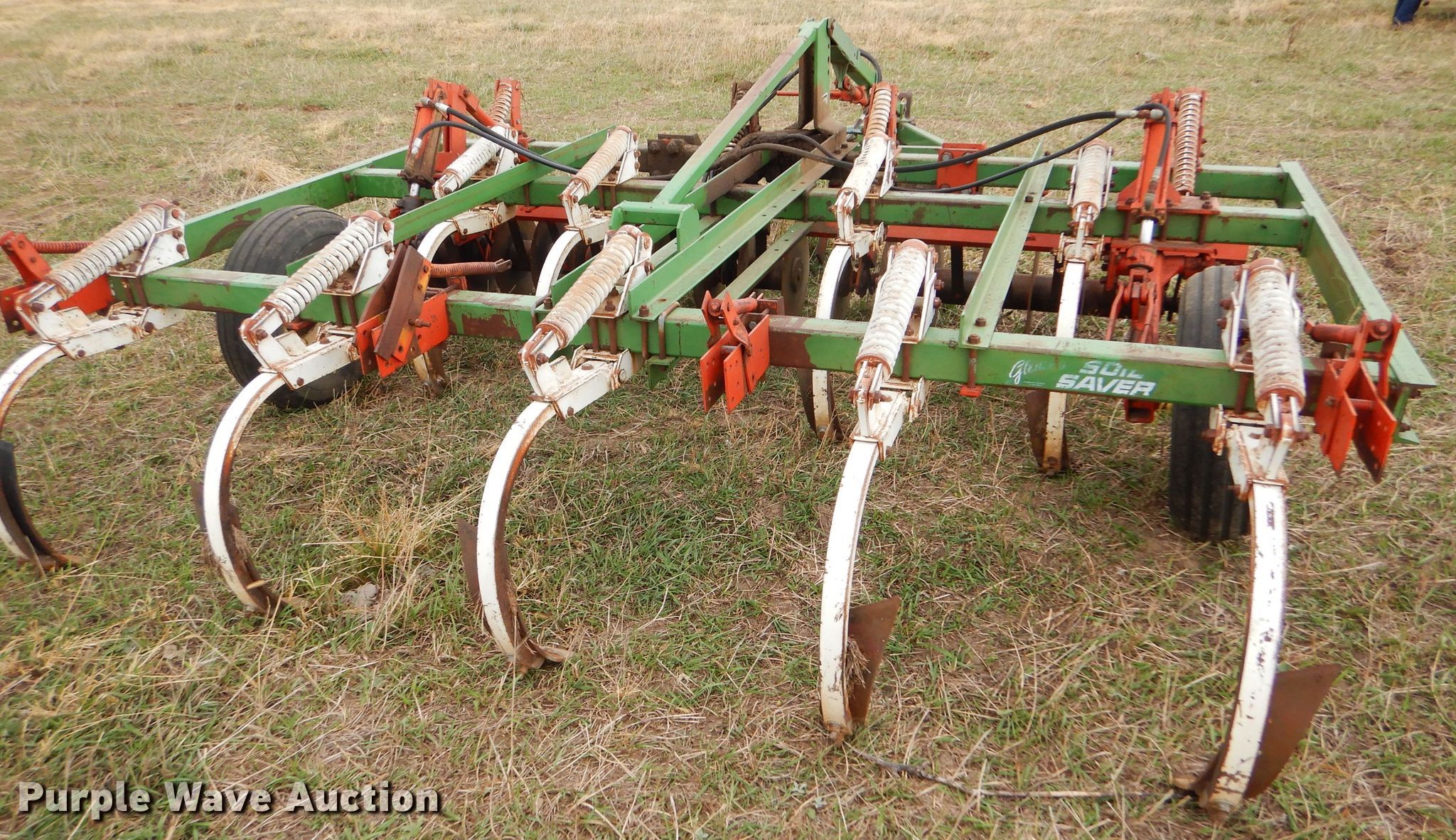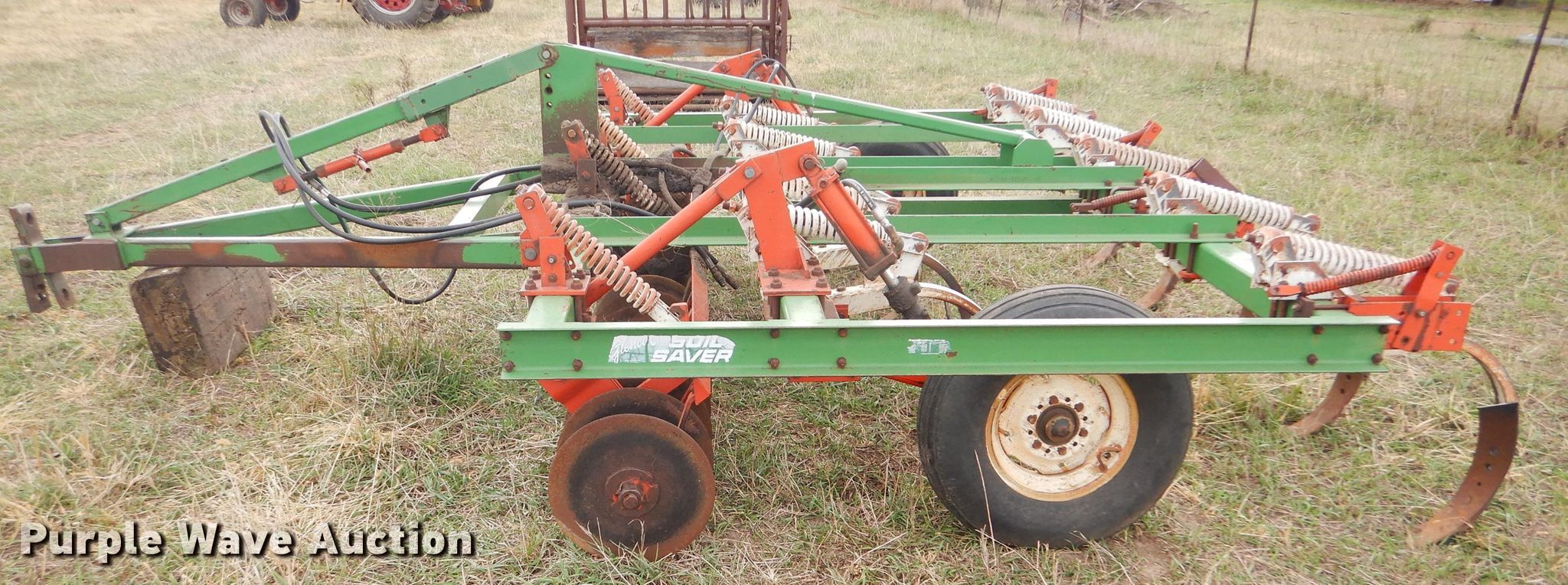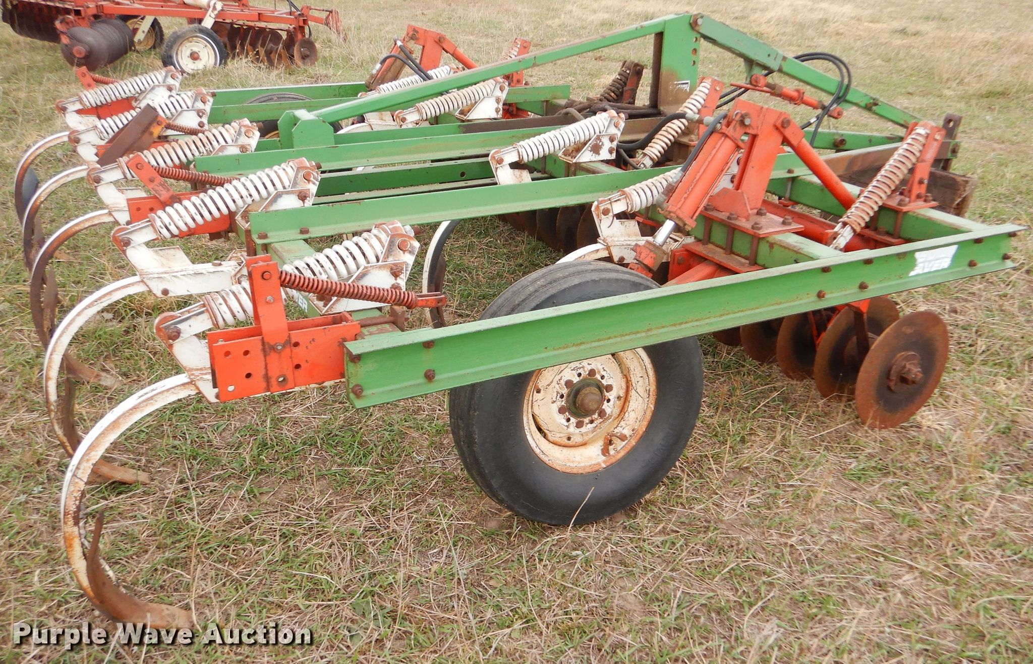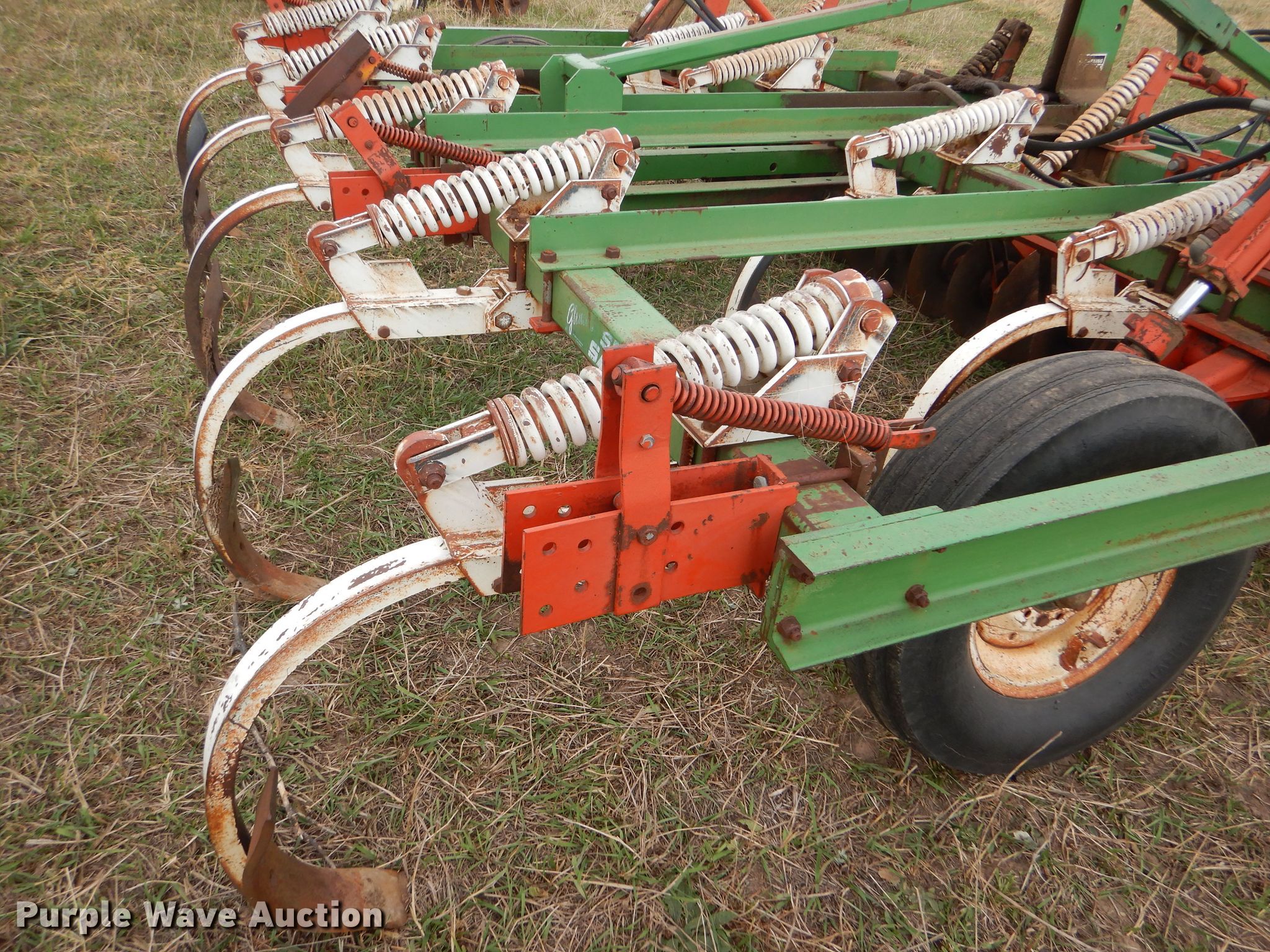 Purple Wave is selling a used Disk Ripper in Kansas. This item is a Glenco Soil Saver disk ripper with the following: 11'W, 17" diameter front disks, 8" spacing, (9) rippers, 15" spacing, 9.5L-15SL tires, Serial 153429