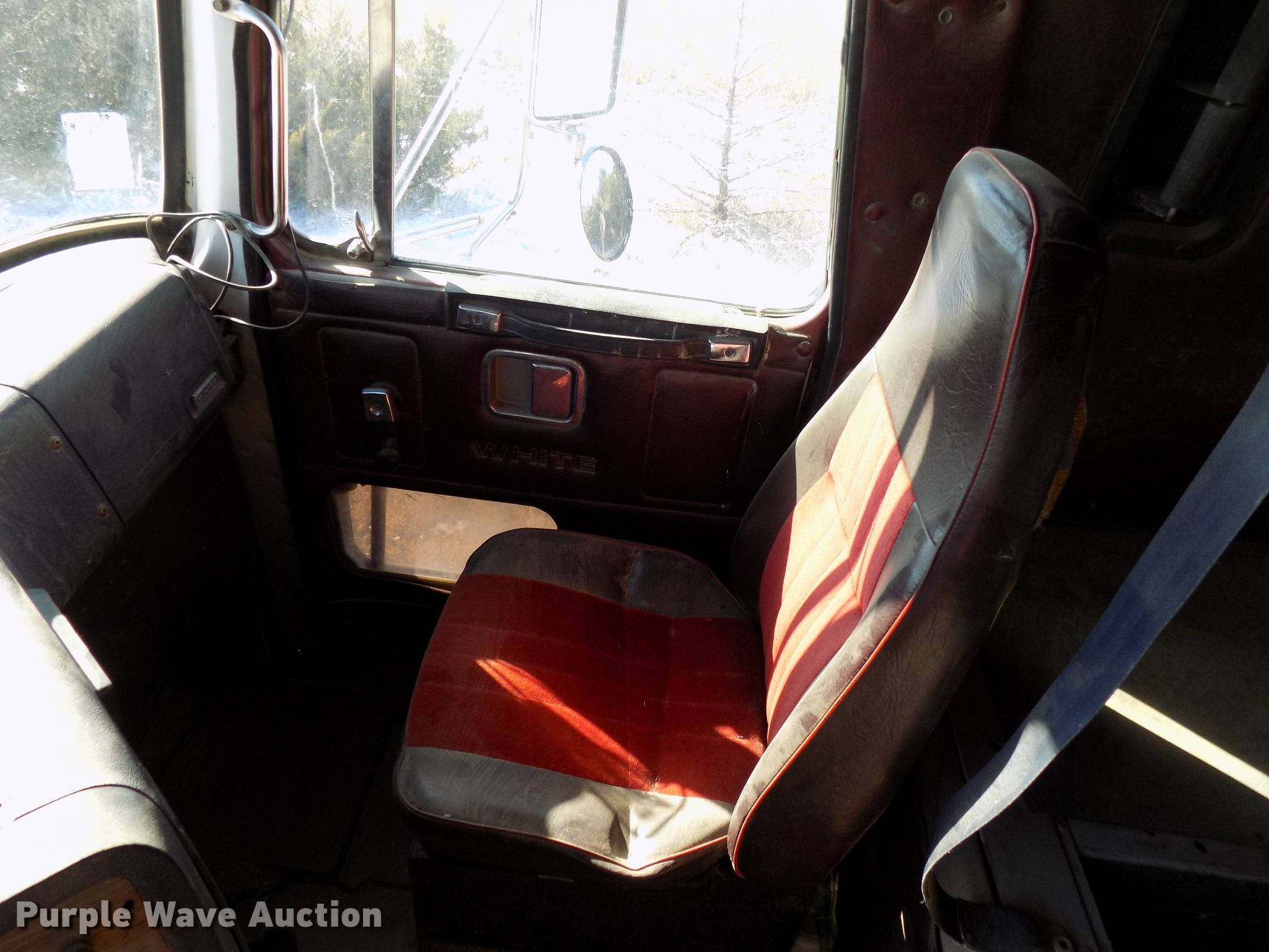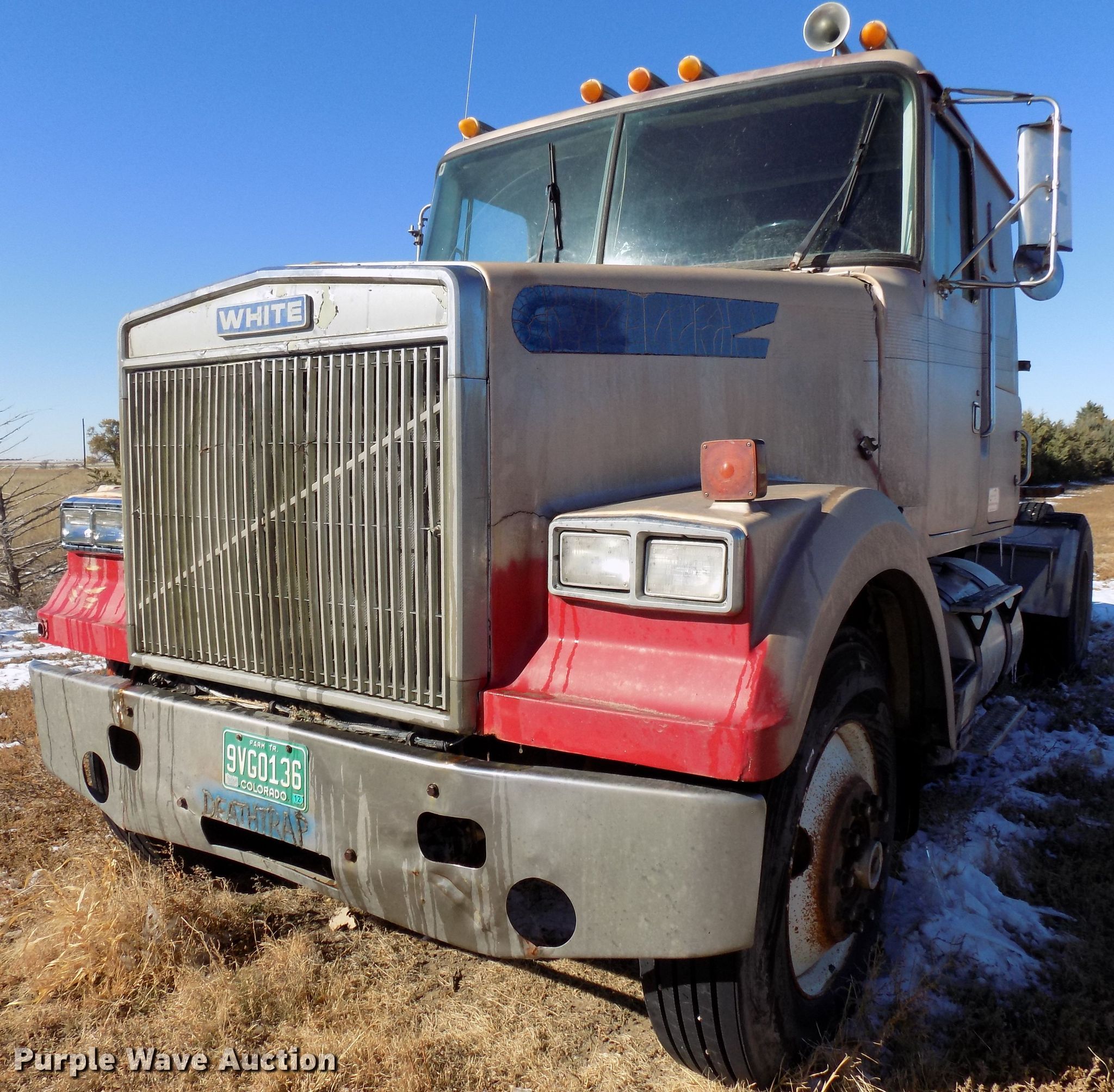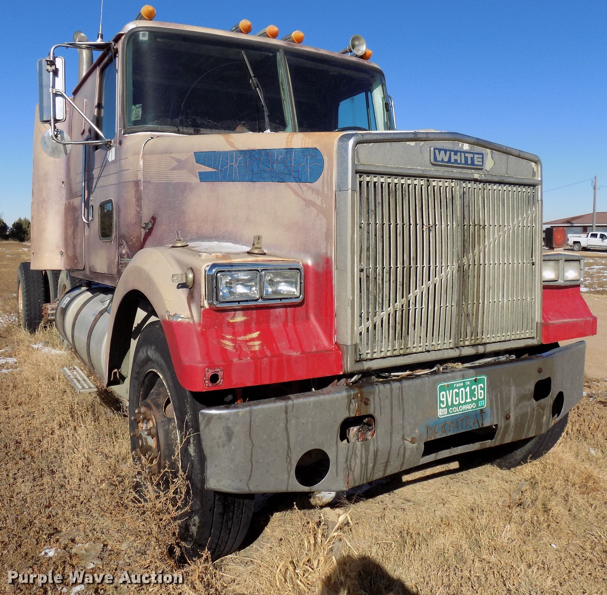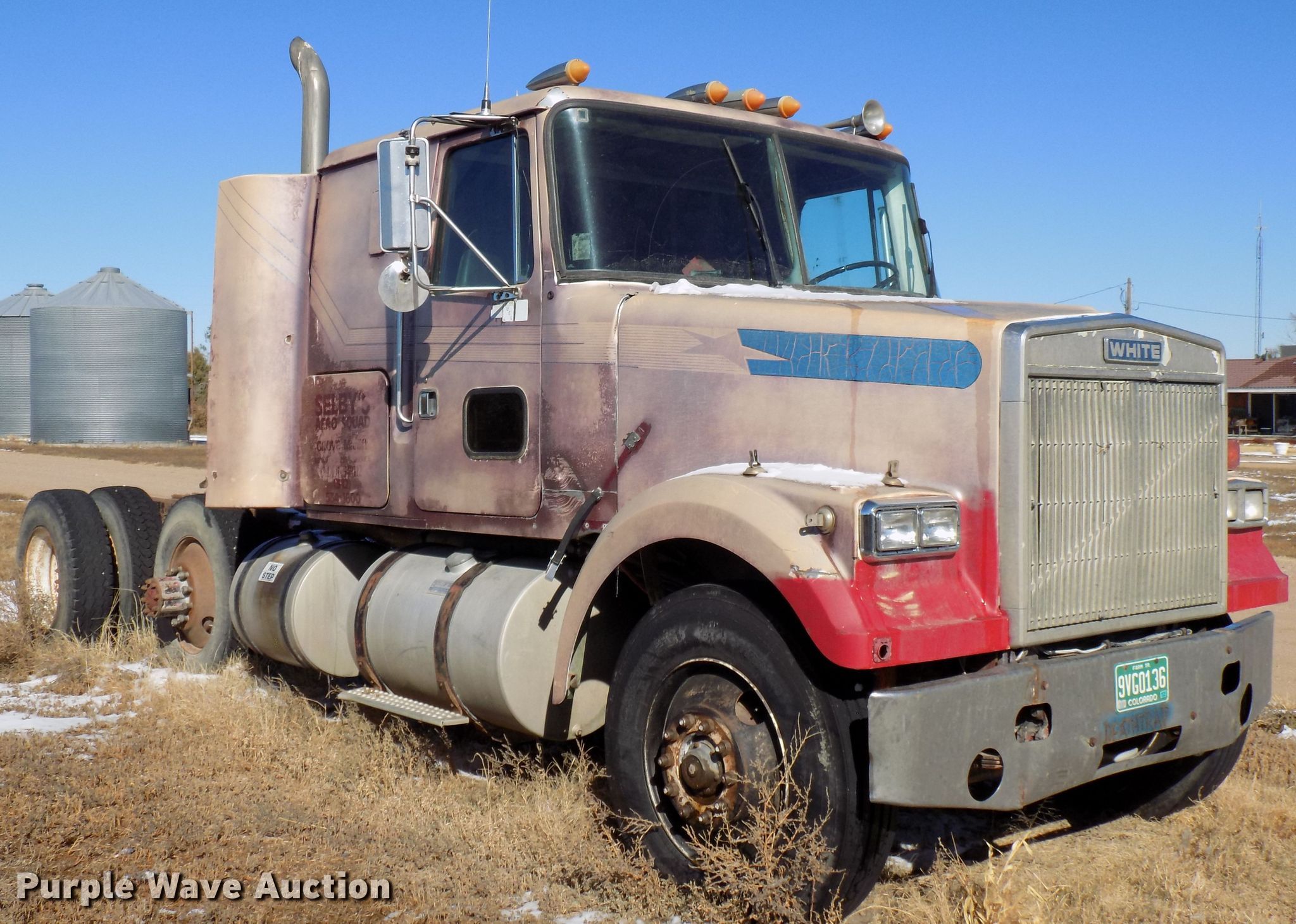 Purple Wave is selling a used Truck Tractor in Colorado. This item is a 1985 White WIM semi truck with the following: 133,566 miles on odometer, Caterpillar 3406 14.6L L6 diesel engine, Manual transmission, Tandem axle, Inter-axle differential lock, Sleeper, 36"L, PTO, Wet kit, Air operated sliding fifth wheel plate, Dual fuel tanks, Air suspension, Air brakes, 207" wheelbase, 11R24.5 tires, (2) tires missing, Non-operational clutch, Non-operational unit