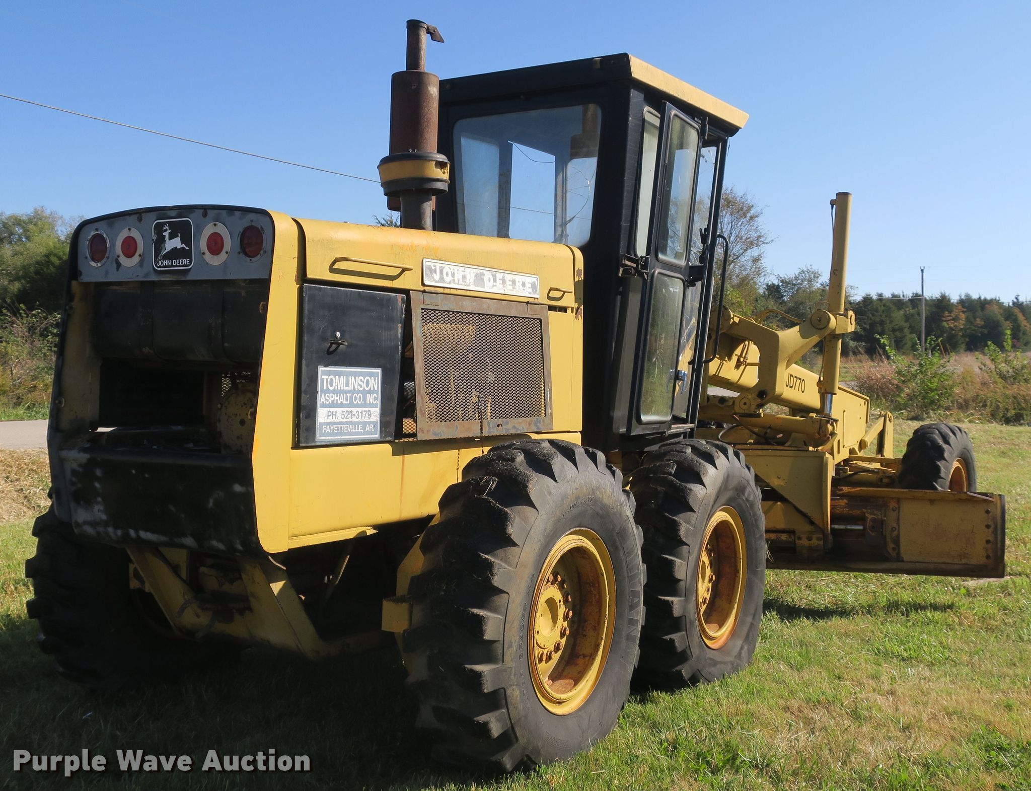 Purple Wave is selling a used Motor Grader in Missouri. This item is a 1976 John Deere 770 motor grader with the following: John Deere six cylinder diesel engine, Powershift transmission, 8F-4R gears, Differential lock, Enclosed cab, Heat, 14'L moldboard, Right blade extension, Tip control, Side shift, Front mounted lift group, 14.00-24 tires, Engine smokes, Hydraulic leak on blade control, Serial 003973T