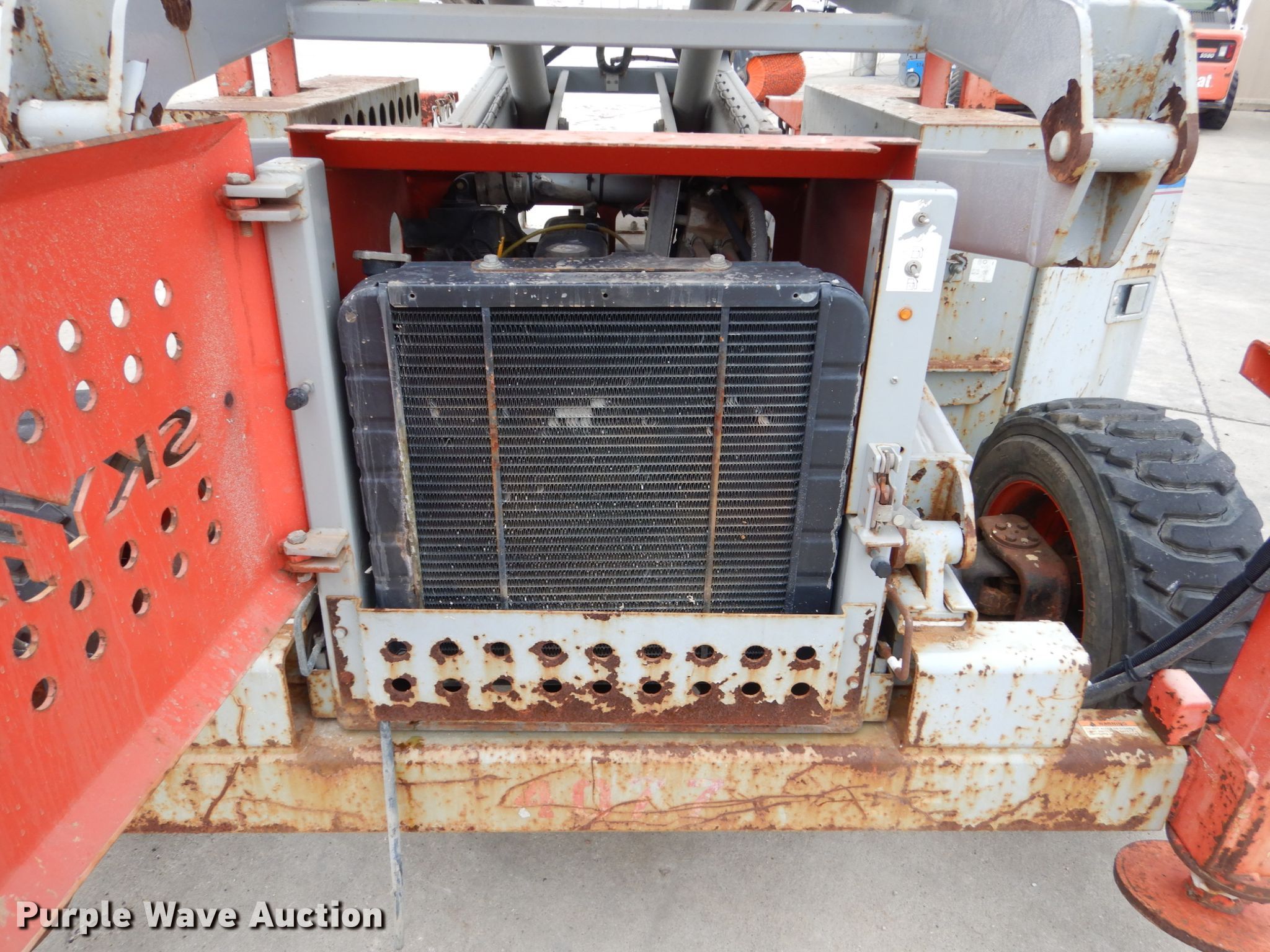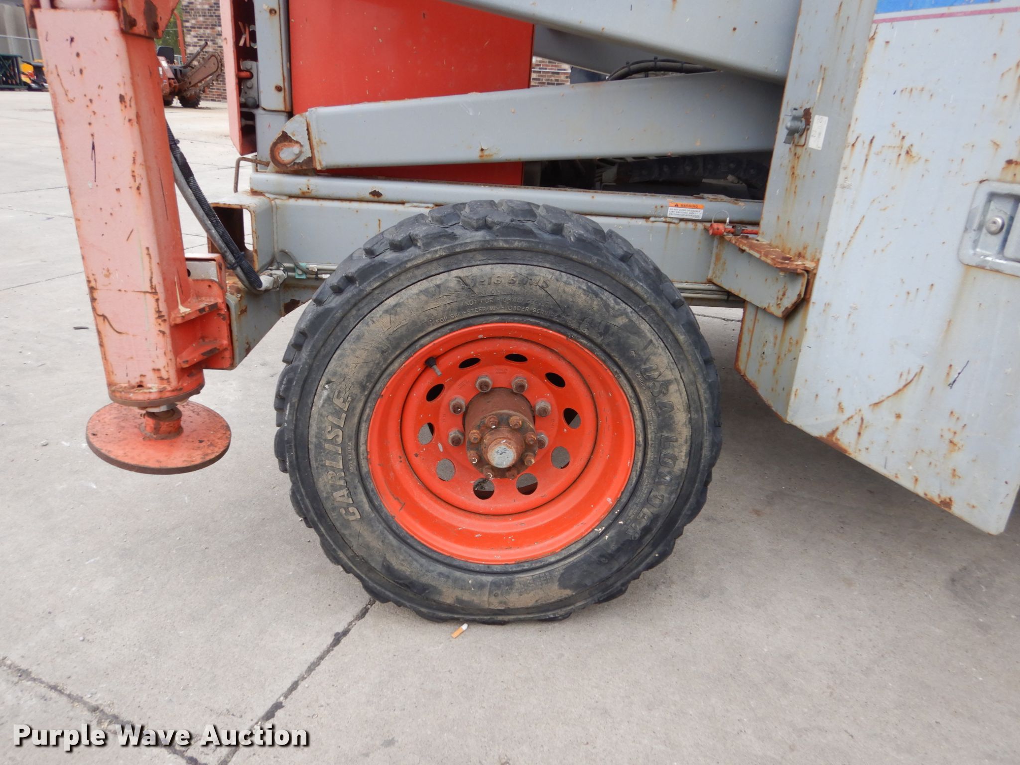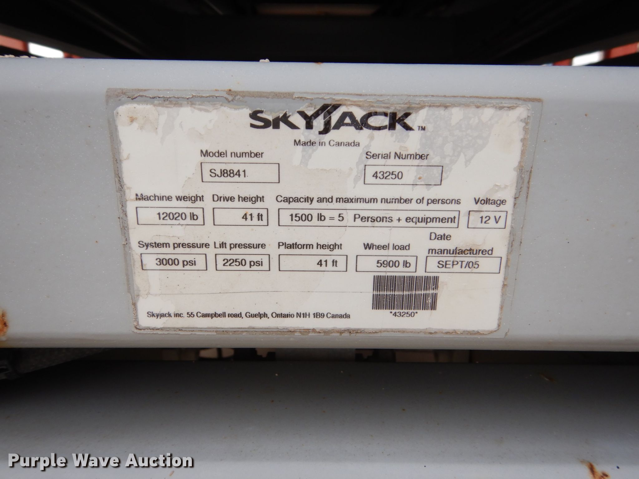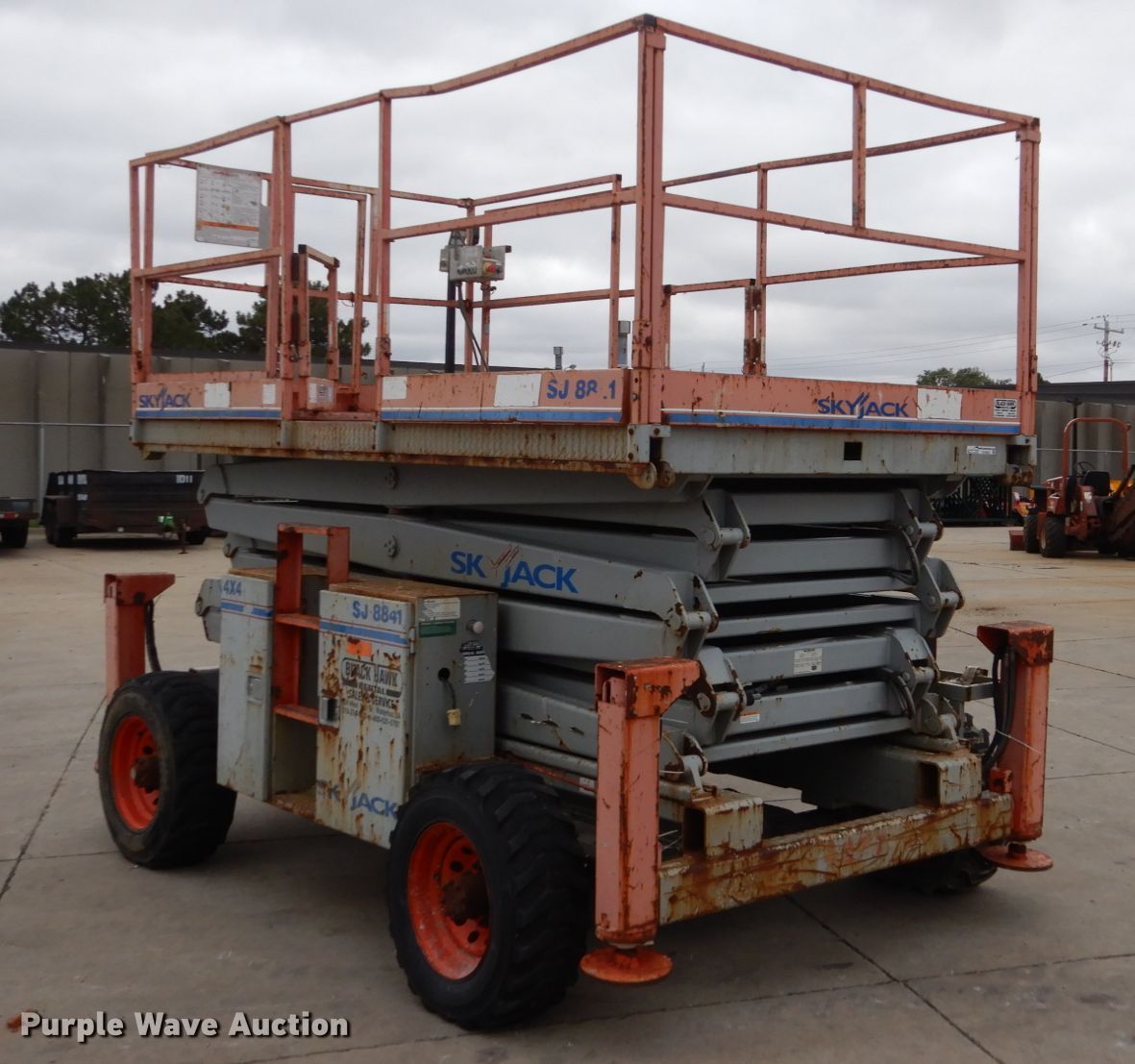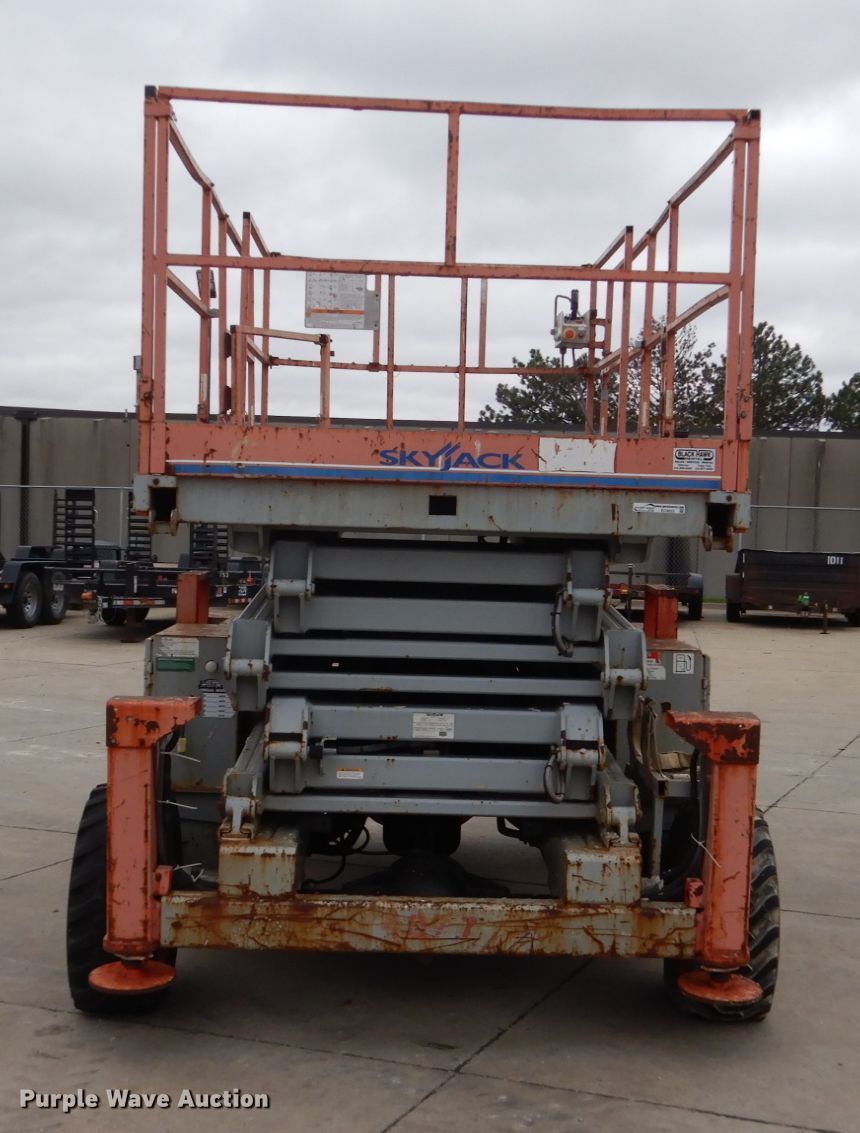 Purple Wave is selling a used Scissor or Vertical Lift in Iowa. This item is a Sky Jack SJ8841 scissor lift with the following: 2,113 hours on meter, Nissan two cylinder dual fuel engine, Gas and propane capable, Four wheel drive, 1,500 lbs maximum lift capacity, 41' maximum lift height, 136"L x 70"W platform, Manual platform extensions, Platform and ground controls, 10-16.5 tires, Outriggers will not lift up