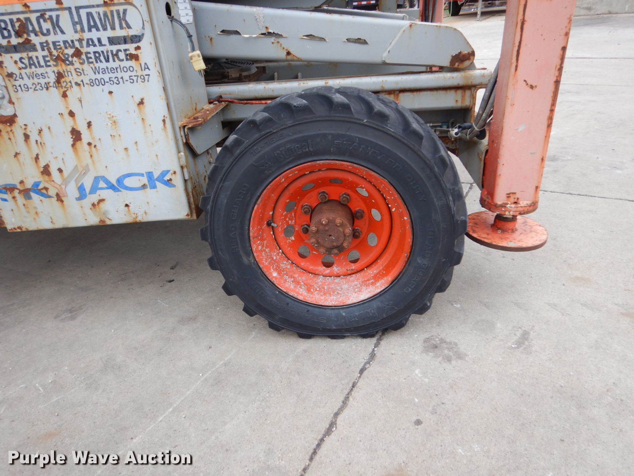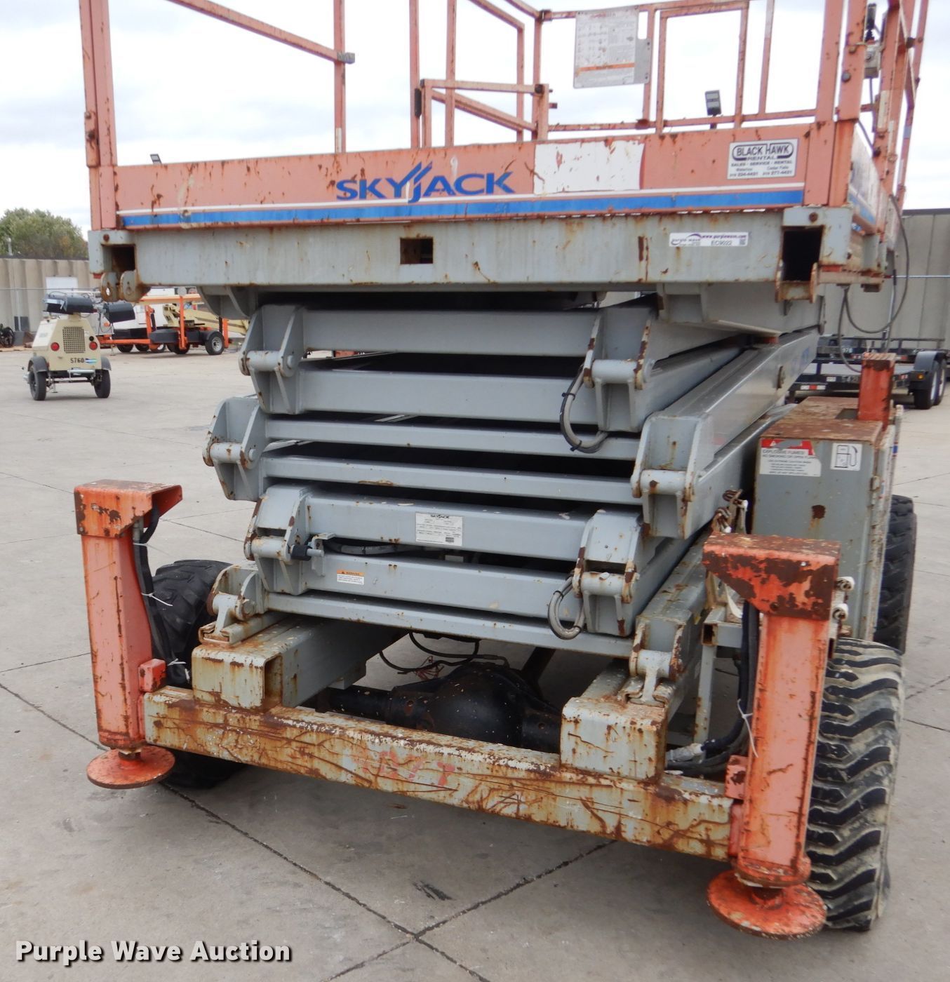 Sky Jack SJ8841 scissor lift. 2,113 hours on meter, Nissan two cylinder dual fuel engine Gas and propane capable, Four wheel drive, 1,500 lbs maximum lift capacity, 41' maximum lift height, 136"L x 70"W platform Manual platform extensions, Platform and ground controls, 10-16.5 tires, Outriggers will not lift up. Black Hawk Rental, Sales & Service. 4325 University Ave. Cedar Falls, IA 50613