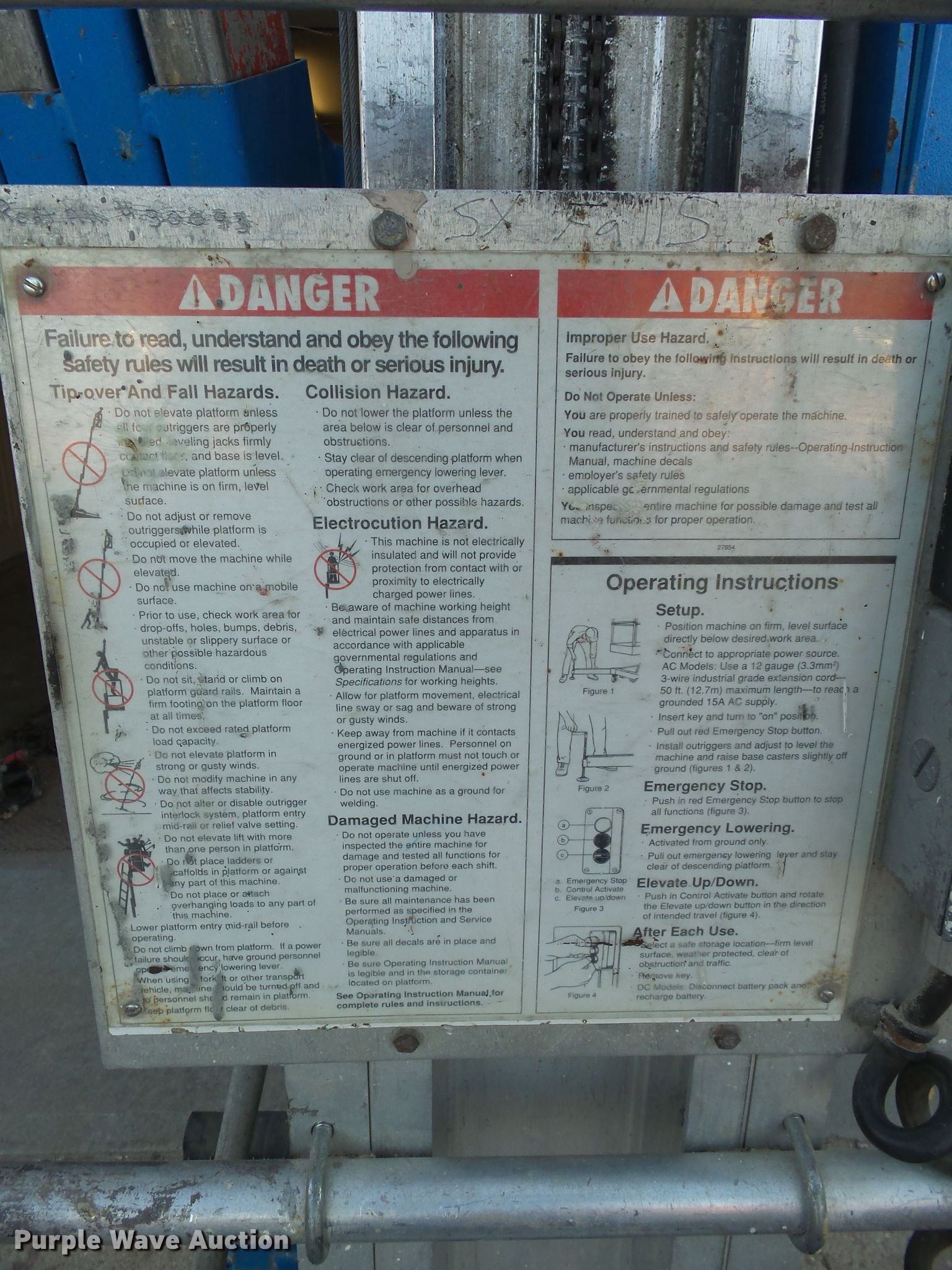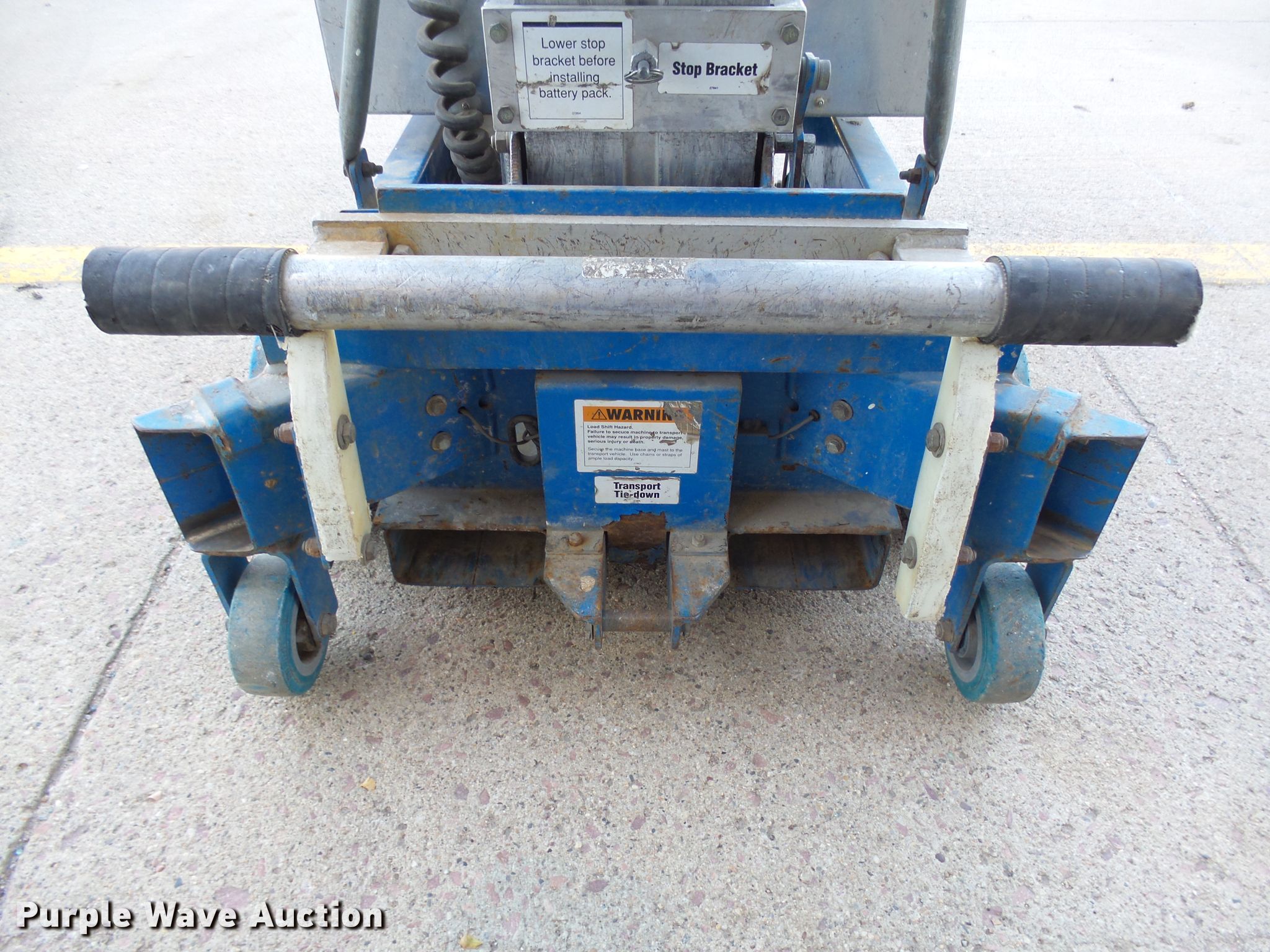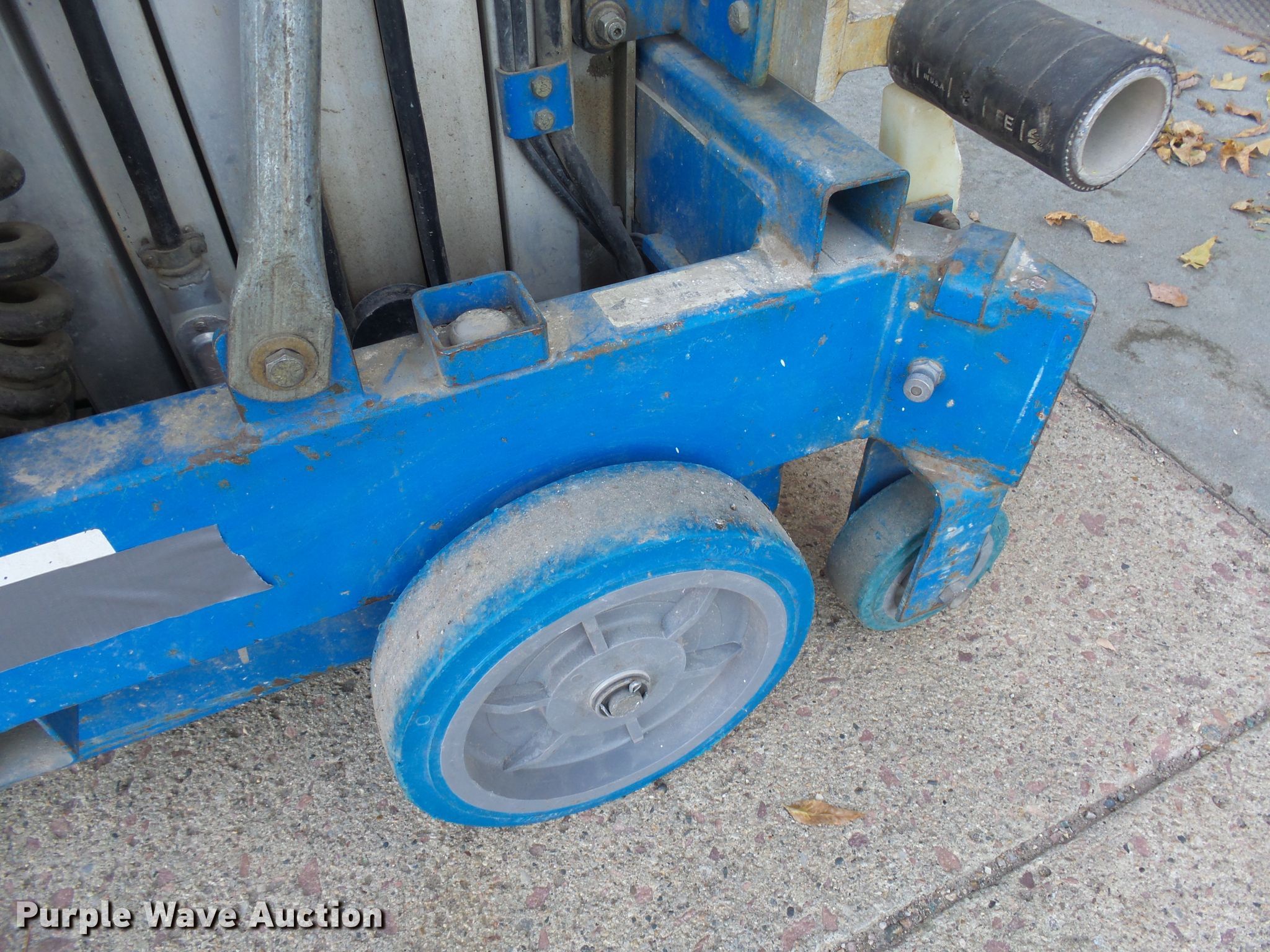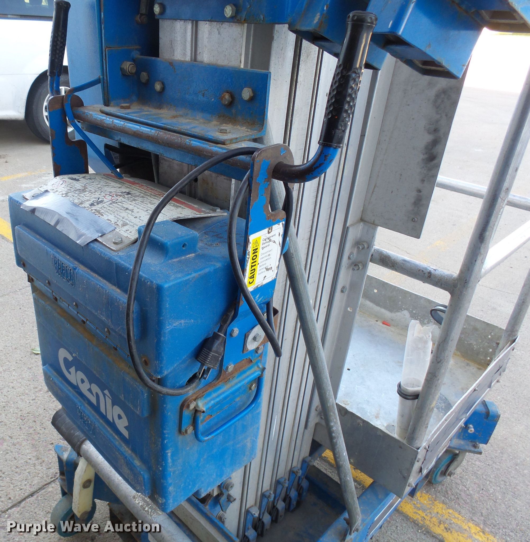 Purple Wave is selling a used Scissor or Vertical Lift in South Dakota. This item is a Genie AWP24 vertical lift with the following: 300 lbs maximum lift capacity, 24' maximum lift height, 26"L x 26"W platform, AC power outlet, Platform controls, Manual platform extensions, Serial 38922099